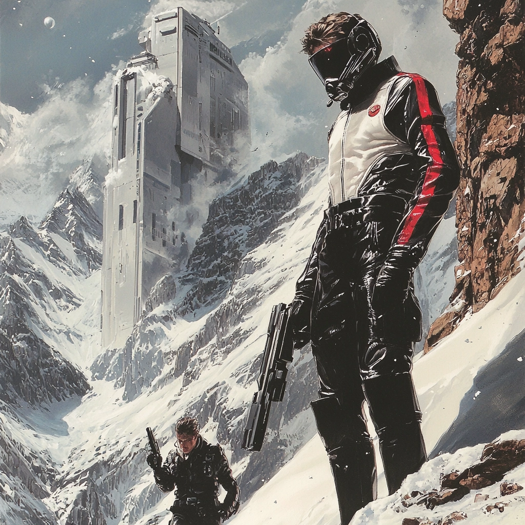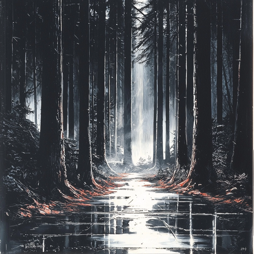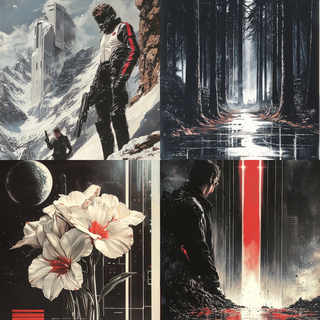 The sharp interplay of dark and light areas highlights details, enhancing depth and dimension. The use of red punctuates scenes, drawing focus, while the textures vary from smooth surfaces to rugged terrains, enriching the visual tapestry.