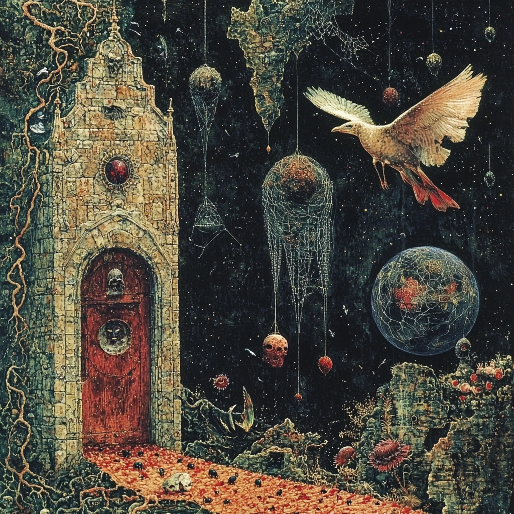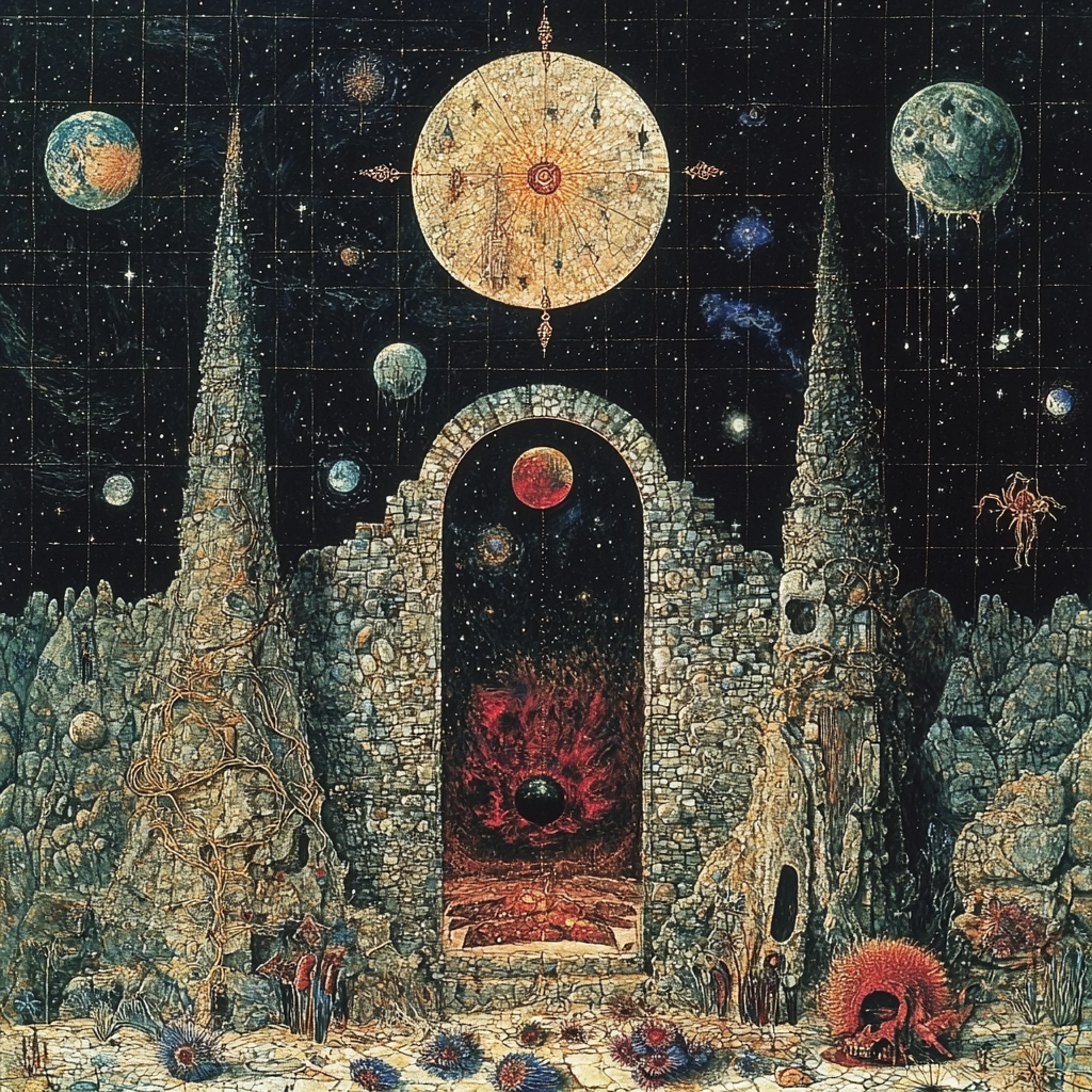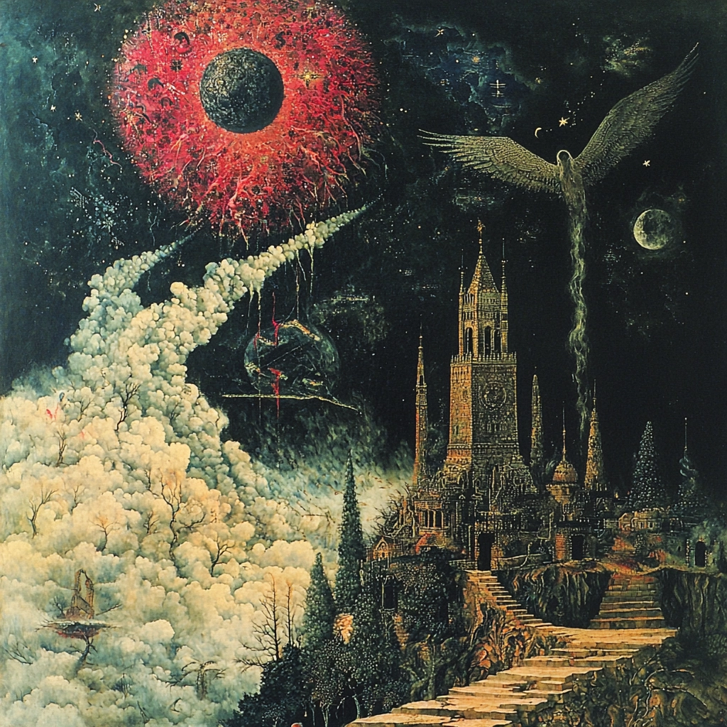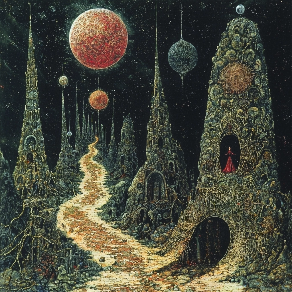 The use of deep shadows contrasts with intricate, finely detailed forms, creating a sense of immense scale and complexity. Color transitions imbue the scenes with a textured, almost tactile quality.
