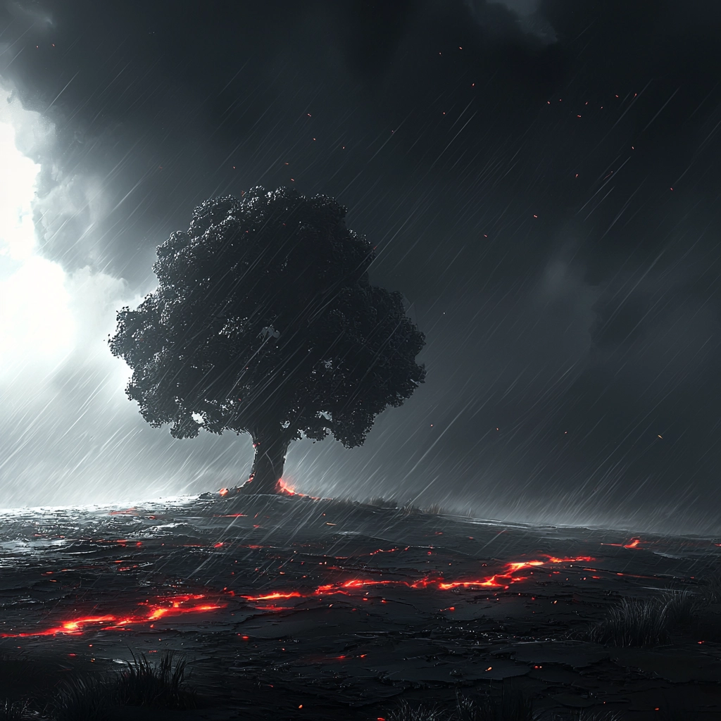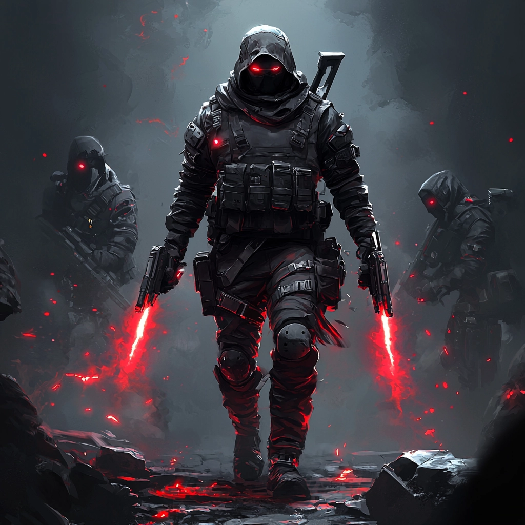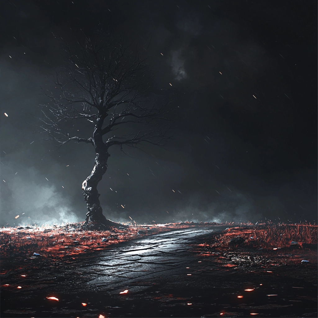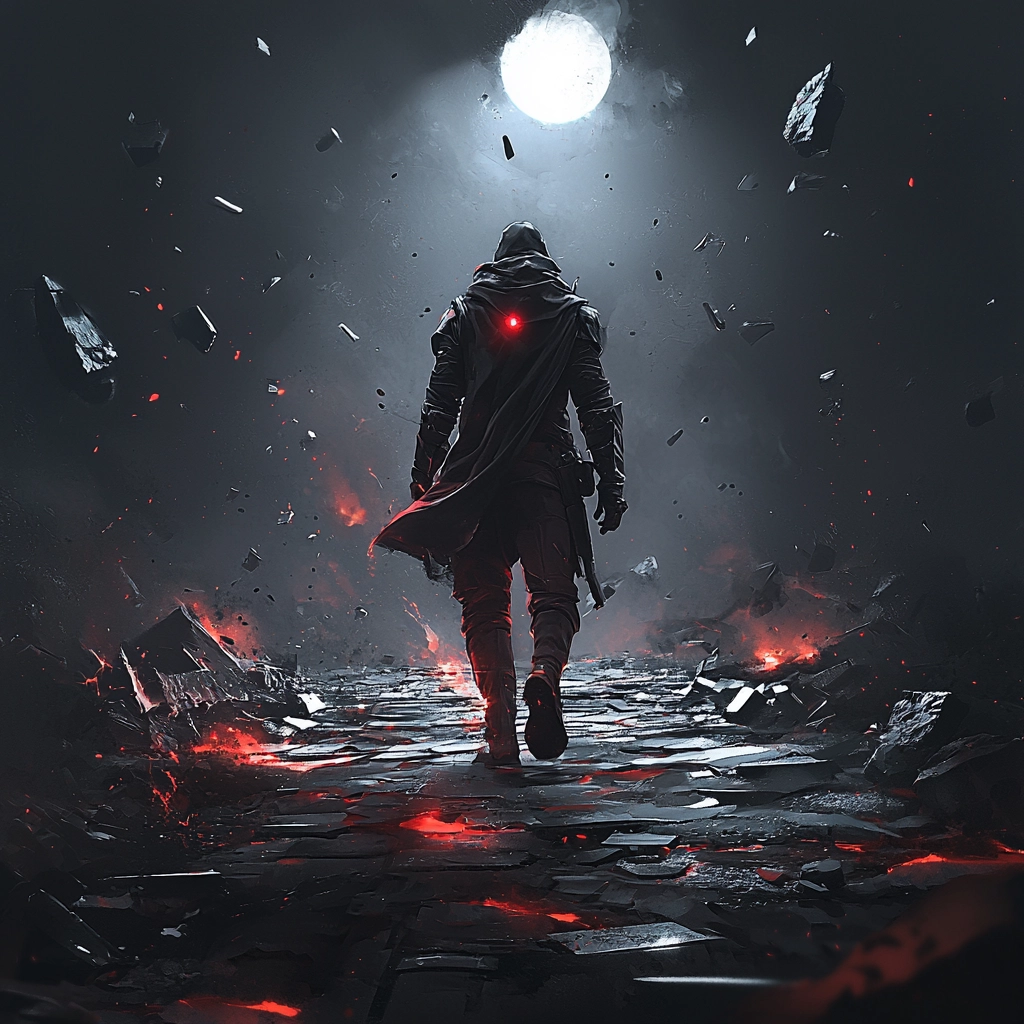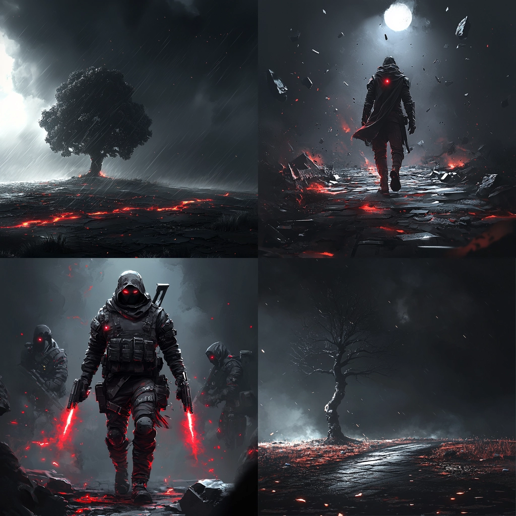 Intense dark tones with striking red highlights and meticulous gray contrasts create a sense of depth and movement.