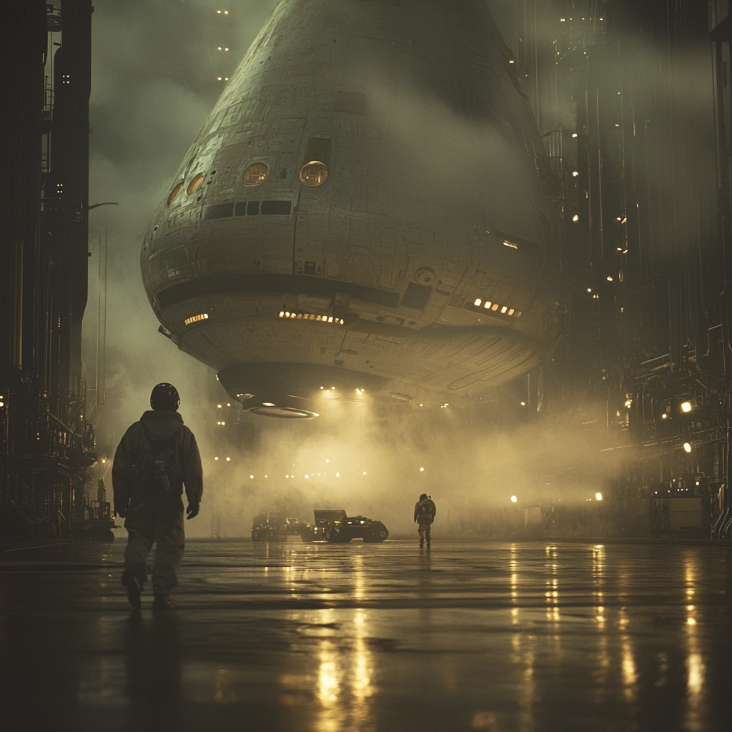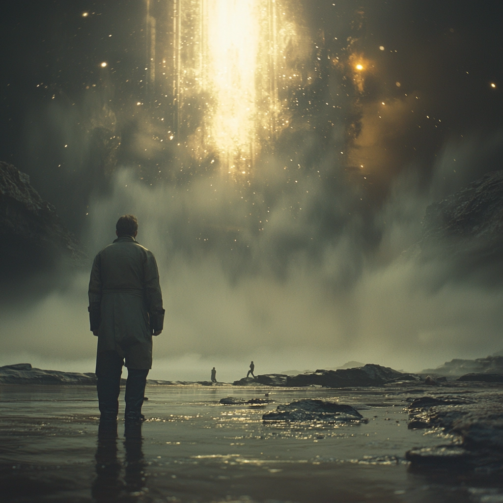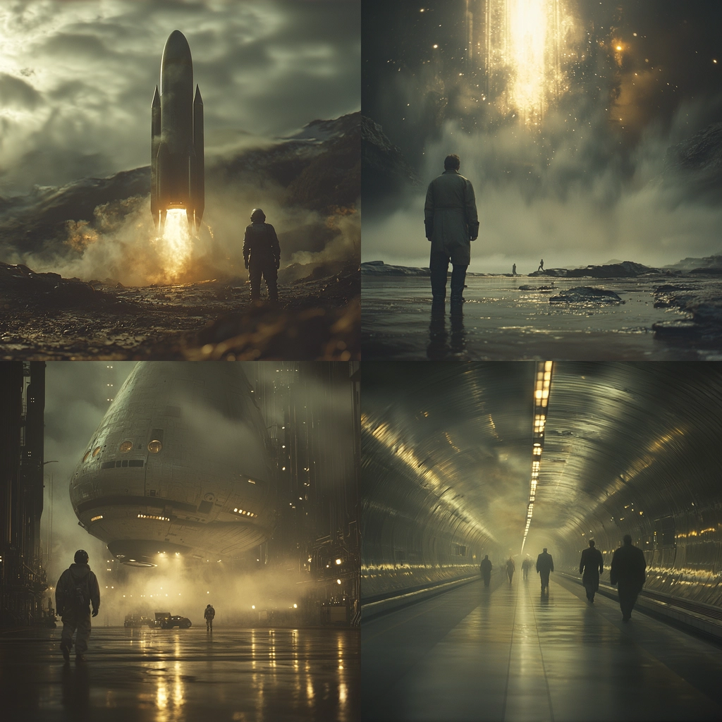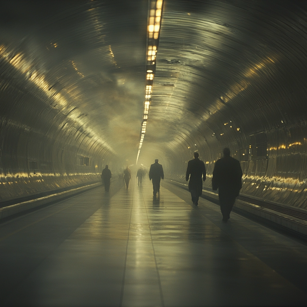 The lighting creates dynamic contrasts against the dark palette, while the textures are smooth with occasional sharp edges that emphasize depth. A sense of infinite space is developed through the use of light and shadow, creating a multidimensional effect.