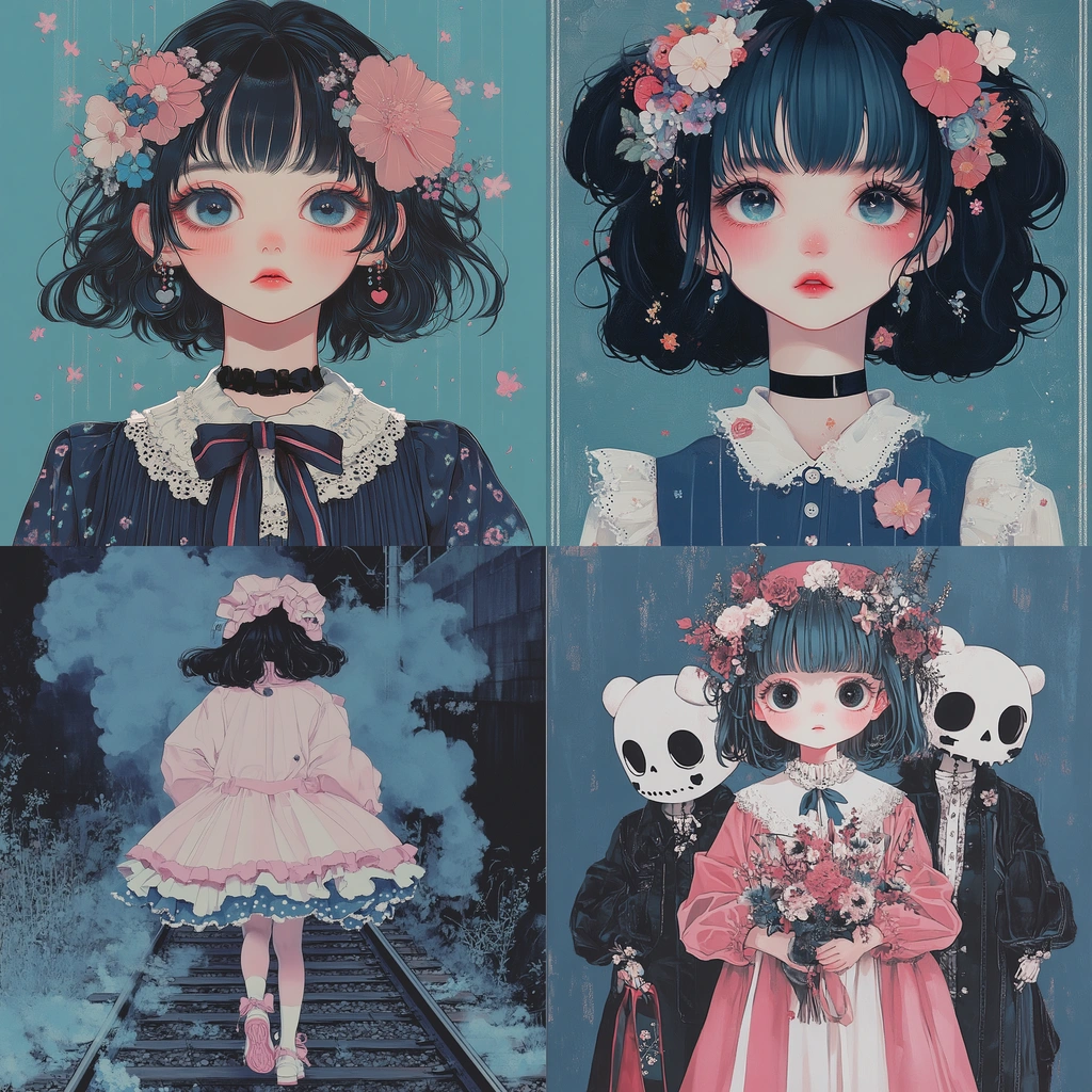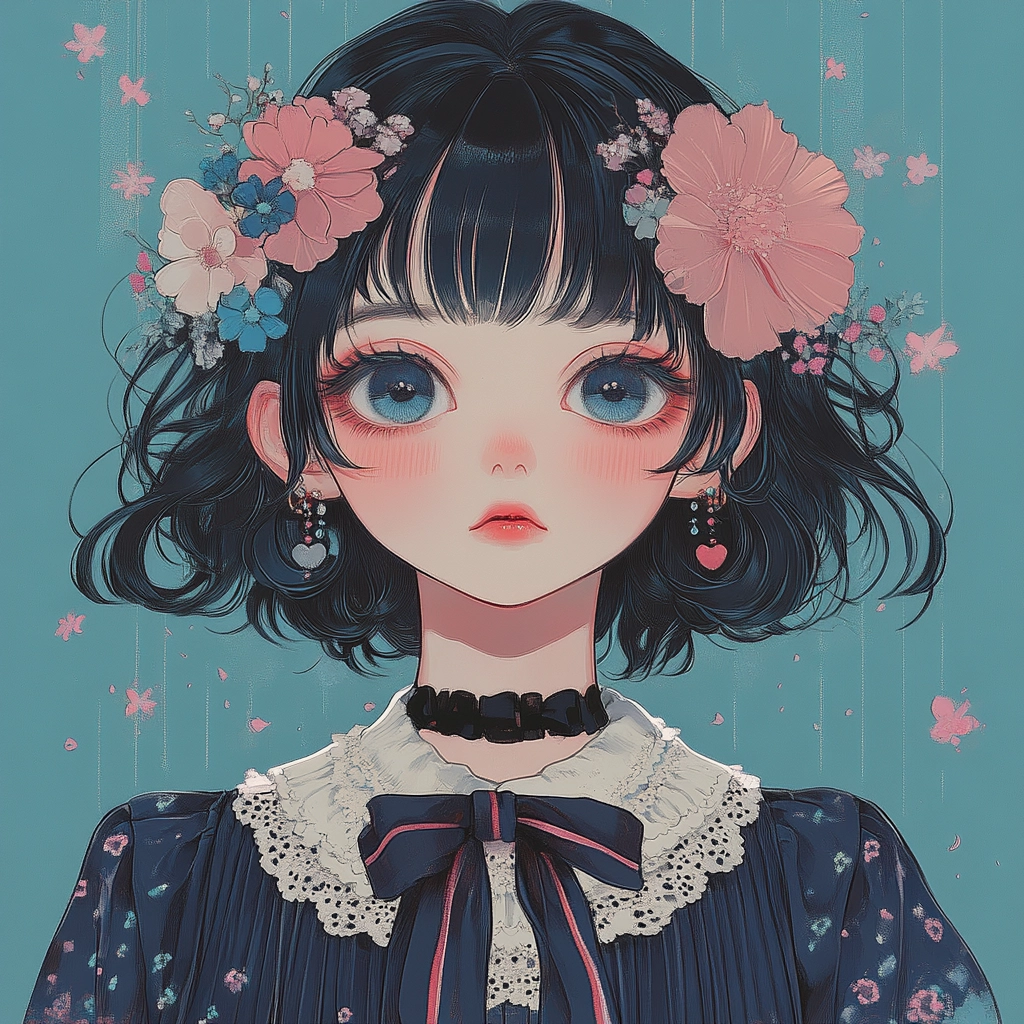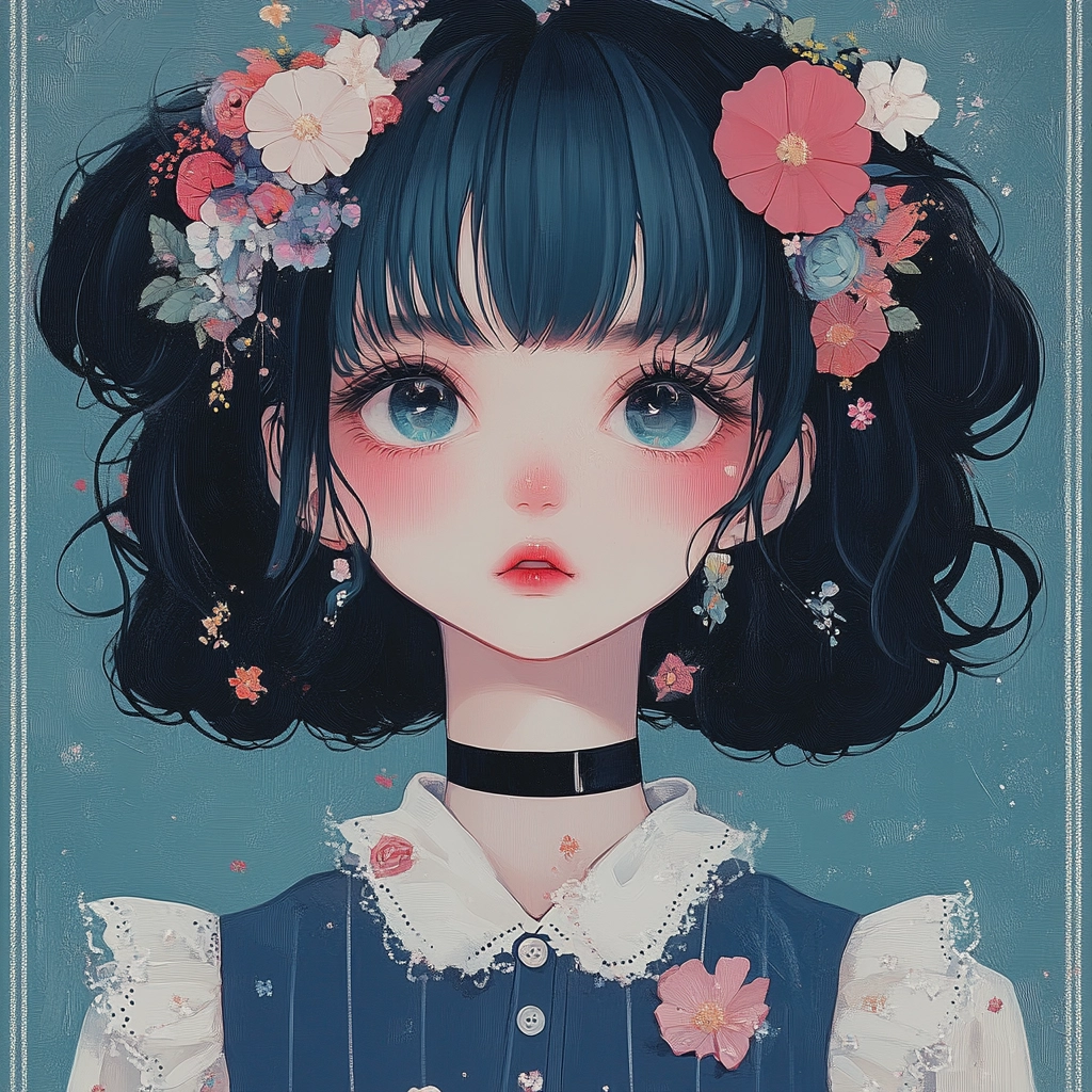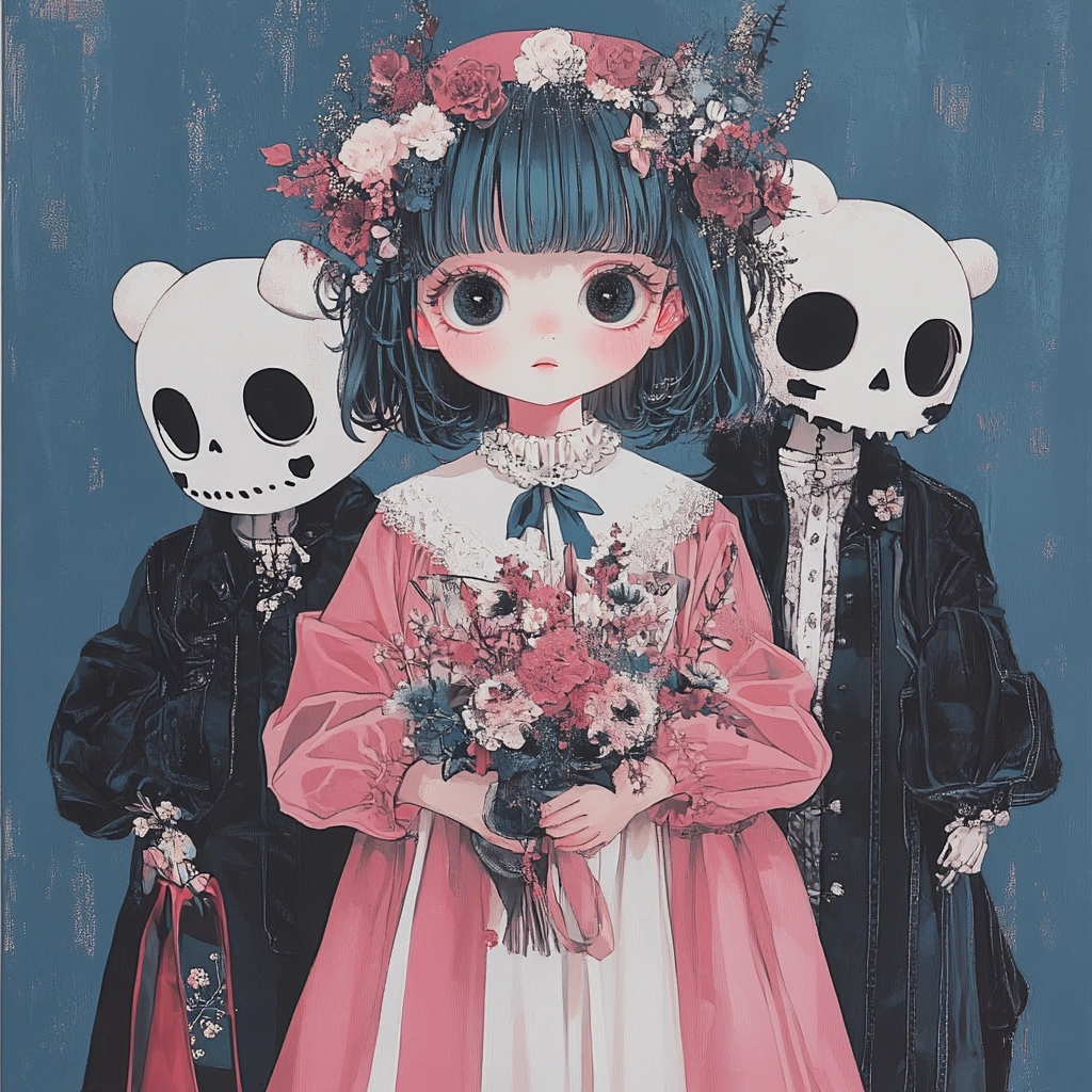 Soft, diffused lighting complements intricate floral details and dark clothing, with a deep color palette creating a sense of depth and contrast. Textures are smooth yet detailed.