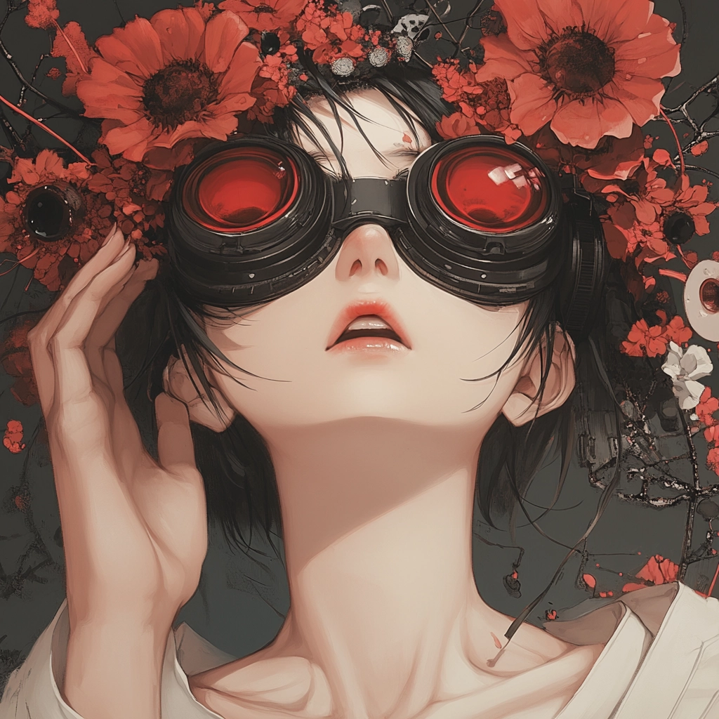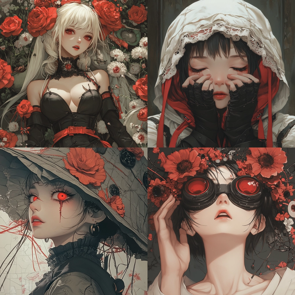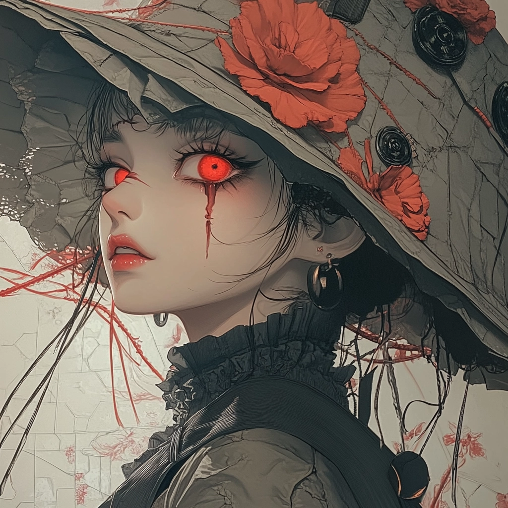 Lighting effects highlight the intricate details and enhance the depth of the composition. Colors exhibit high contrast between dark hues and vibrant reds. Spatial sense created through detailed backgrounds and layered textures, adding complexity and depth.