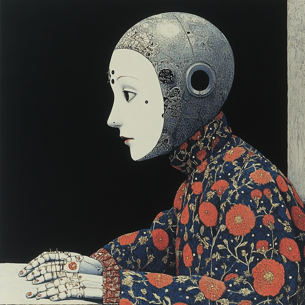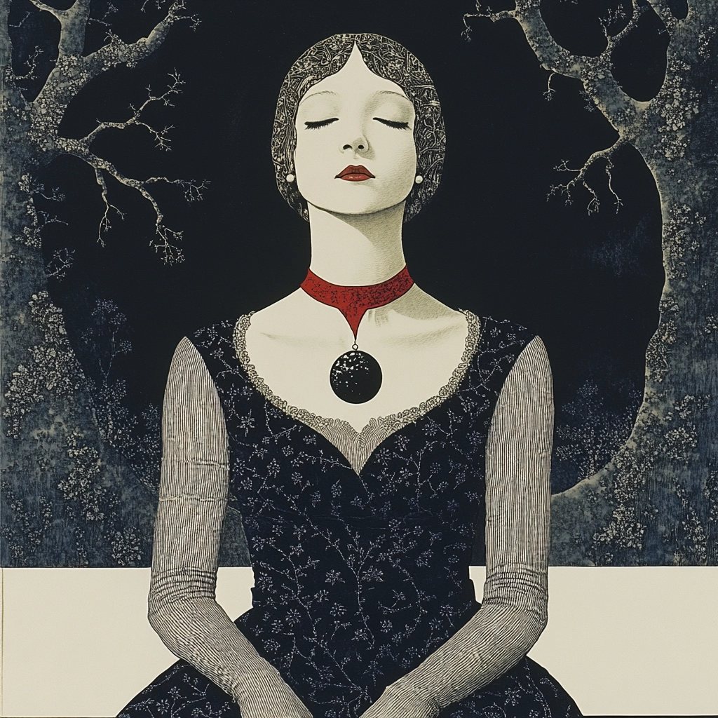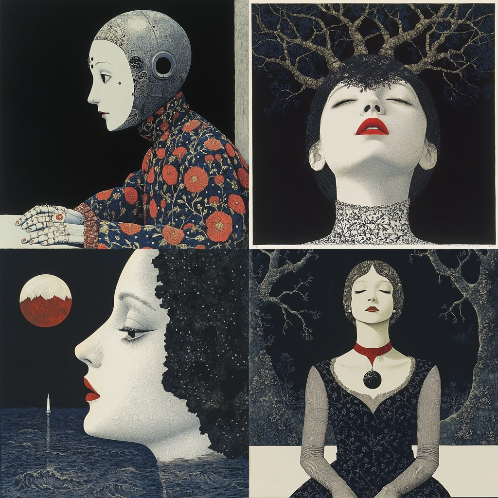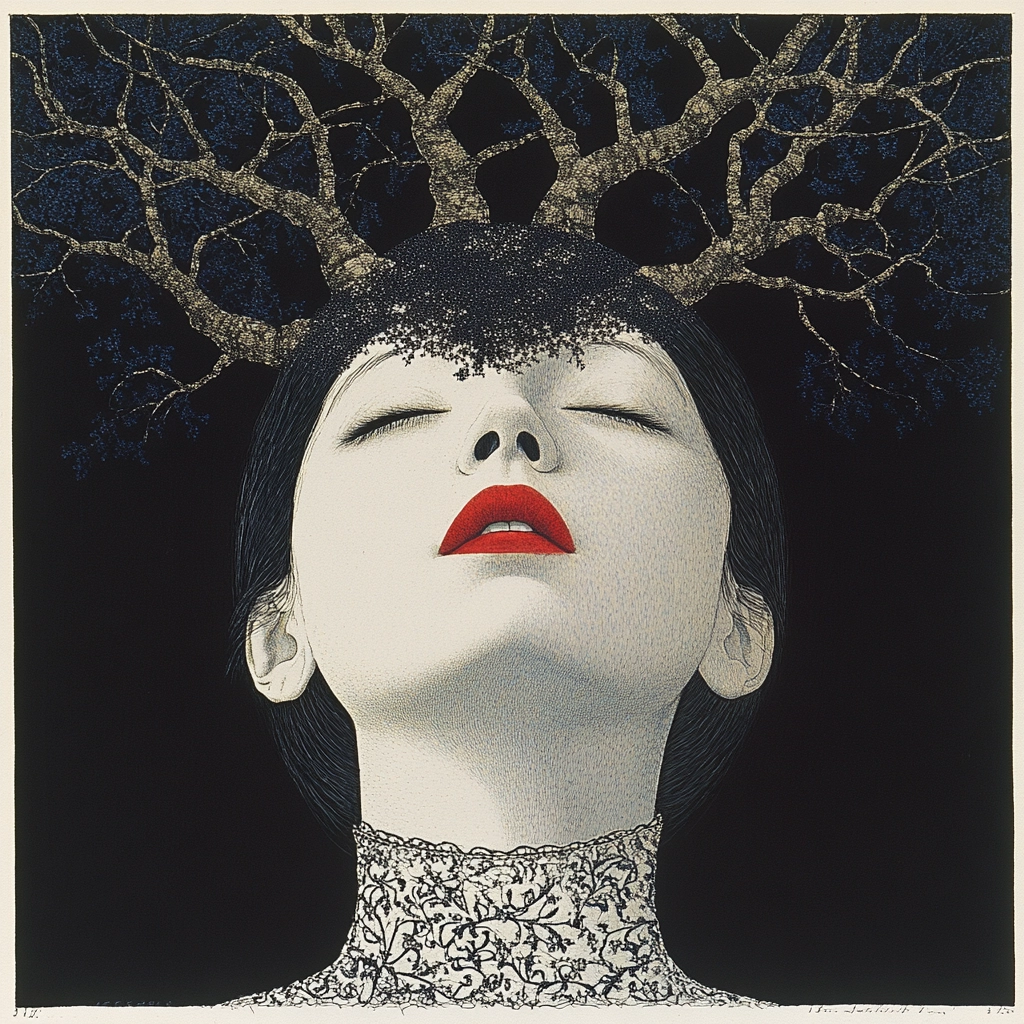 Dark tones blend with intricate floral details, reflecting a fusion of complexity and elegance.