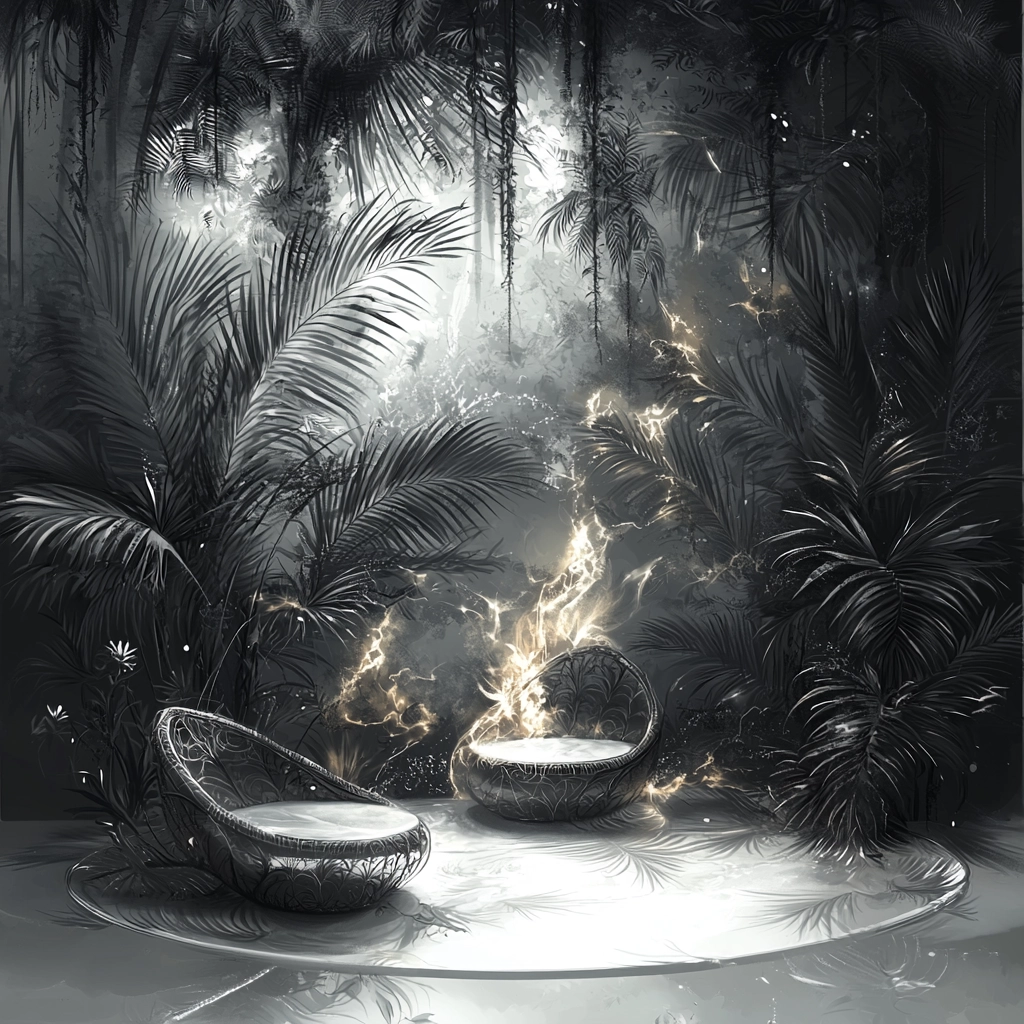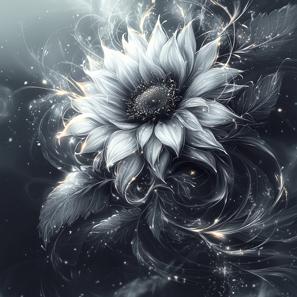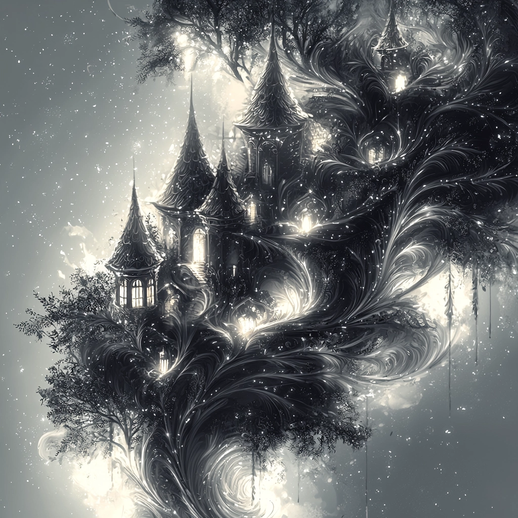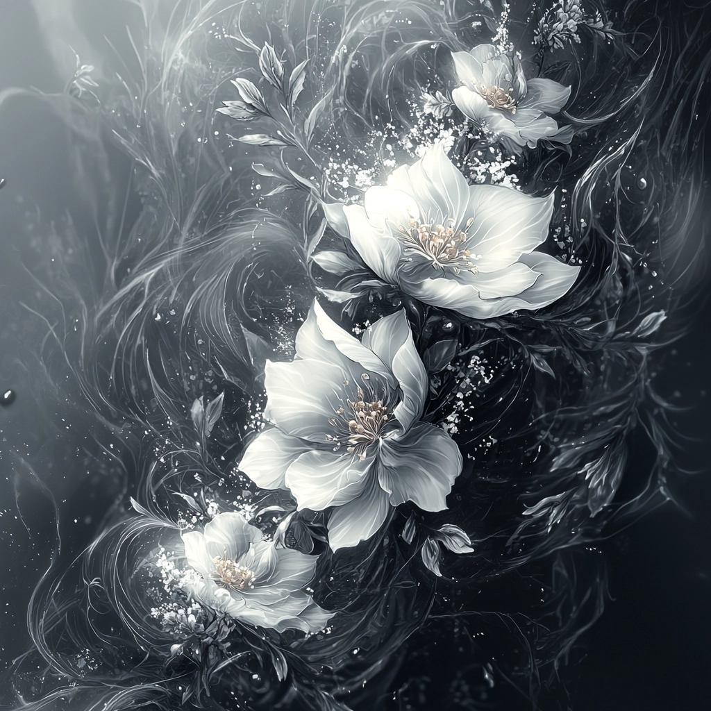 The artwork utilizes soft, luminous lighting to create depth within a monochromatic palette of black, gray, and white. Fluid lines and intricate detail emphasize texture, producing a sense of dynamic movement and sophistication across the compositions.