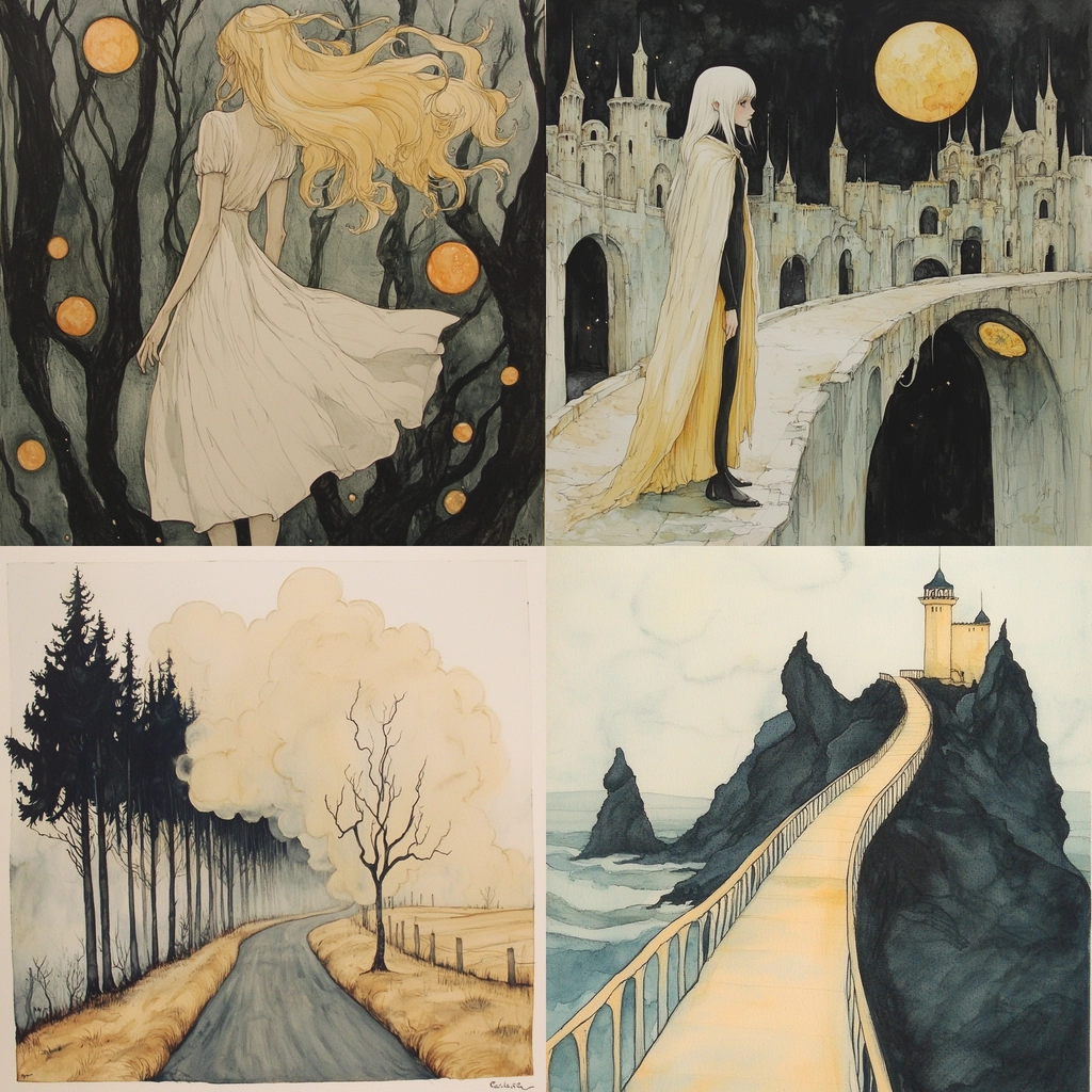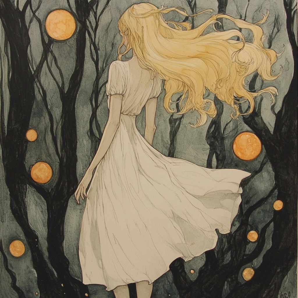 Intricate use of dark tones combined with contrasting textures and luminescent highlights creates an enchanting atmosphere.