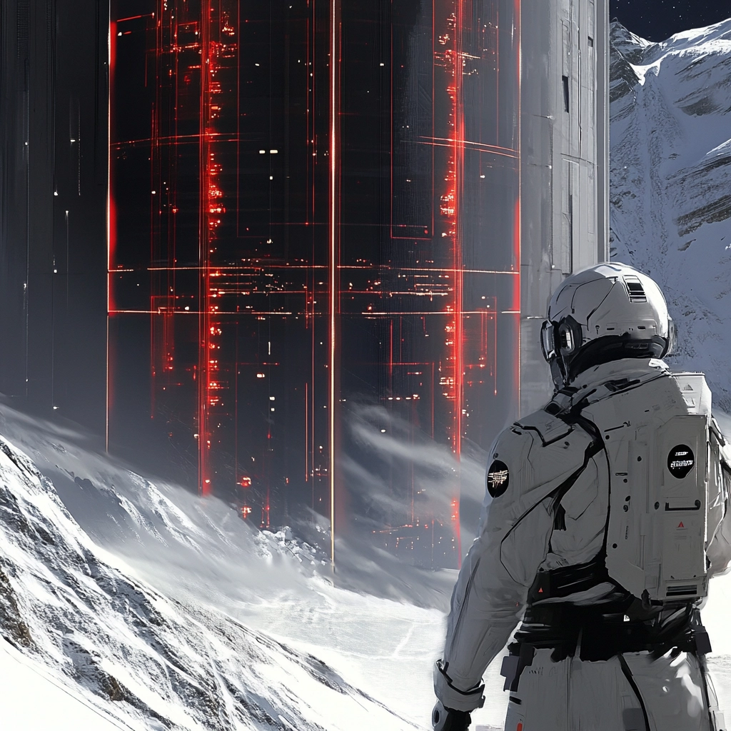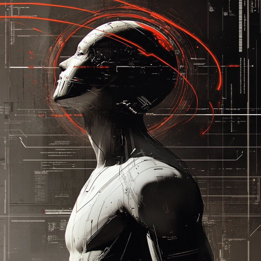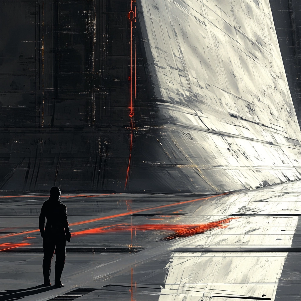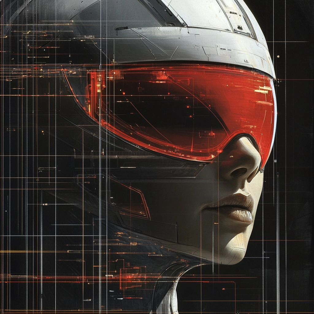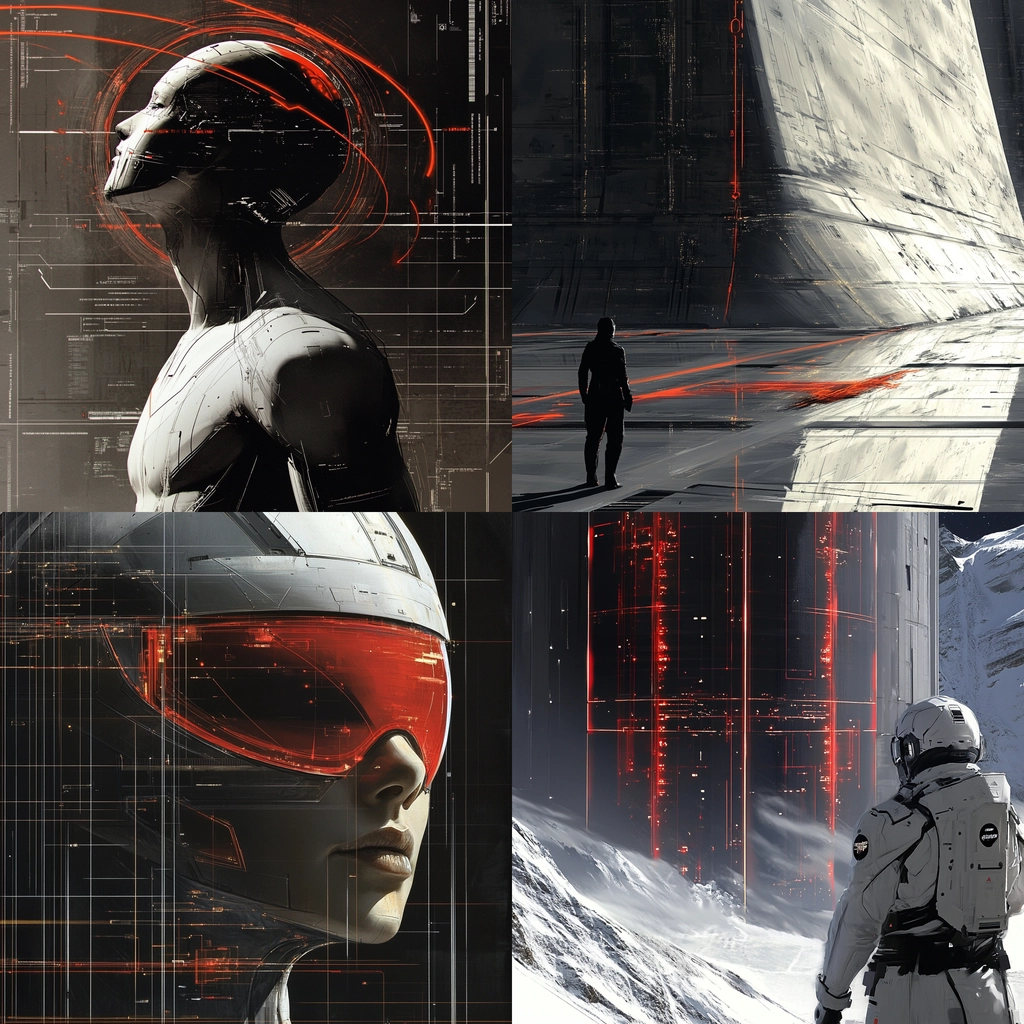 Emphasizes stark contrasts with dark tones and sharp red accents, depicting an industrial futuristic aesthetic.