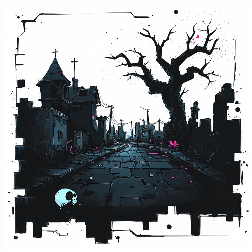 Sharp lighting creates a striking silhouette effect, with bold black lines against a smooth white background, interspersed with occasional touches of vivid pink for highlight. The texture is predominantly flat with minimal depth, lending it a graphic novel-like quality.