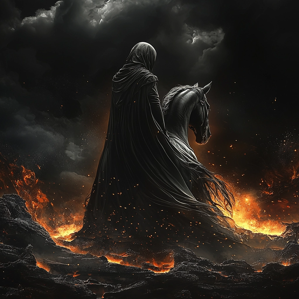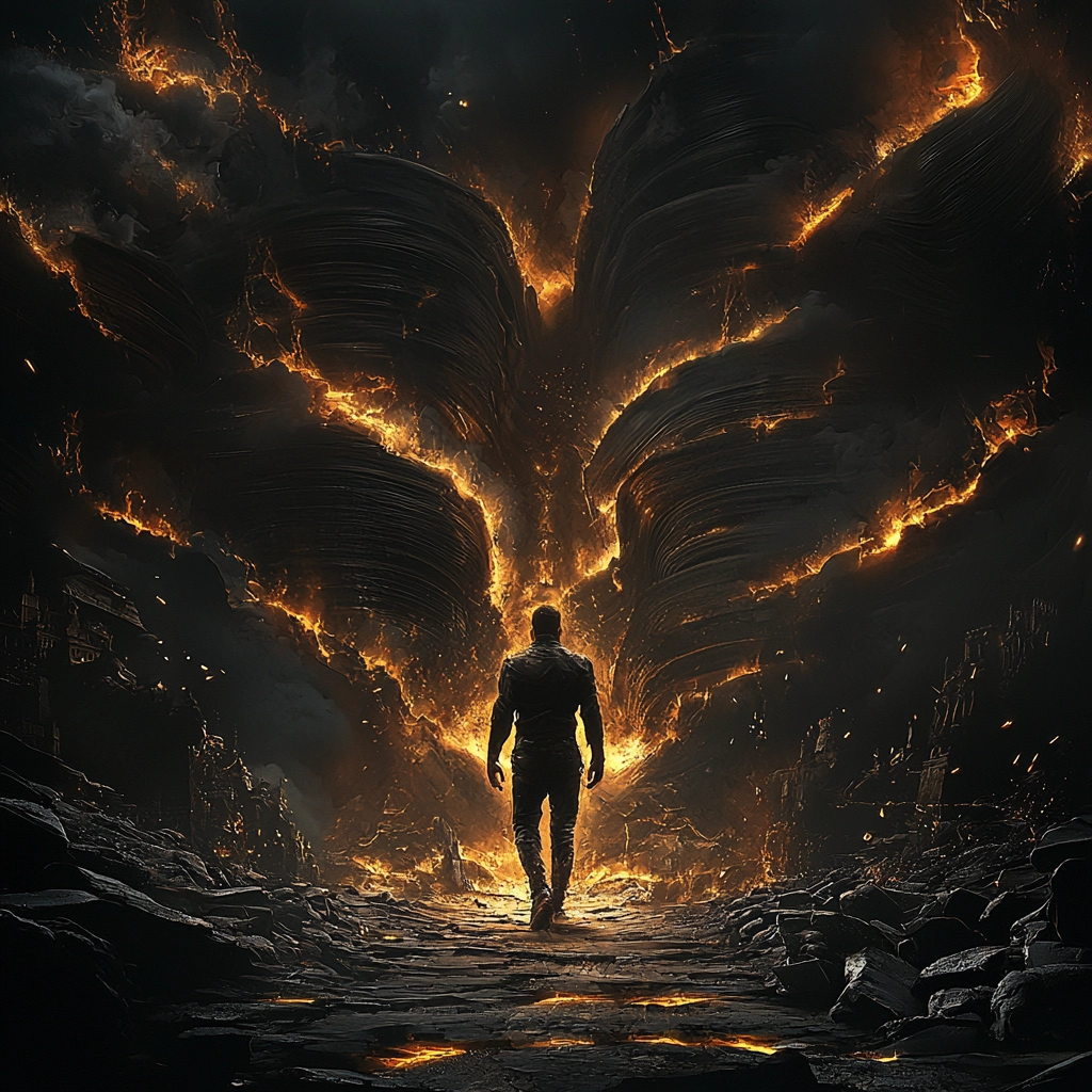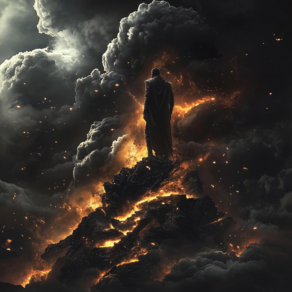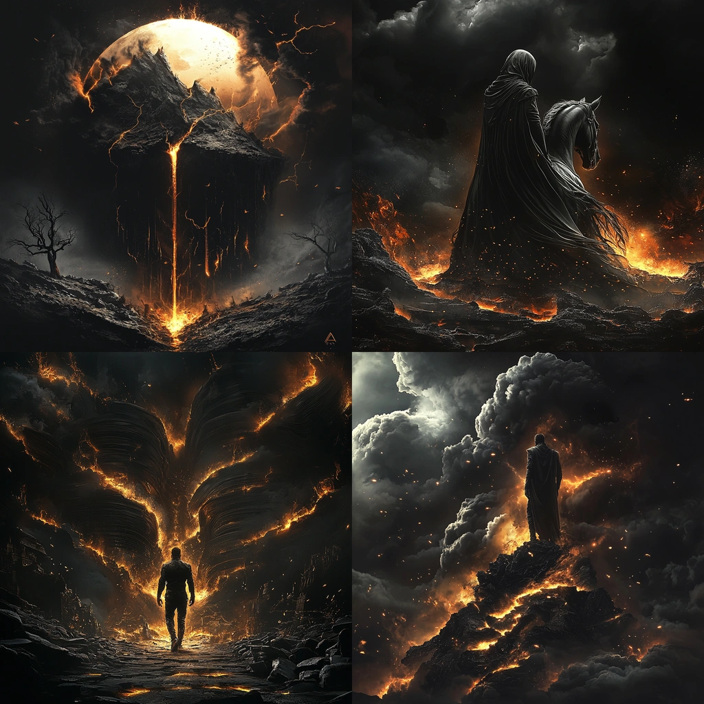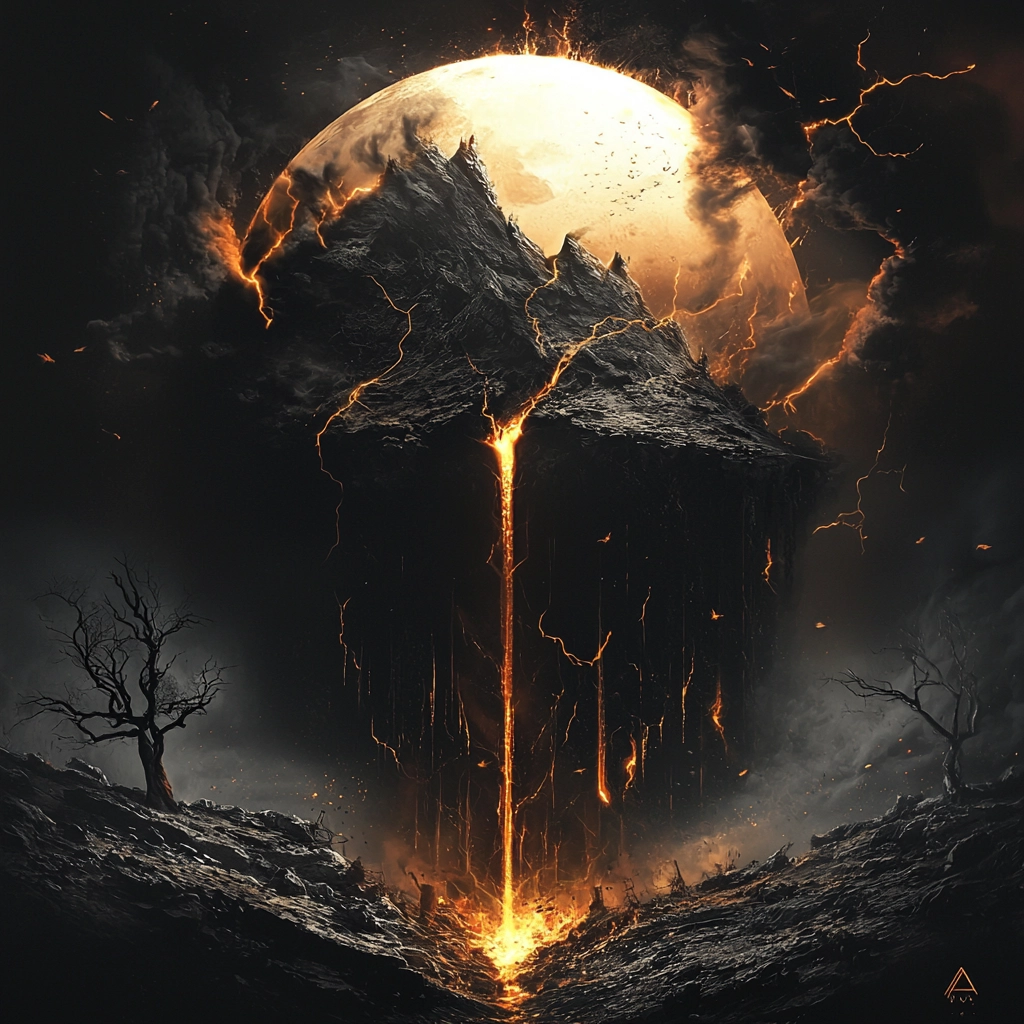 The lighting creates a stark contrast between deep shadows and bright highlights, emphasizing dramatic forms. Textures are detailed, with a volcanic aesthetic highlighted by luminous orange against dark backgrounds, creating a dynamic spatial depth.