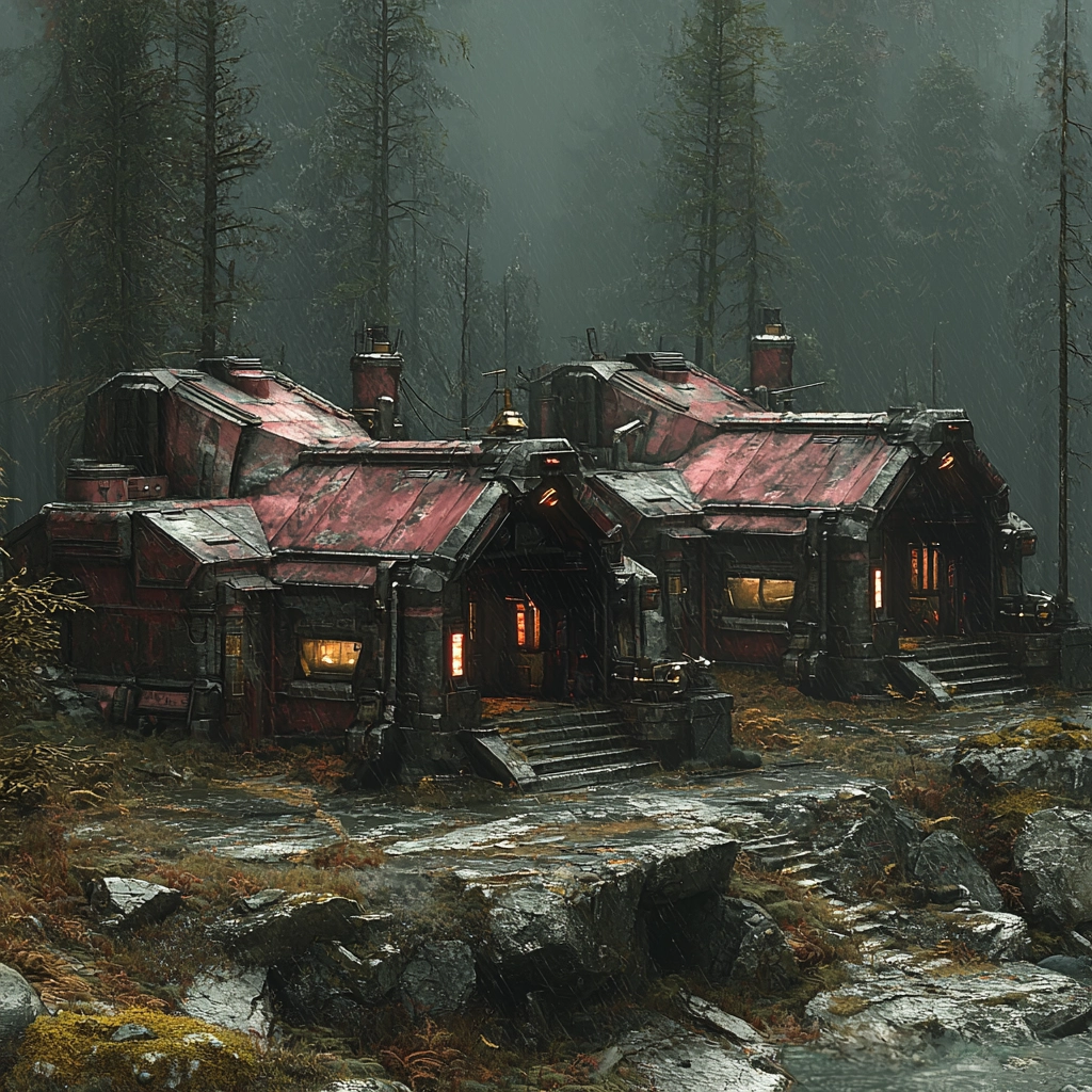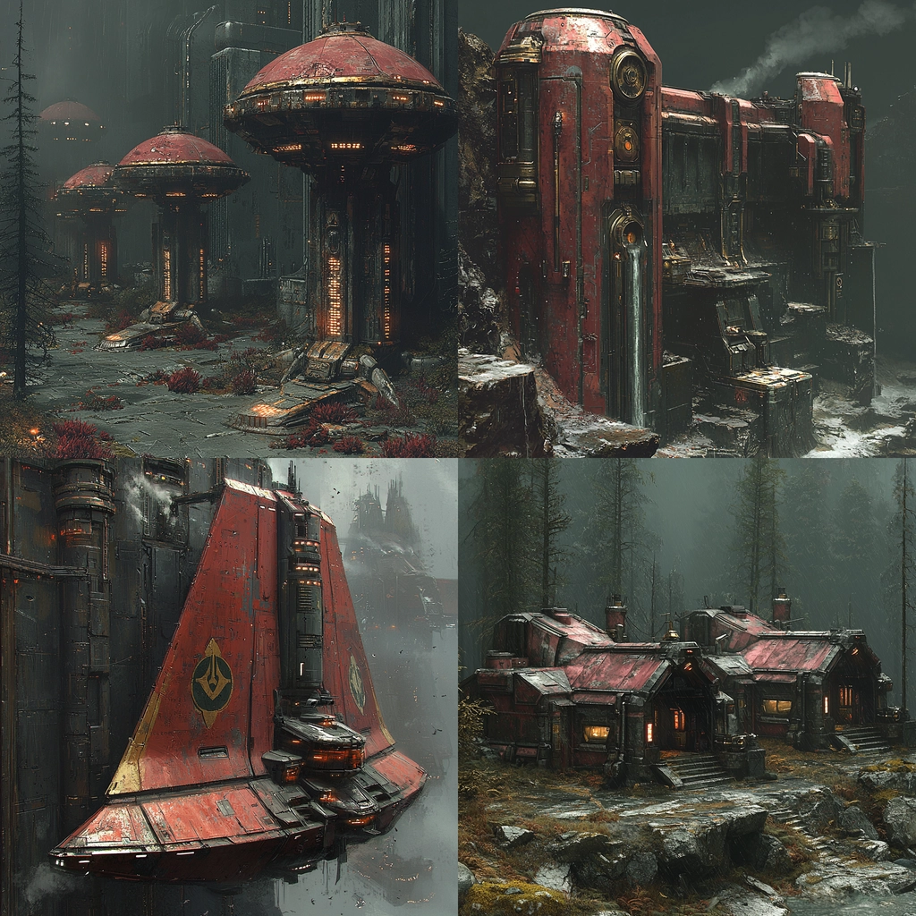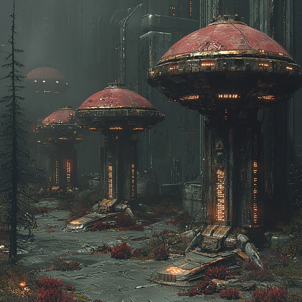 A composition emphasizing industrial futurism with dark hues and strong contrasts.