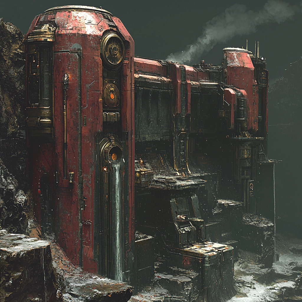 The lighting effects highlight metallic textures with a focus on worn surfaces, creating a deep sense of space. Colors are vivid and contrasting, predominantly dark with striking red elements, giving the work an industrial and futuristic feel.