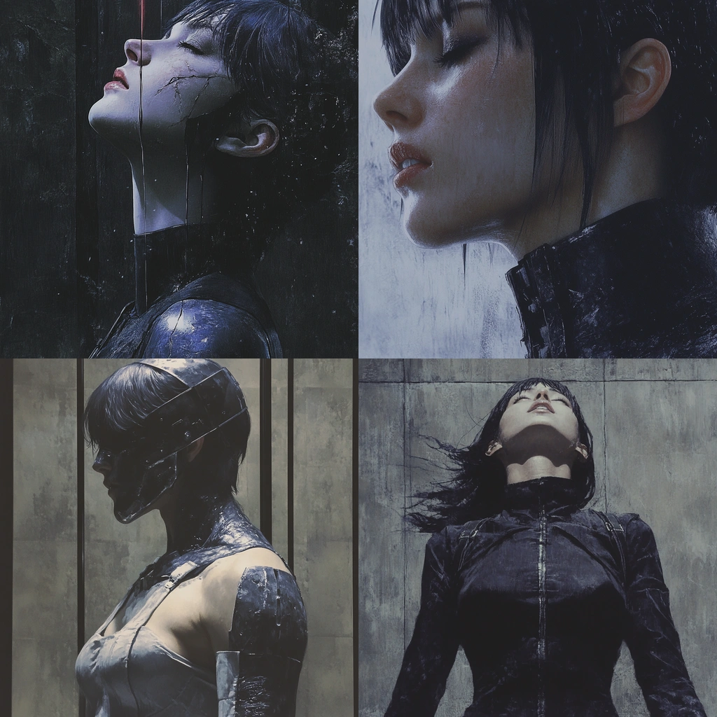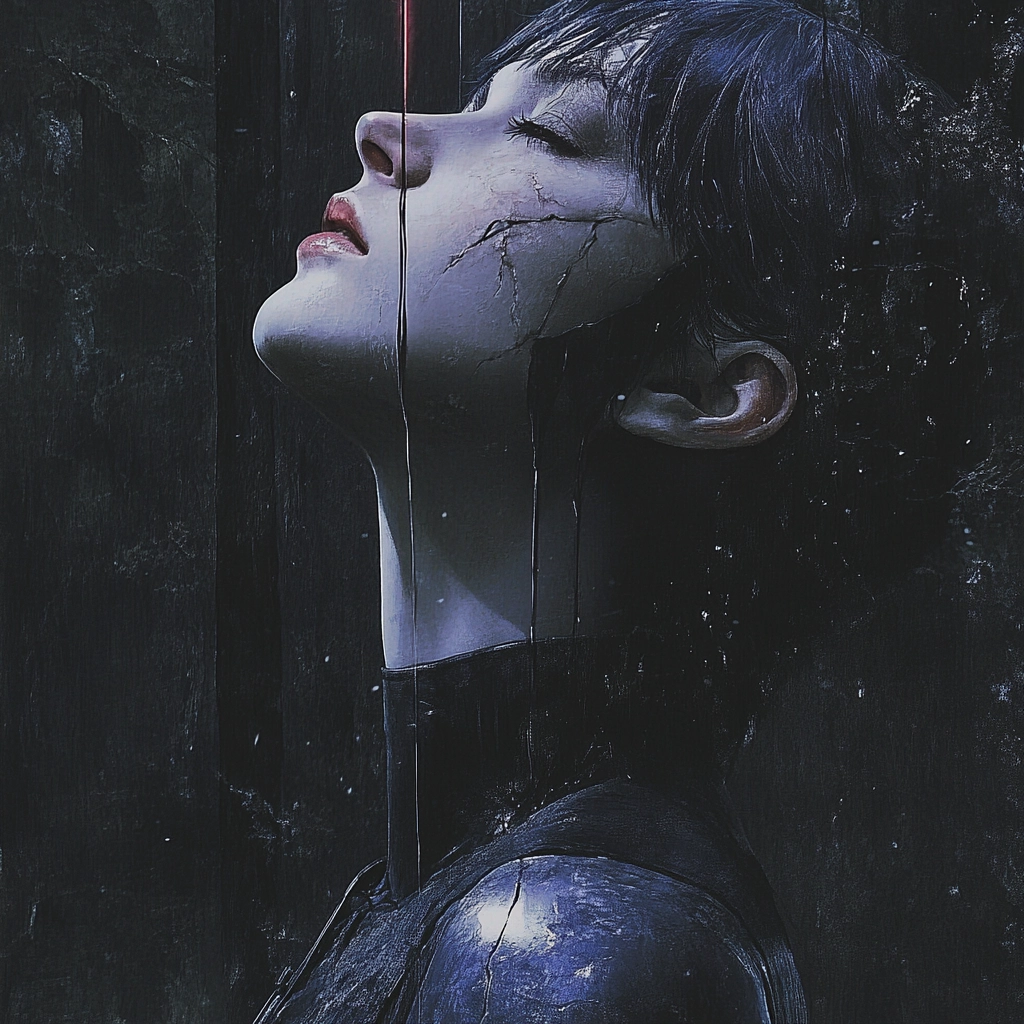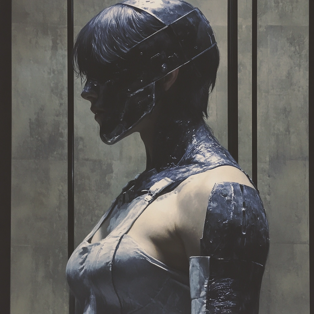 The chiaroscuro lighting effects enhance the dark and metallic texture, creating a striking juxtaposition between light and shadow, while the spatial emphasis is on verticality and depth orientation.