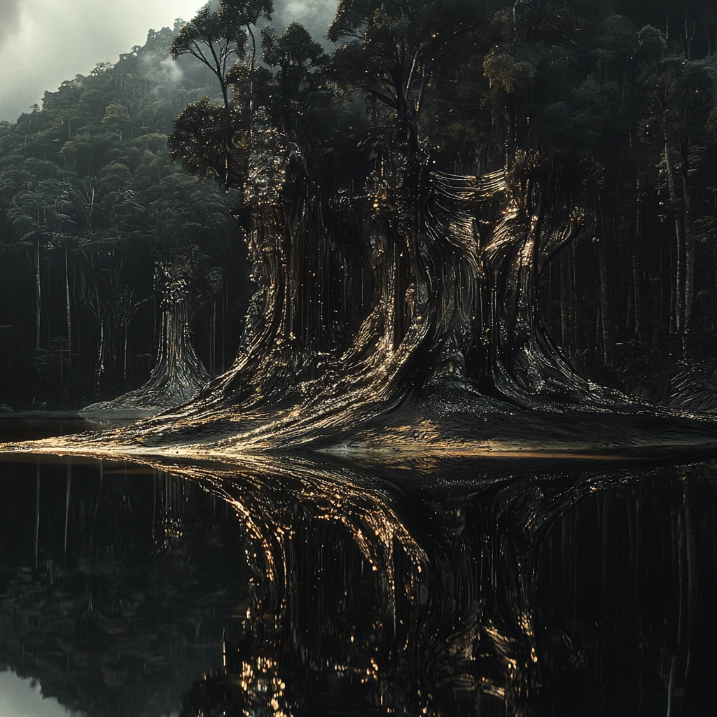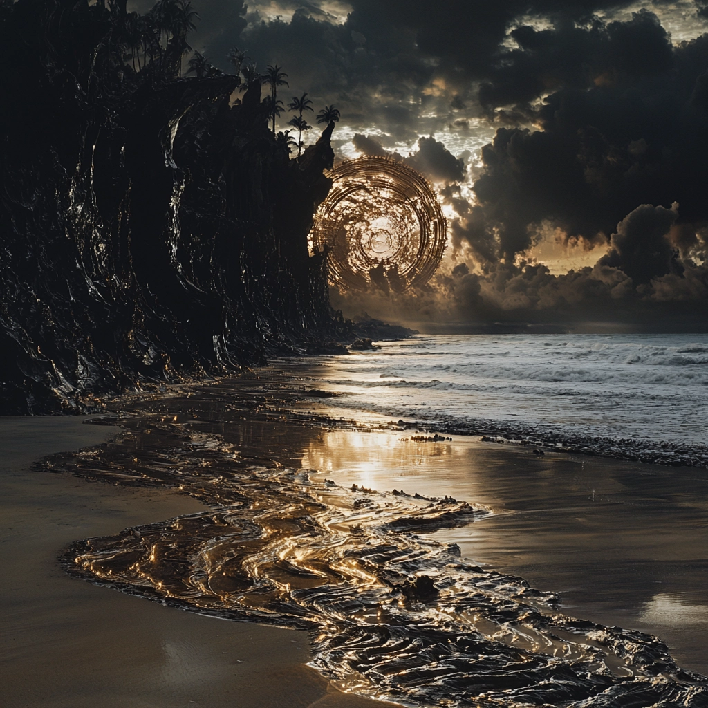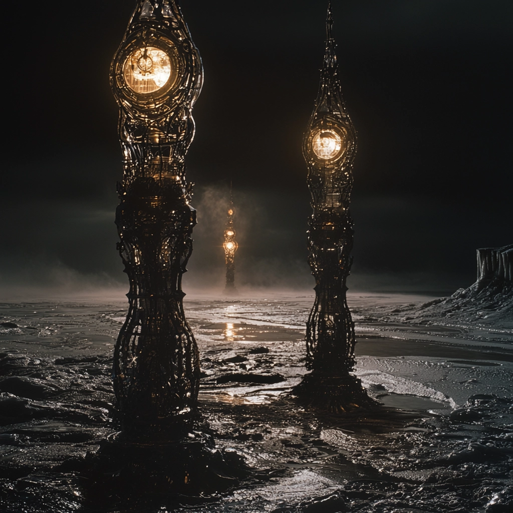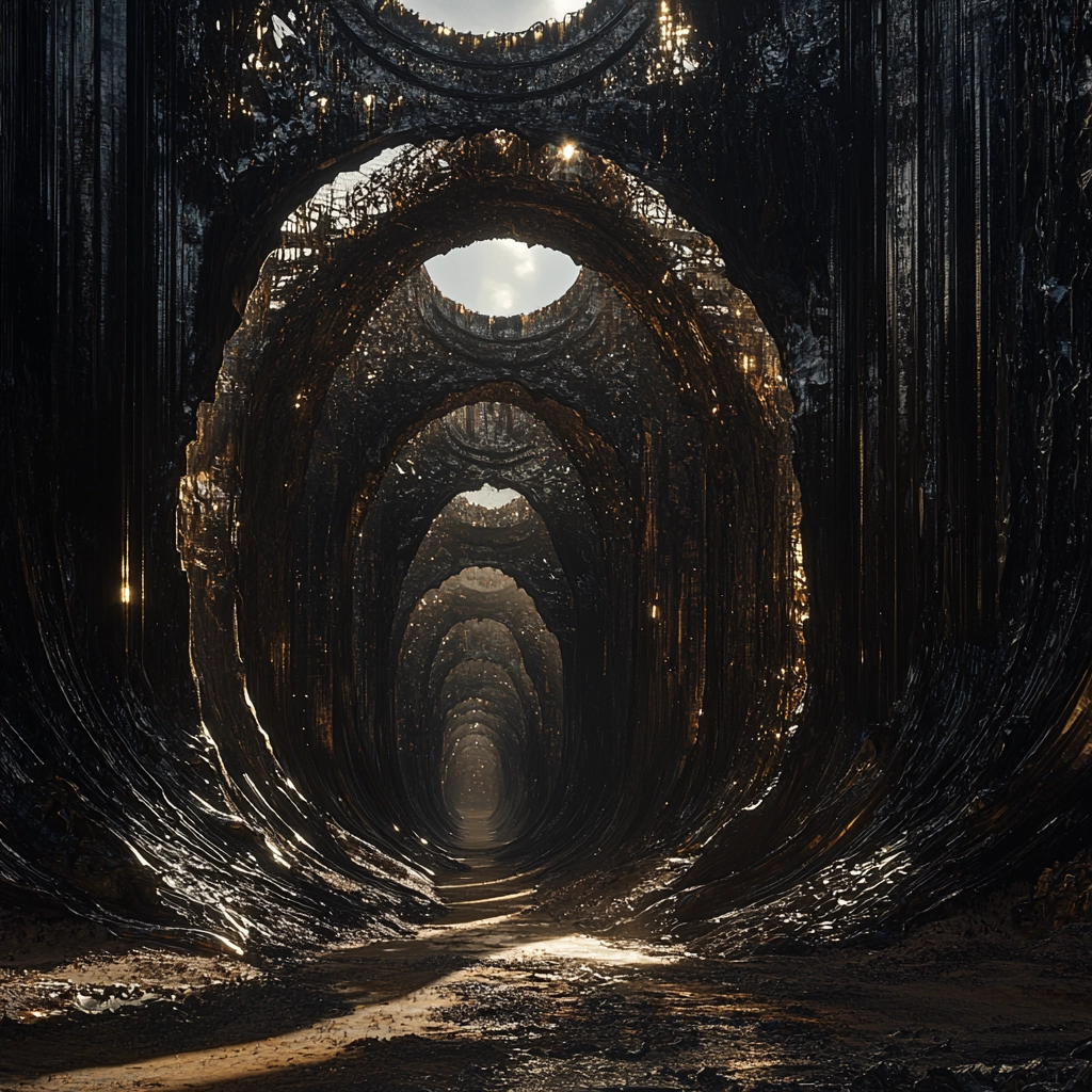 The lighting accentuates metallic textures with high contrast between dark backgrounds and shimmering highlights. The spatial depth is enhanced by the intricate layering of forms and reflective surfaces.