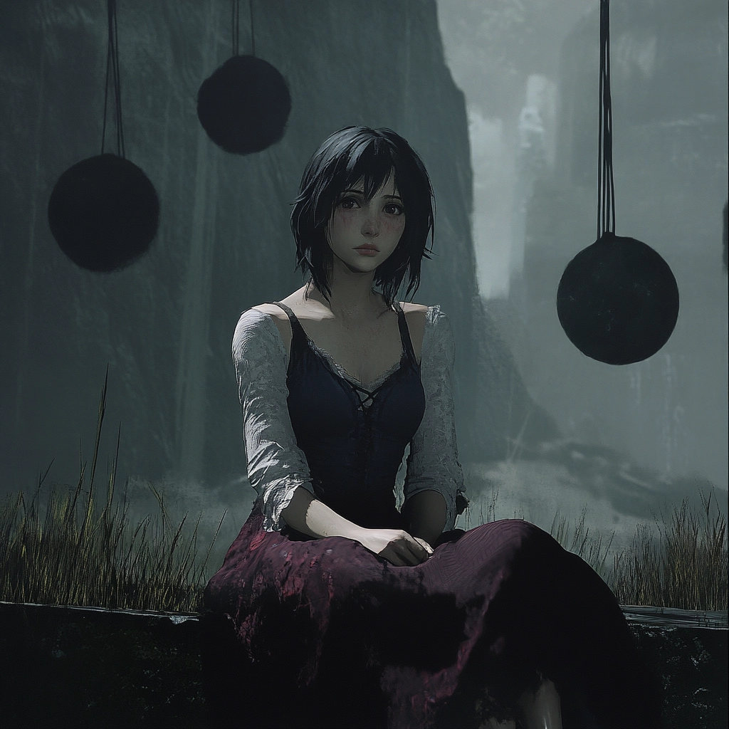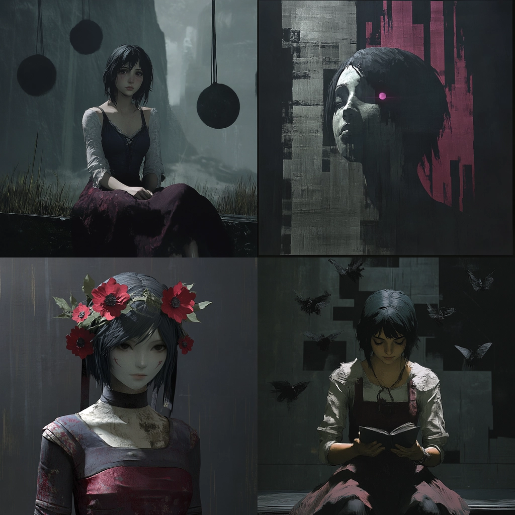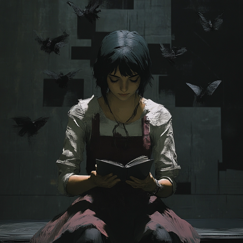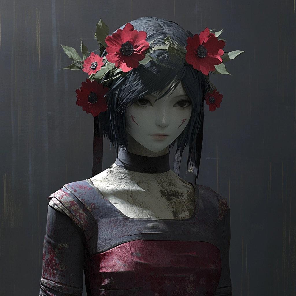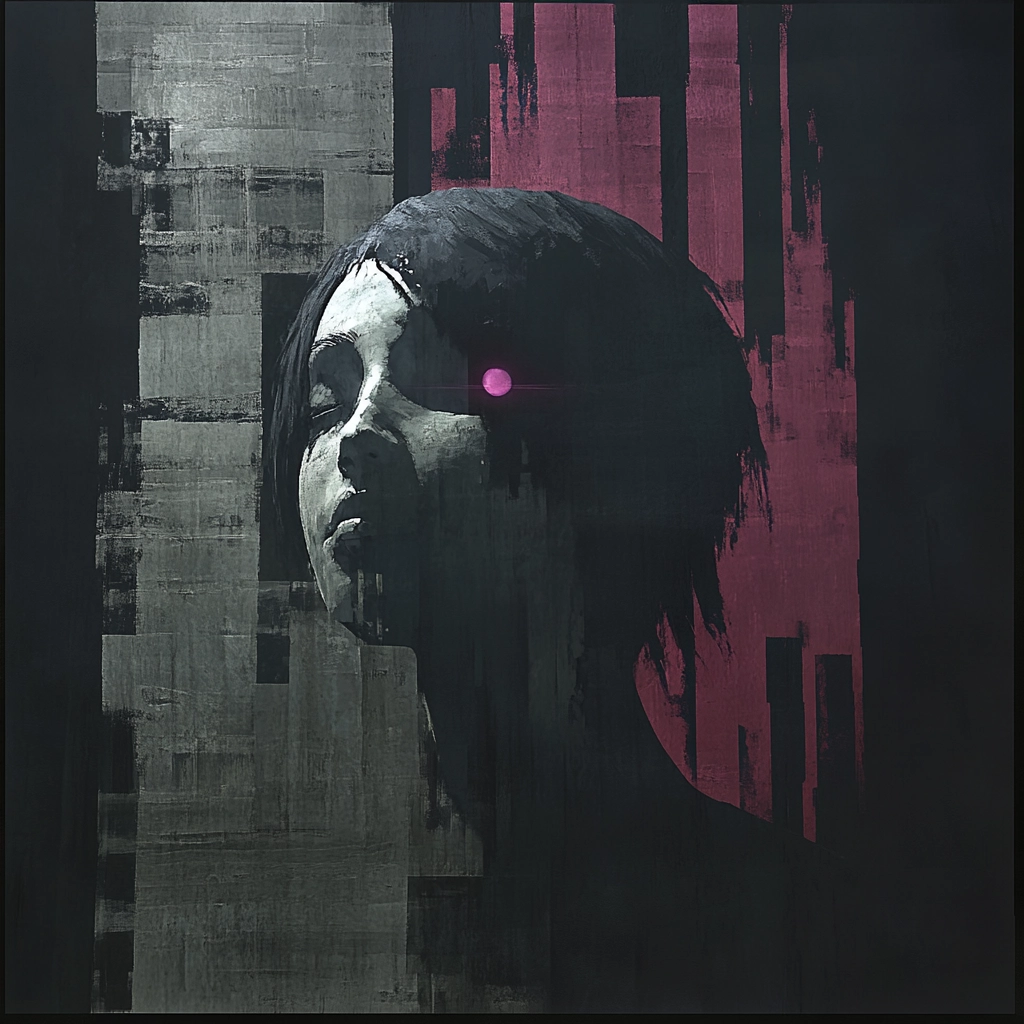 The lighting is subdued yet precise, casting a focused illumination that highlights facial features and textures. Colors are stark with deep blacks and vivid reds opposing faint whites. Textures range from smooth surfaces to rugged patches, enhancing spatial perception.