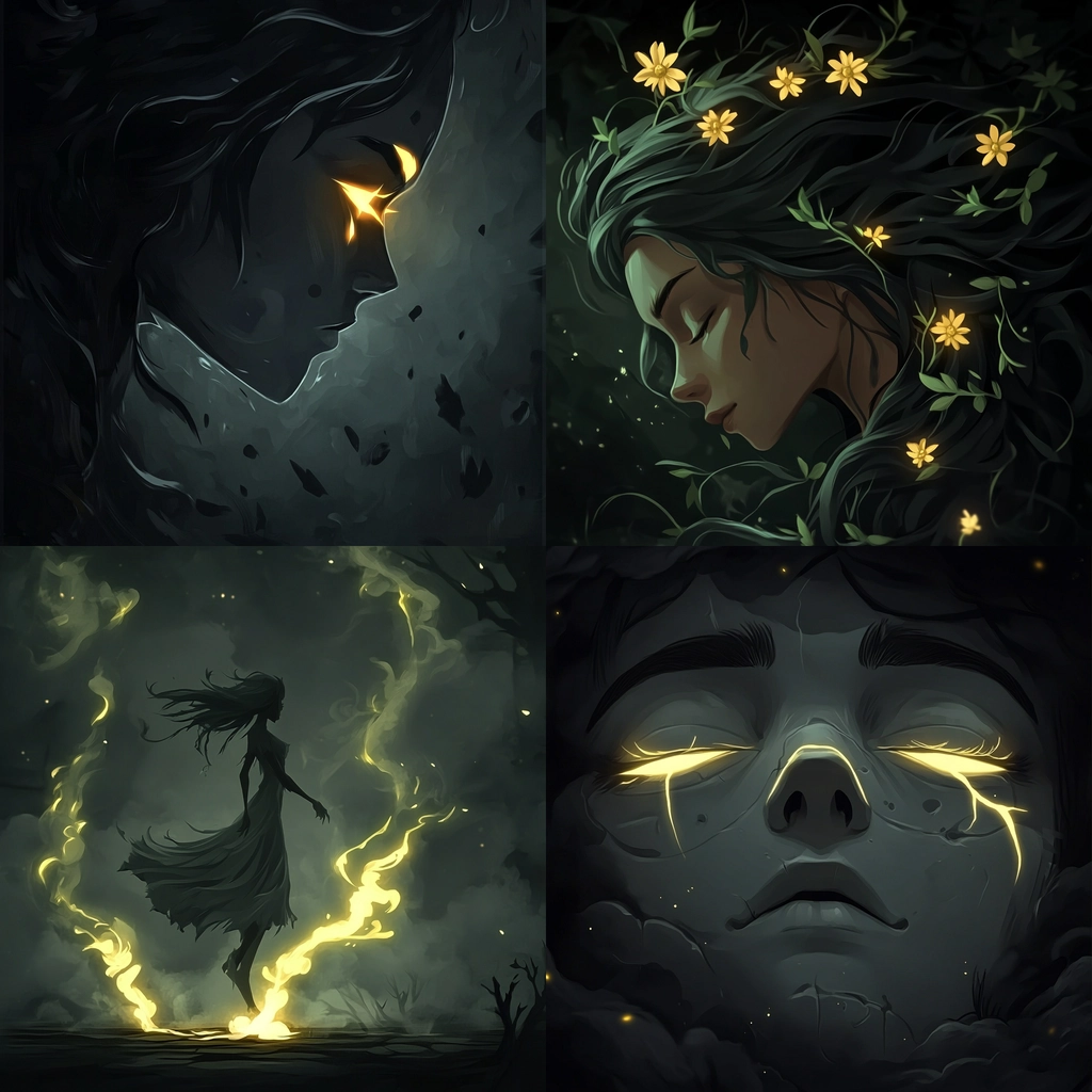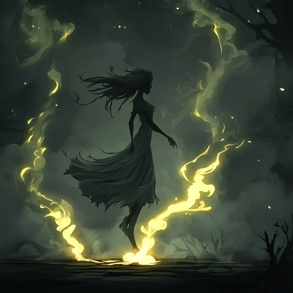 Strong contrast between dark hues and striking neon highlights creating a dramatic atmosphere.