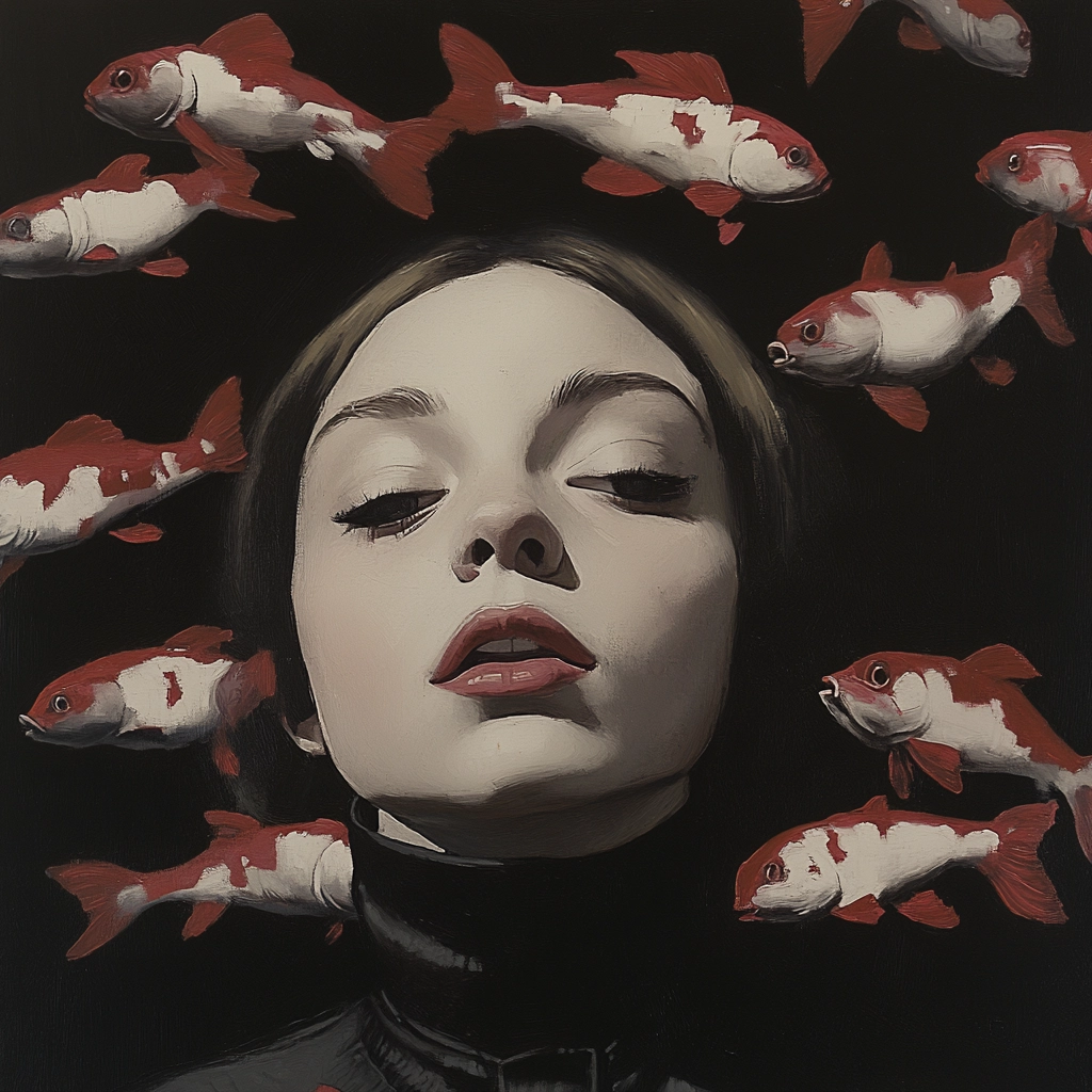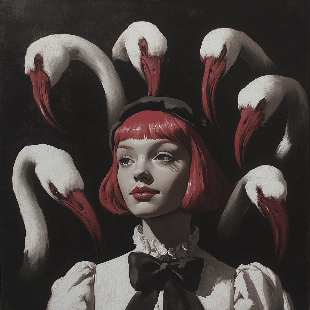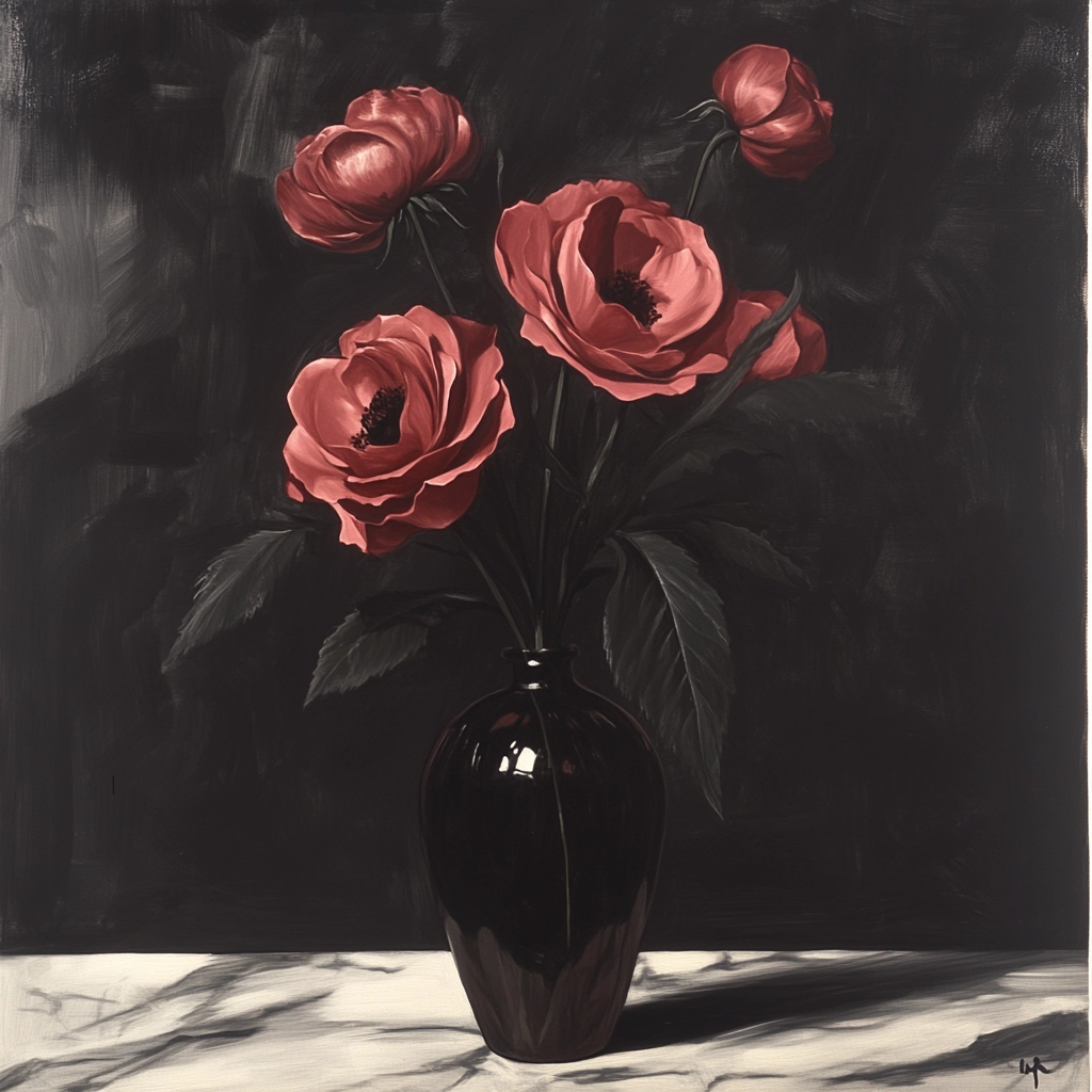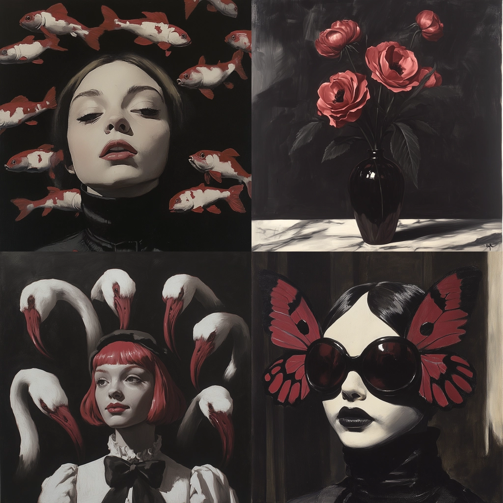 The lighting is subdued, creating a dramatic contrast between the vibrant red and deep black hues. The spatial depth is enhanced by the interplay of shadows, while the textures vary from smooth surfaces to delicate features, emphasizing the tactile quality of the depicted forms.