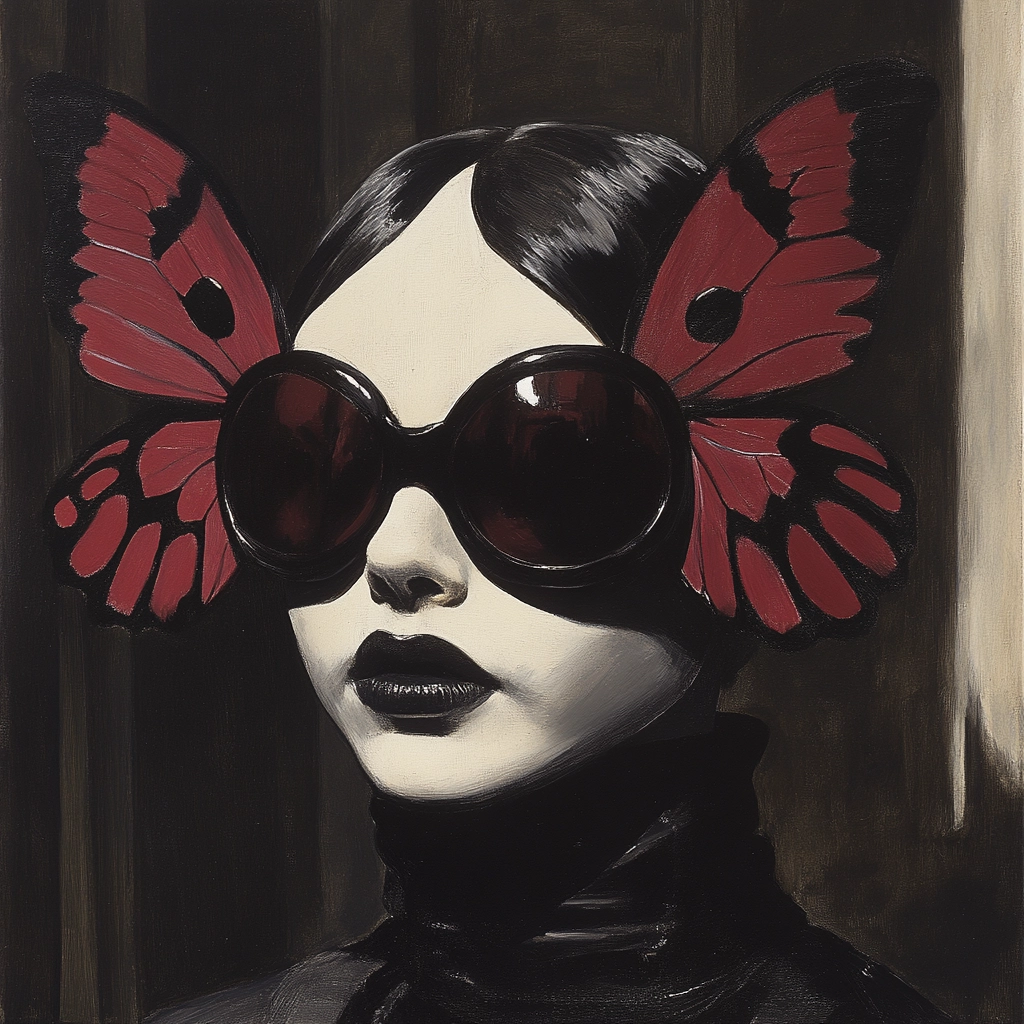 This artwork features striking red elements against a dark background with contrasting white forms.