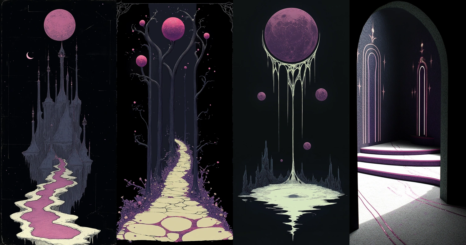 Dominated by dark hues, highlighted with pale illumination and intricate patterns.