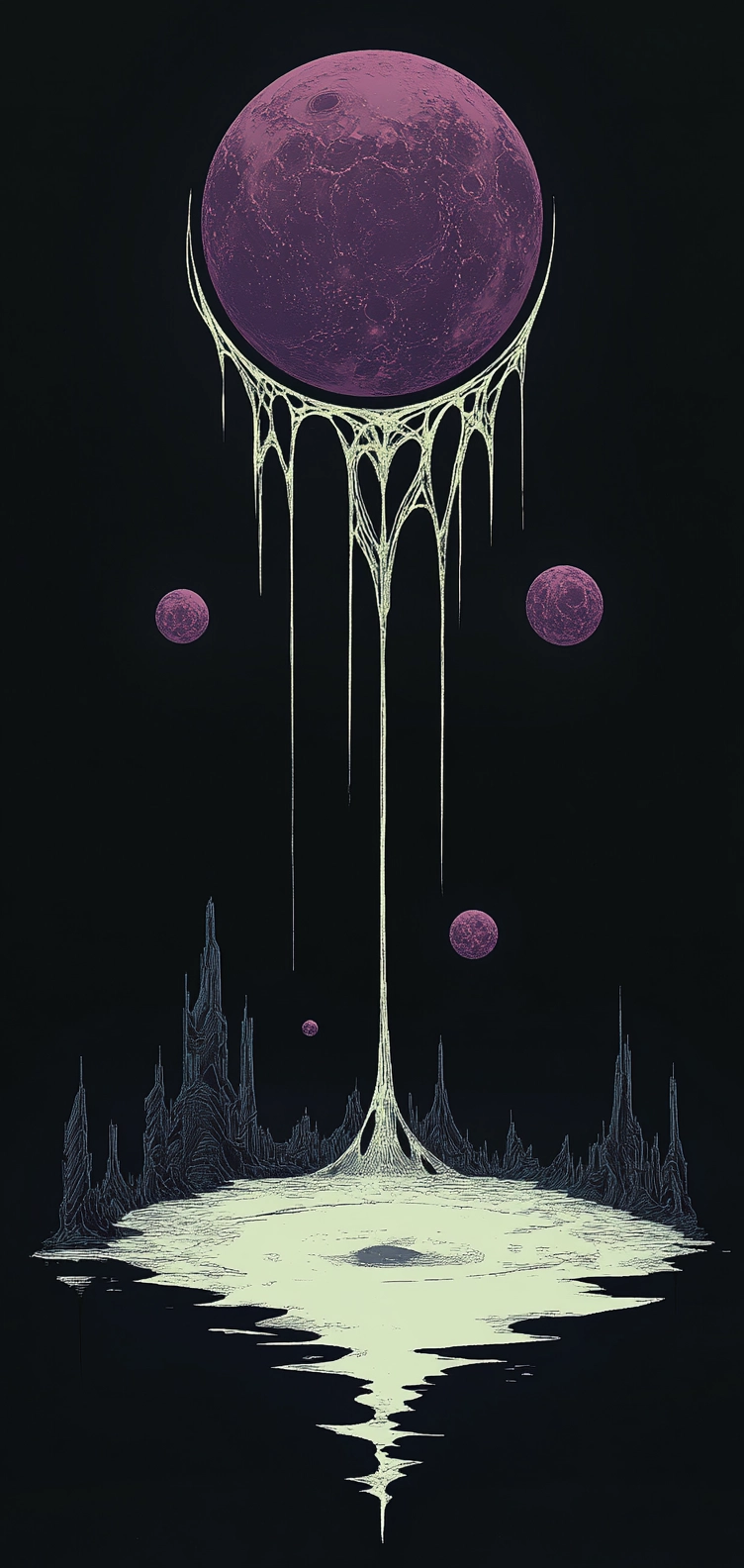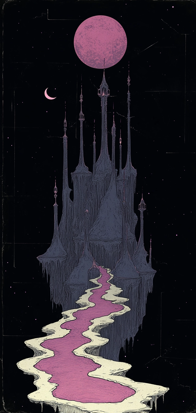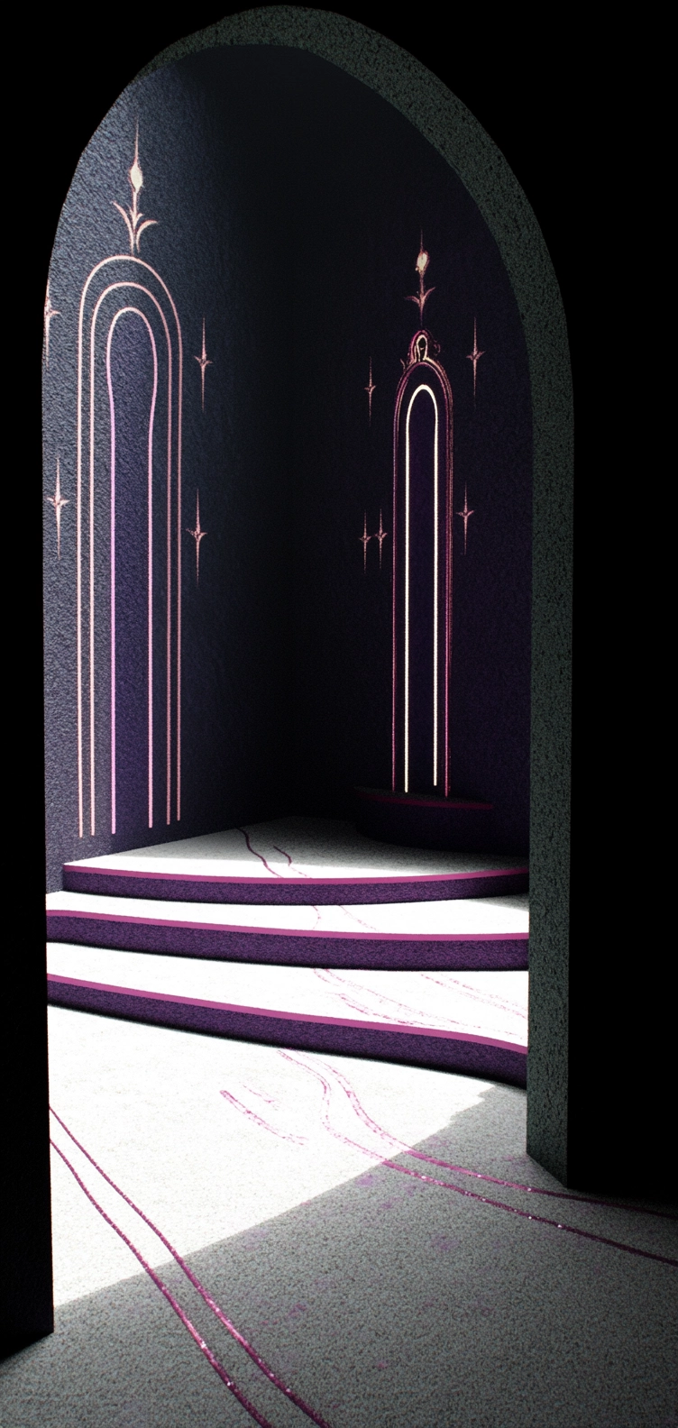 The lighting effects create a stark contrast, emphasizing the dark backdrop with ethereal glows. The colors blend seamlessly, creating a mystical ambiance, while the meticulous detailing enhances the spatial depth. Textures vary, providing both smooth and textured surfaces, adding to the visual complexity.