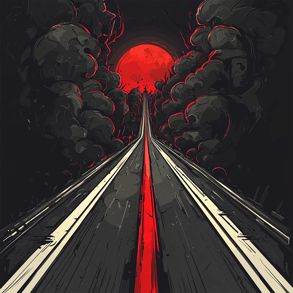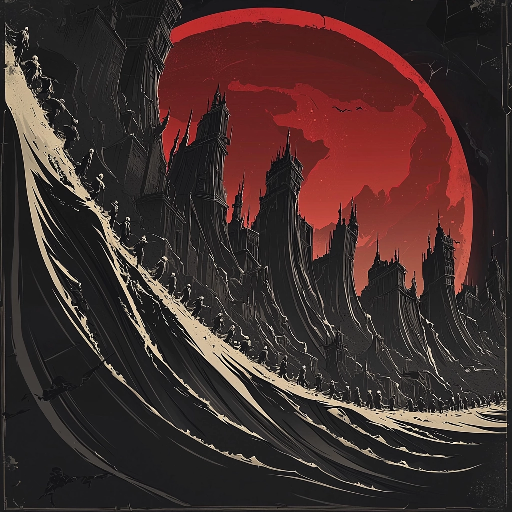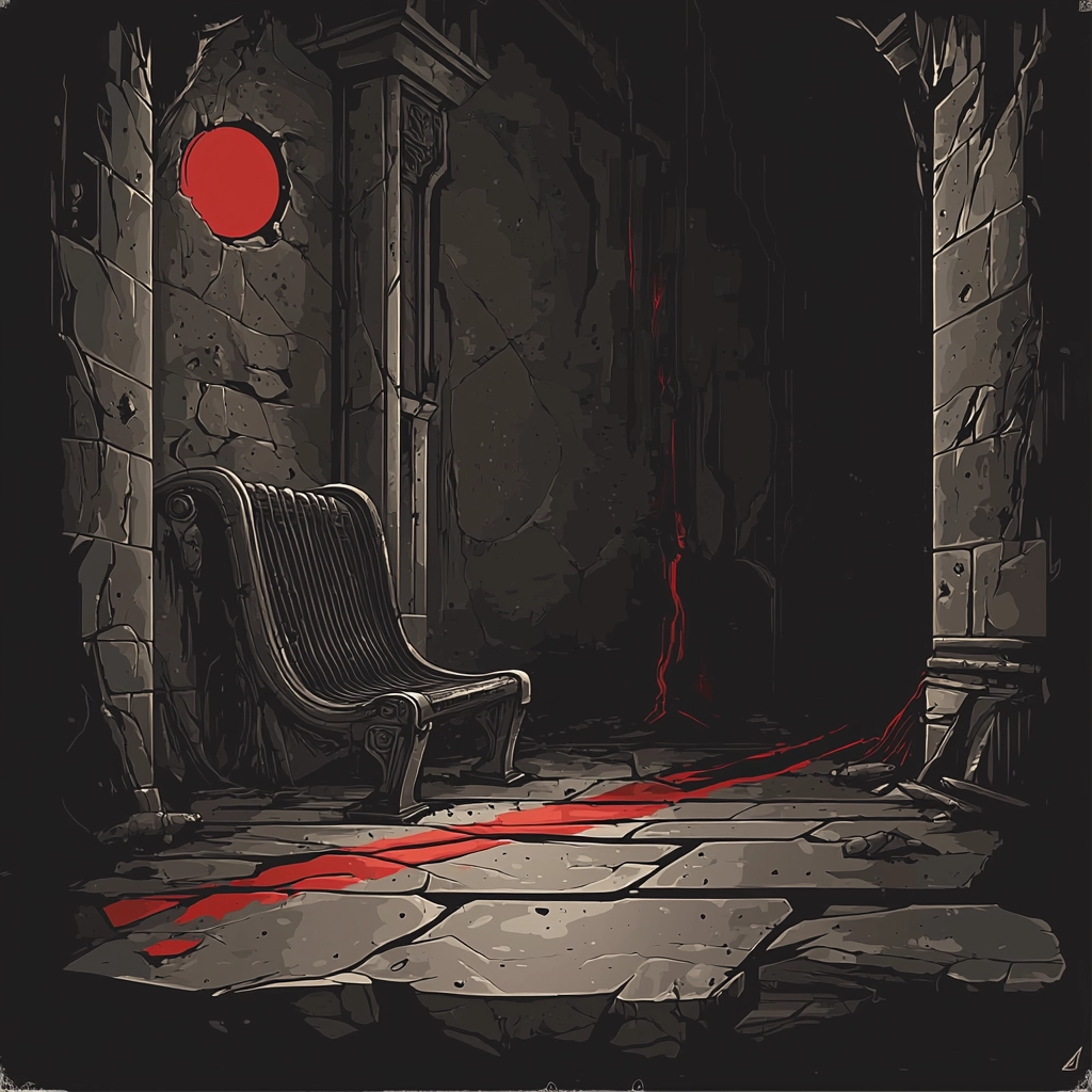Dynamic lighting highlights red elements against expansive black backgrounds, blending smooth surfaces with textured shadows to evoke depth and stark contrast in space and form.