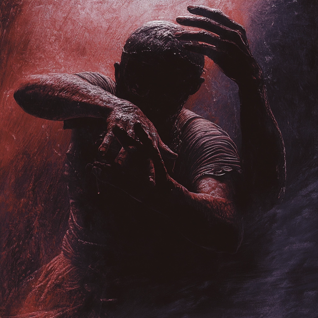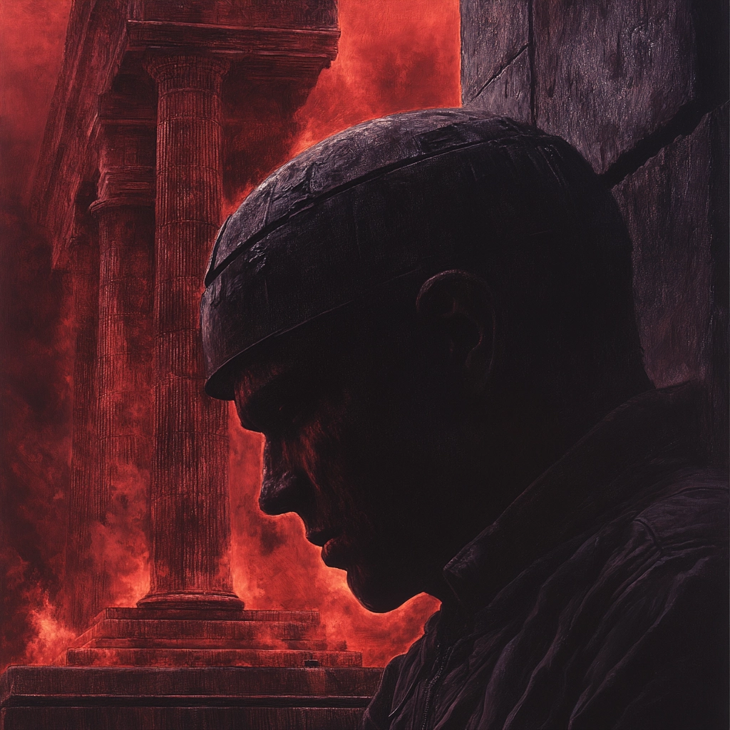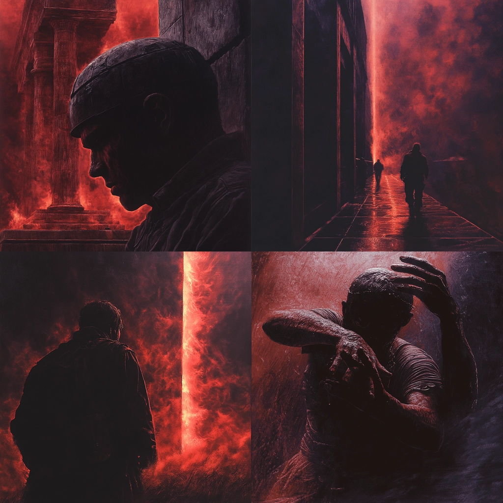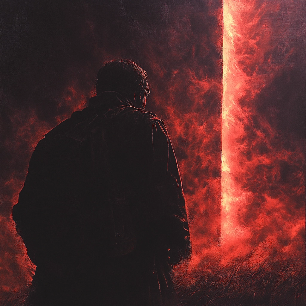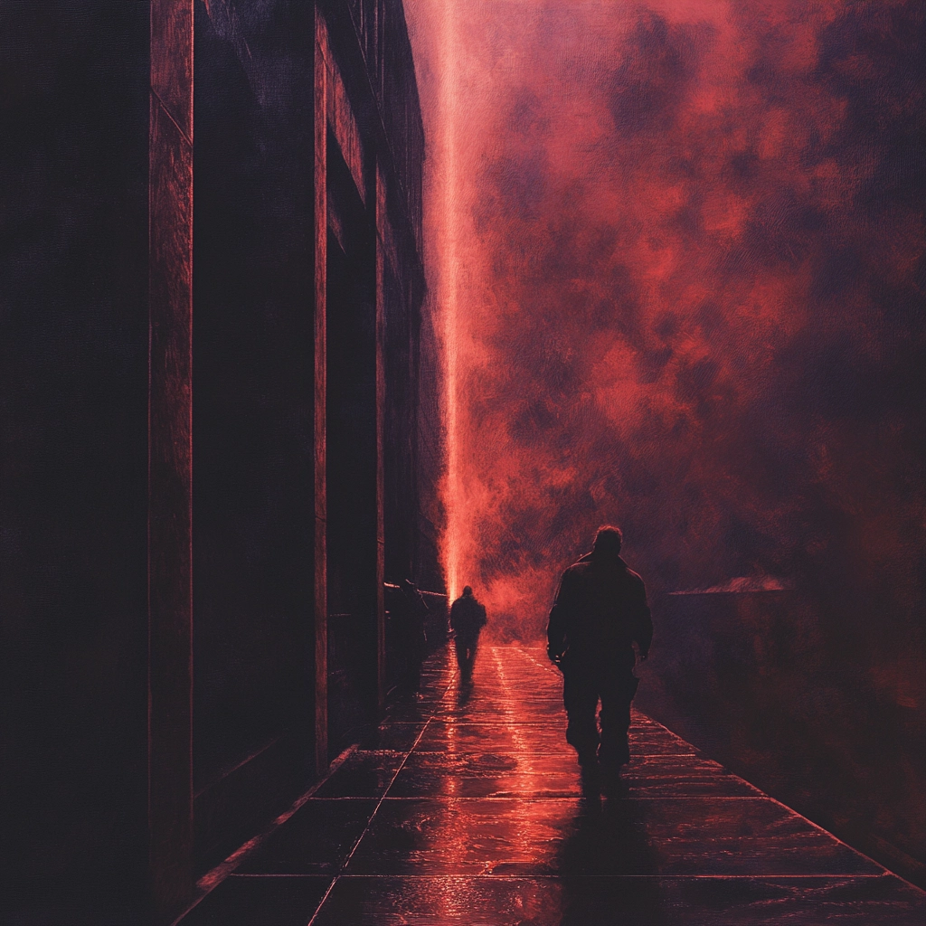 Strong lighting effects simulate a contrasting environment, with deep red hues providing texture against stark shadows. Perspective is used to create a sense of depth and intensity, enhancing the atmospheric tension through bold use of dark color grades.