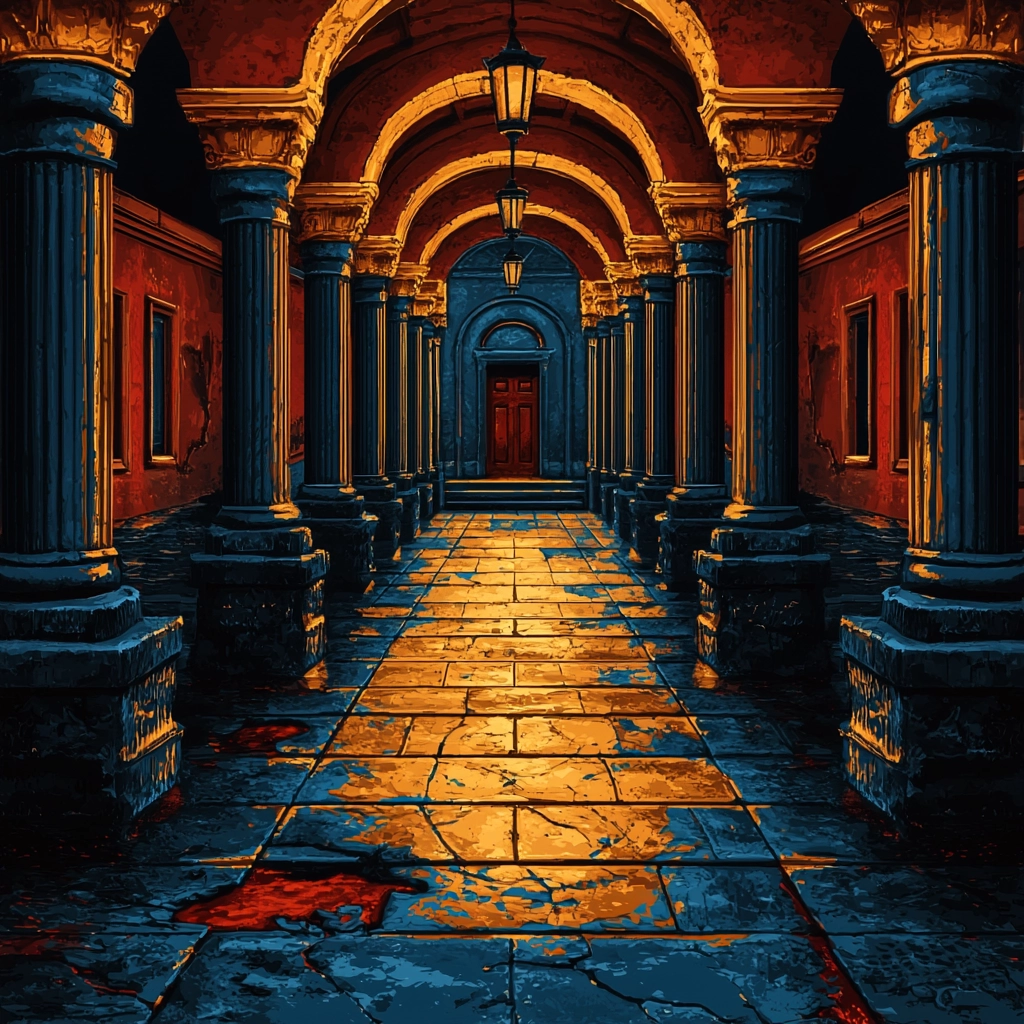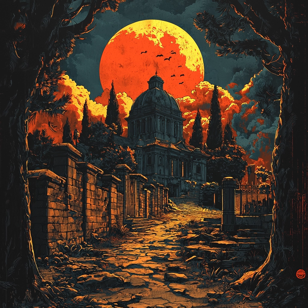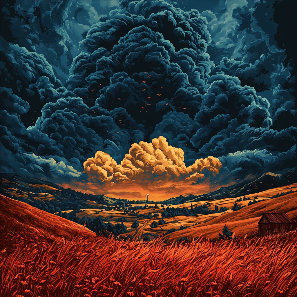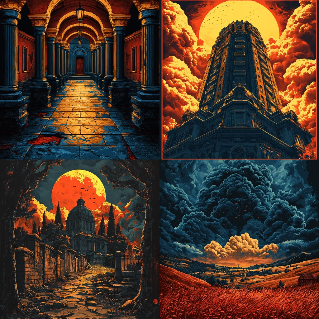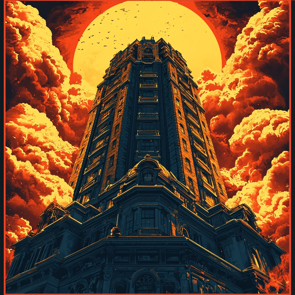 The lighting emphasizes a stark contrast between the deep dark tones and the blazing orange highlights, creating dramatic depth. The textures are finely detailed, providing an illusion of weight and structure that contributes to a sense of intense drama.