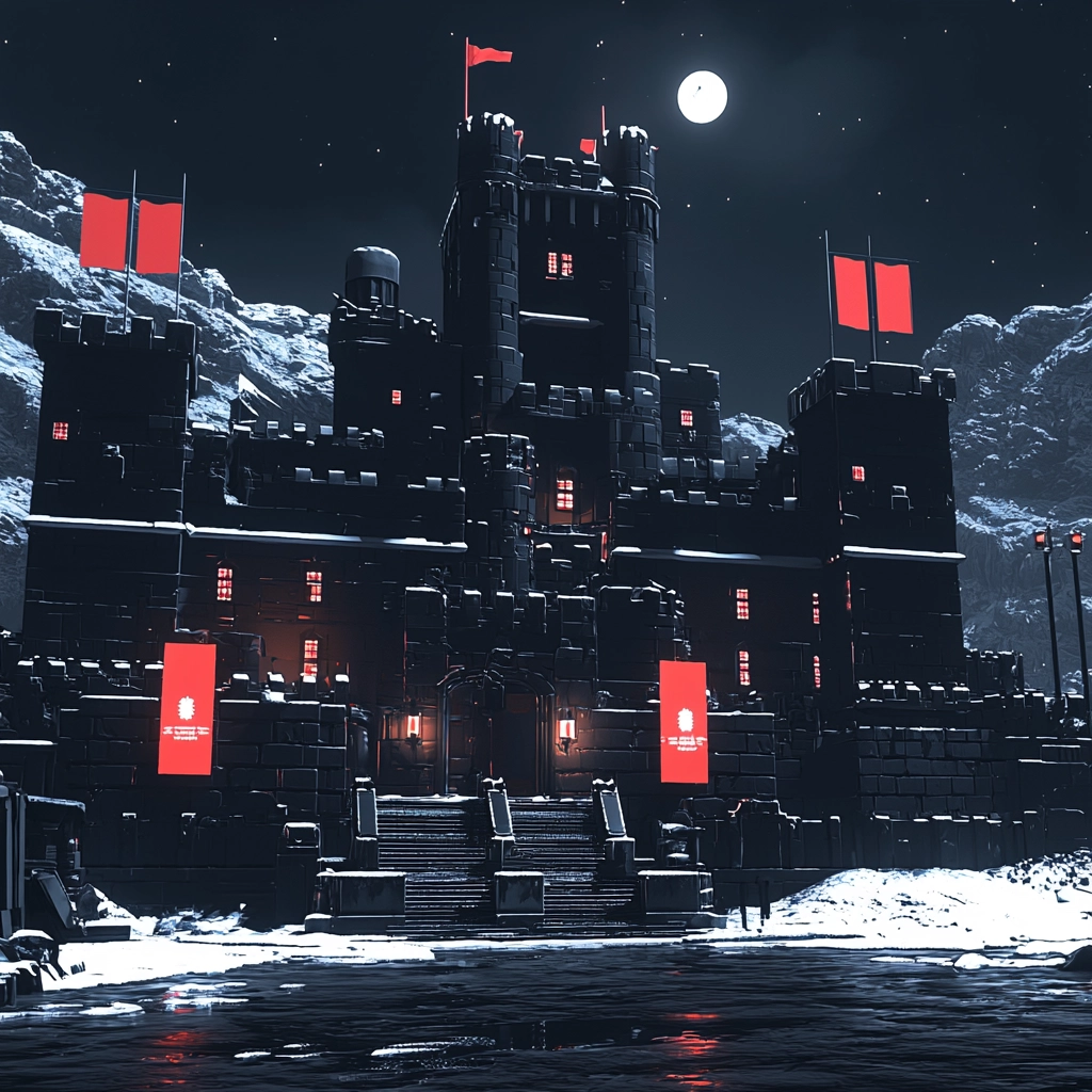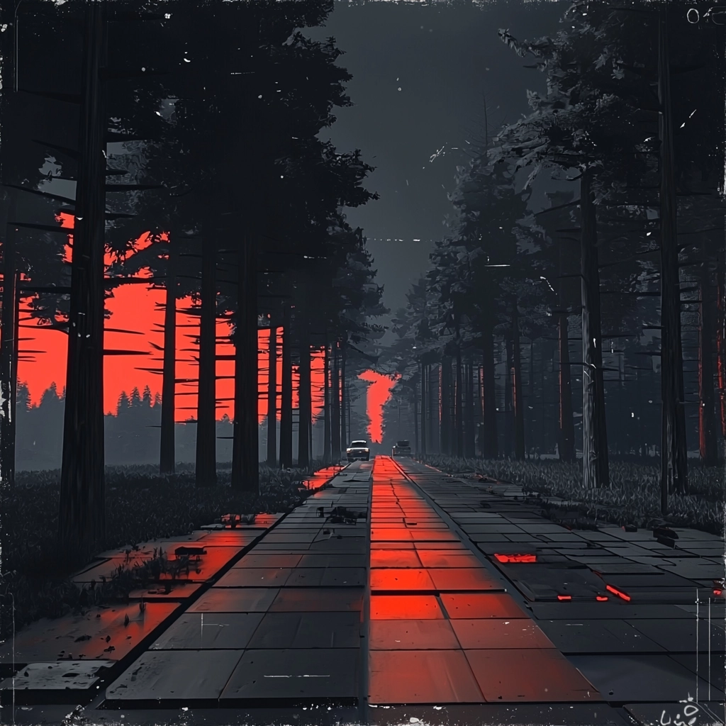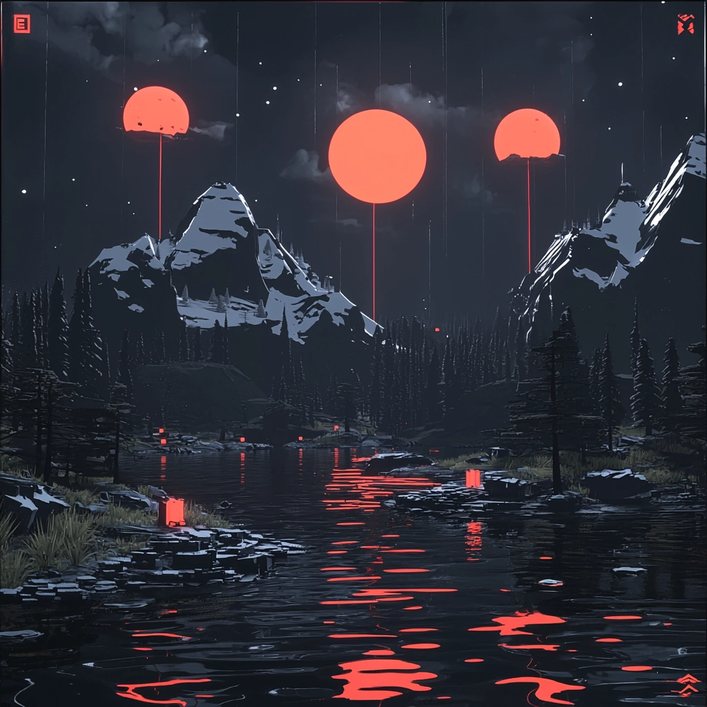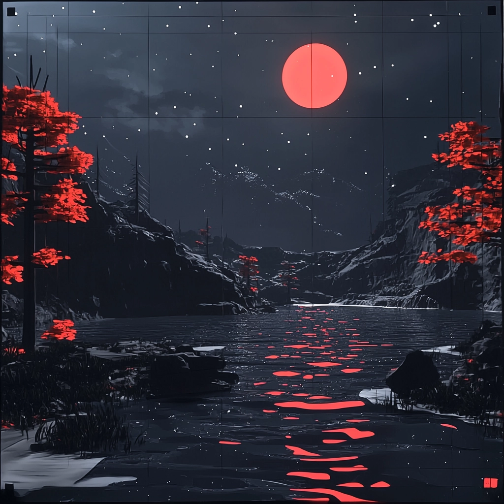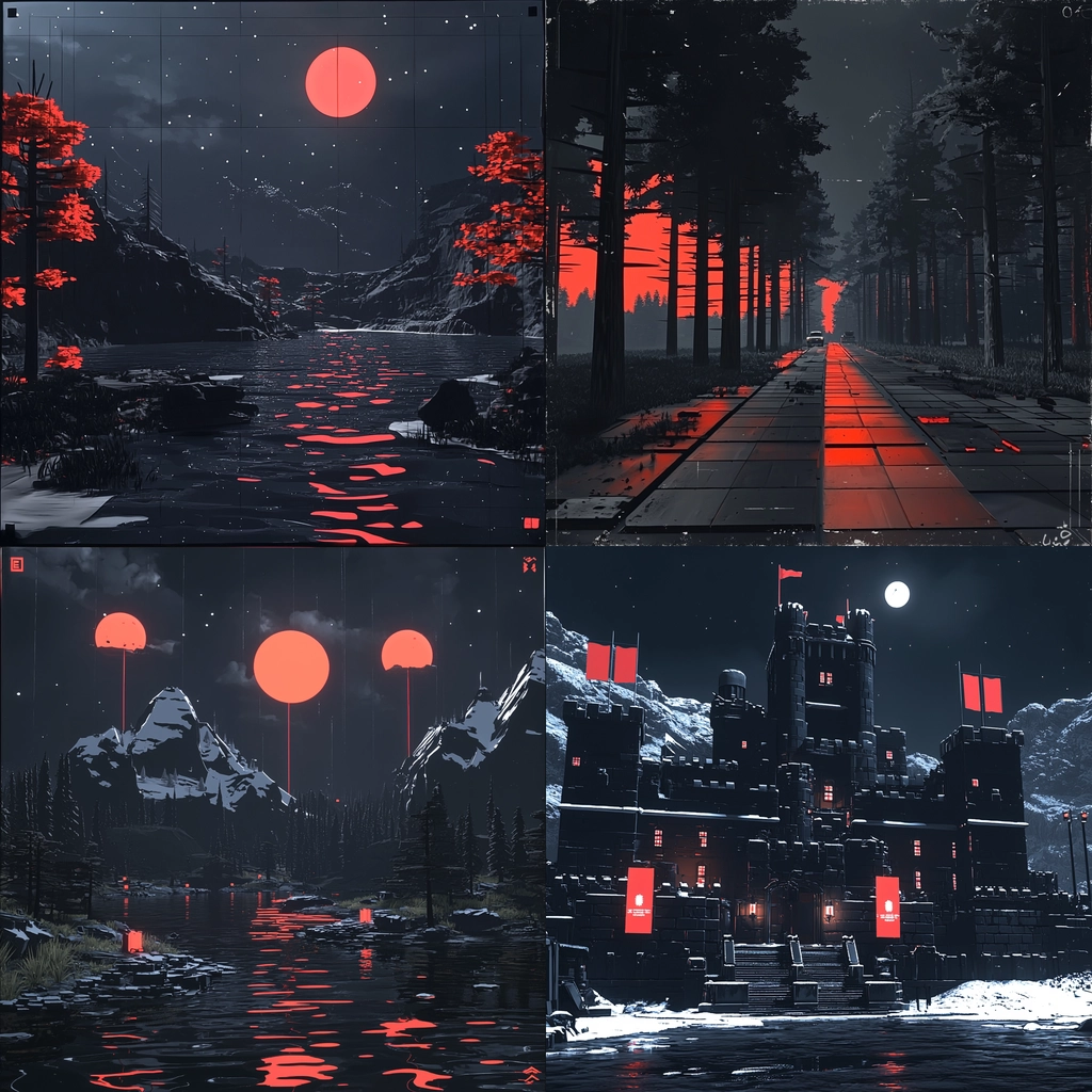 The dominance of black is punctuated by intense red accents, creating stark contrasts within structured compositions.