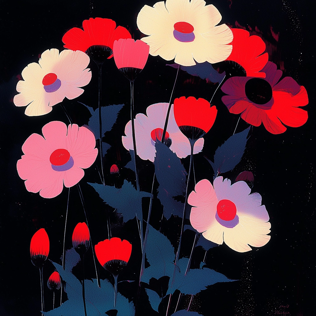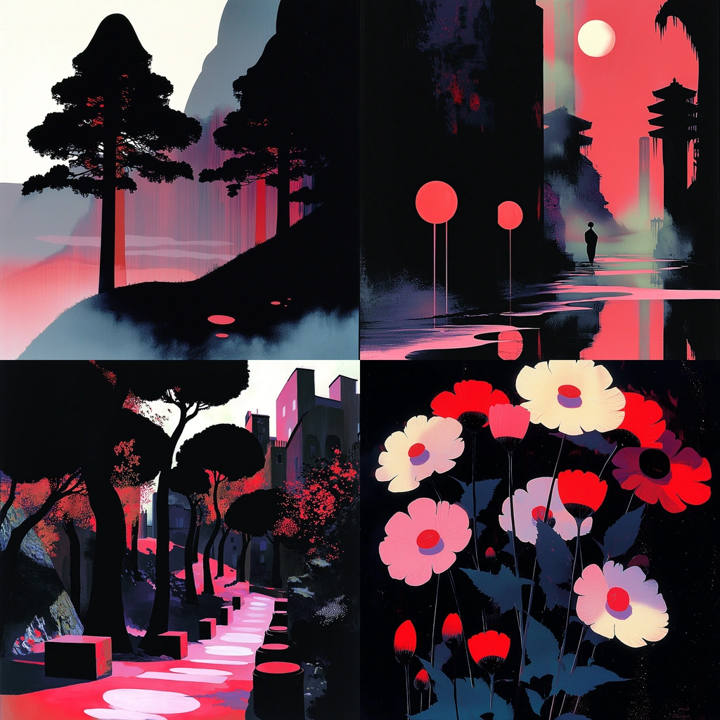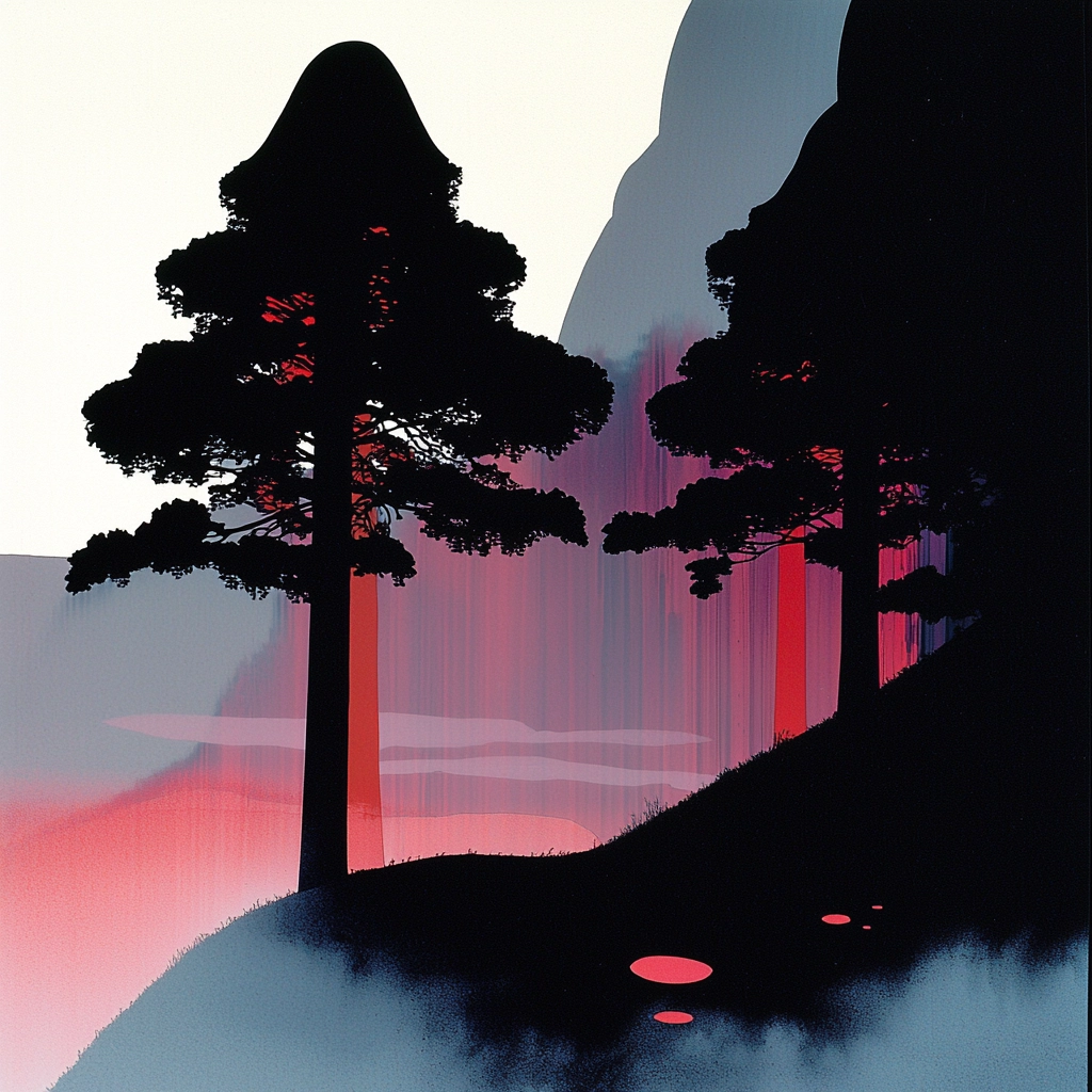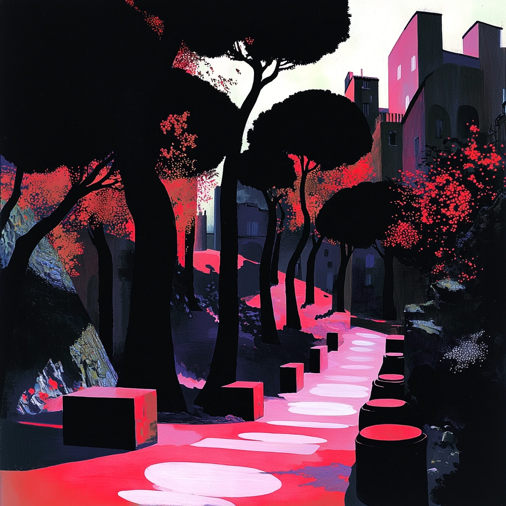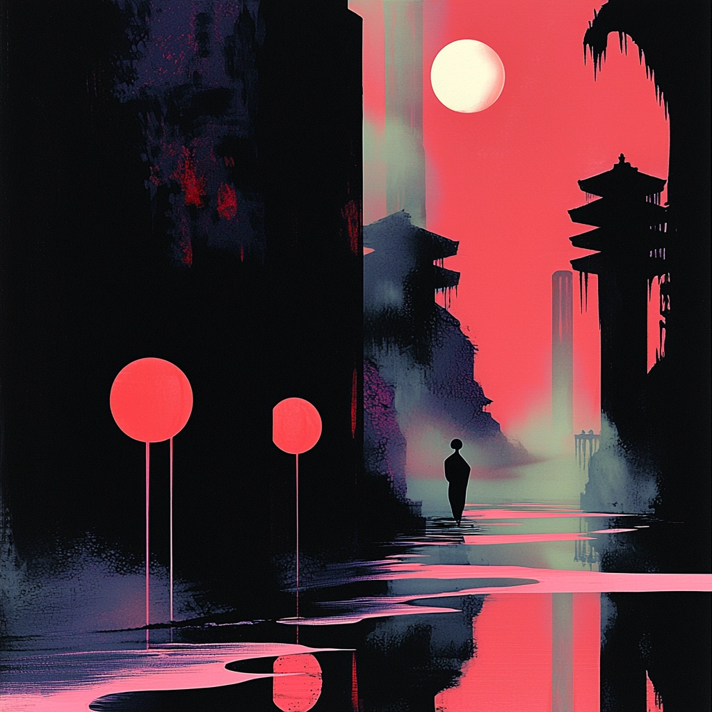 The artwork utilizes strong contrast between dark silhouettes and vivid colors, with an emphasis on glowing light effects and sharp outlines that create distinct spatial depth and atmospheric texture.