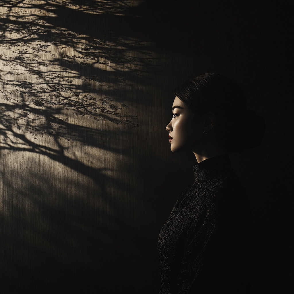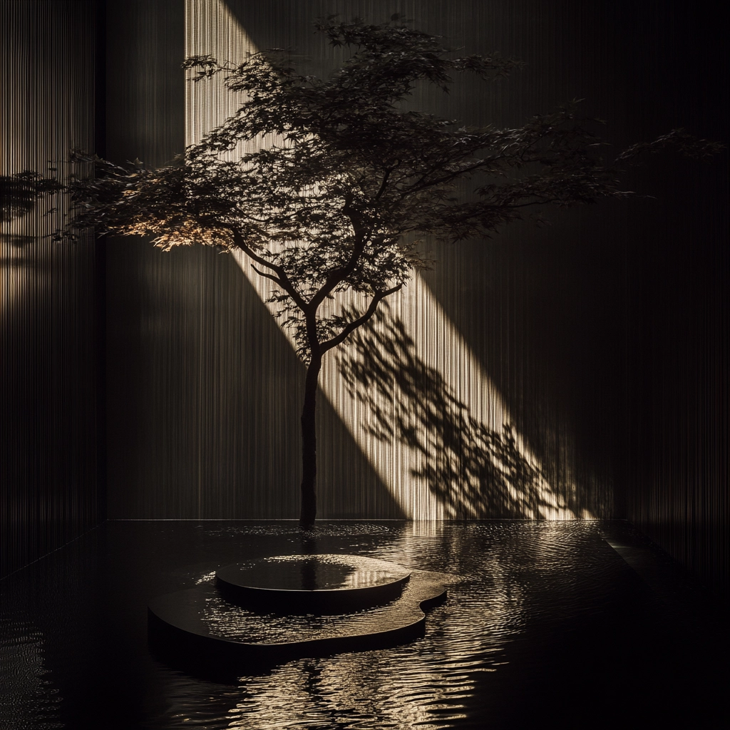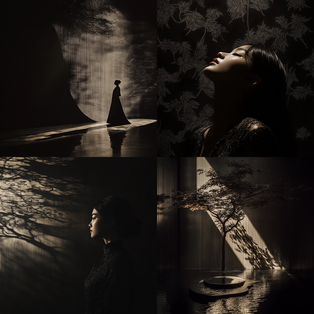 The lighting is meticulously controlled, casting intricate shadows and highlights that enhance the spatial depth. Rich, dark color palettes, combined with textured surfaces, evoke a sense of layered dimensionality and contrast.