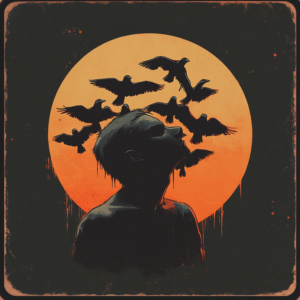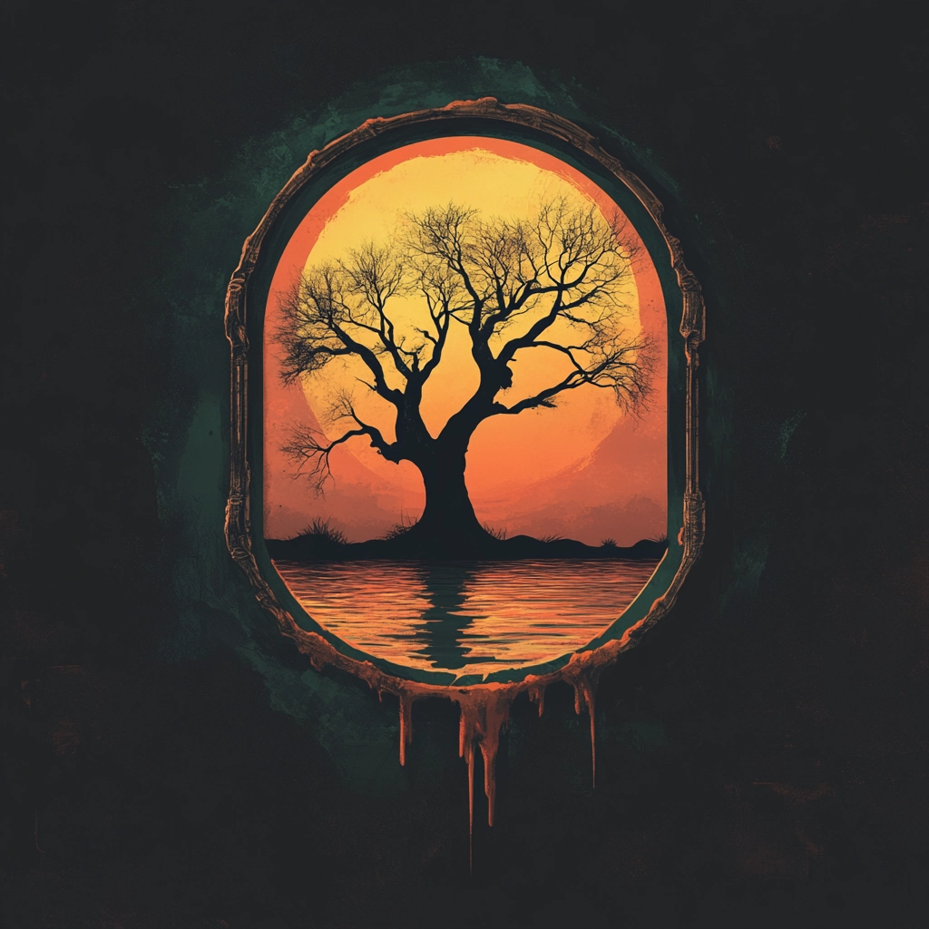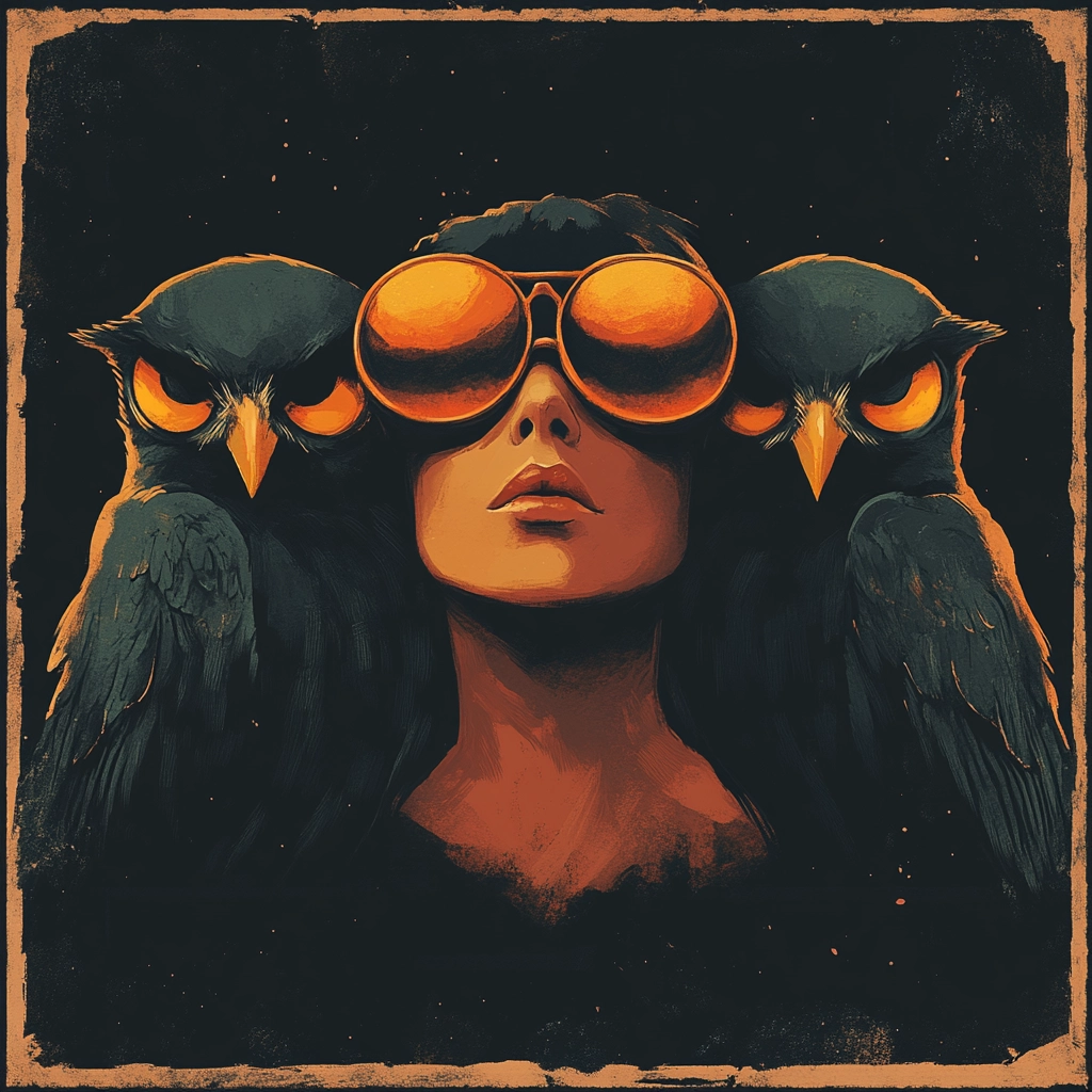 High contrast lighting outlines shapes against glowing circular forms. The dominant use of black enhances spatial contrast and focuses attention on central elements, with textures evoking a painted finish.