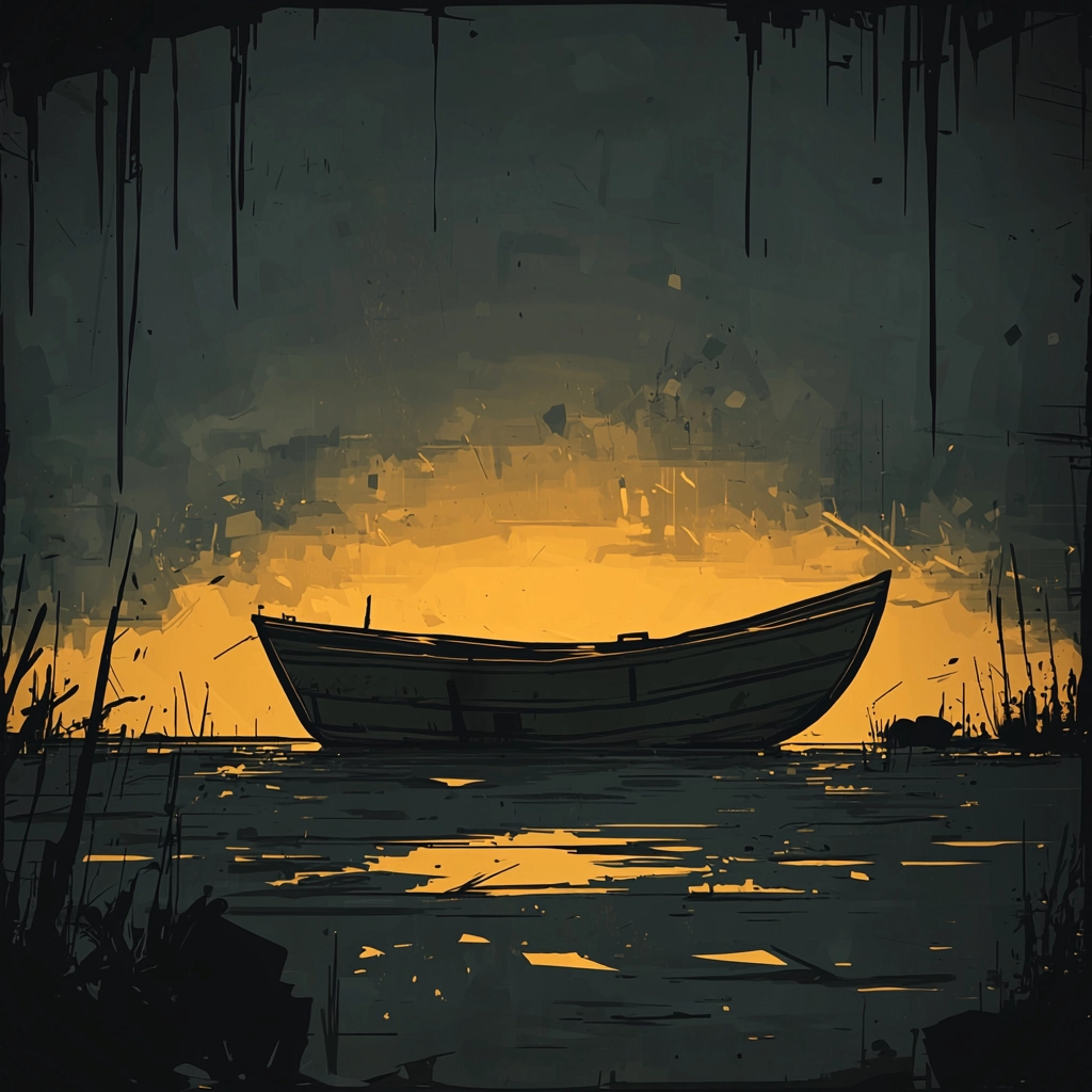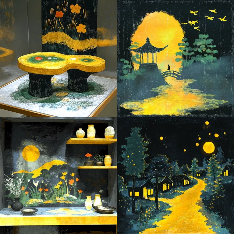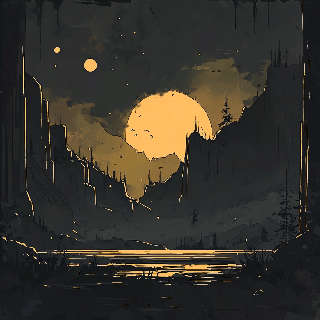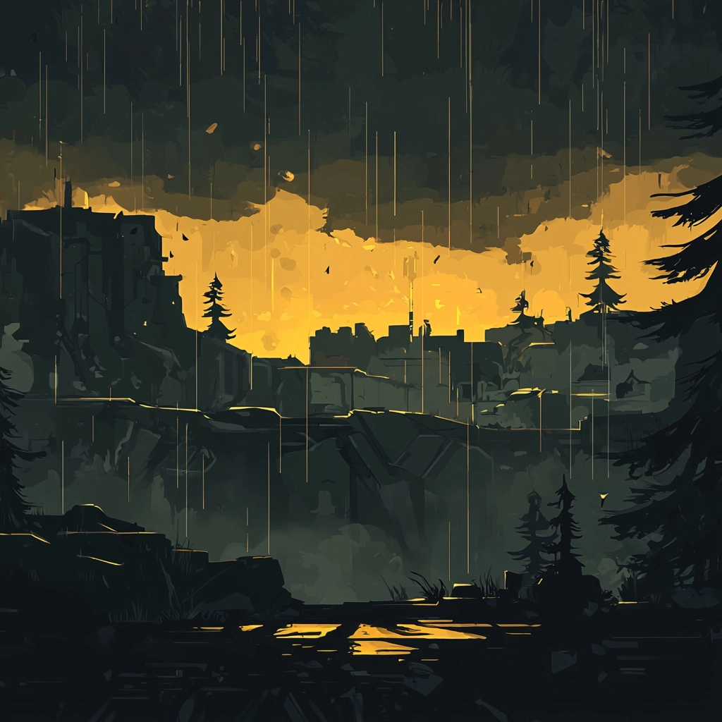 The composition contrasts black silhouettes with a glowing yellow background, highlighting stark lighting effects. The texture is rough yet detailed, providing depth through shadows and illumination interplay.