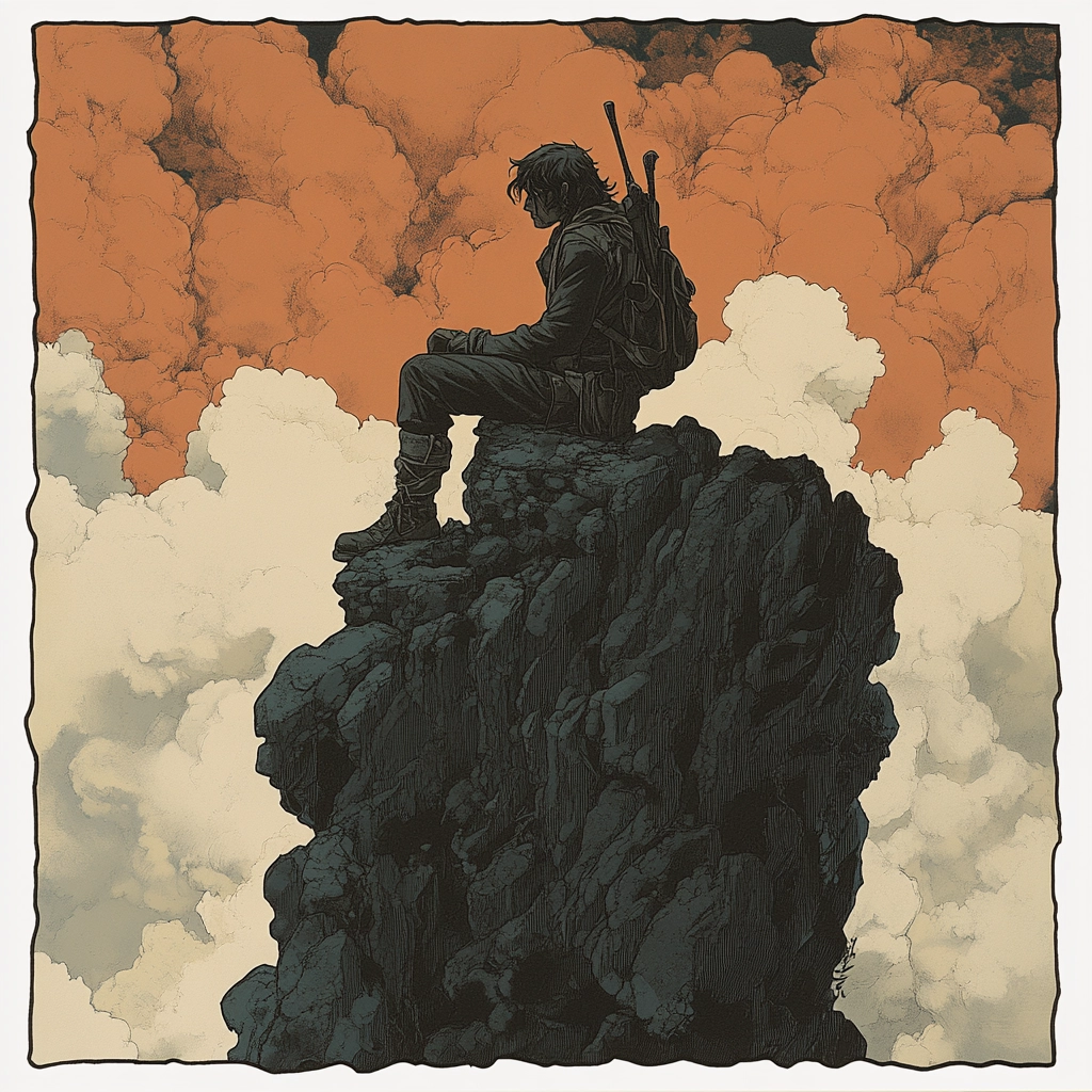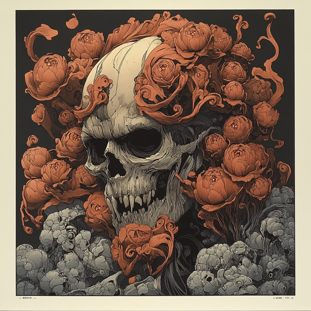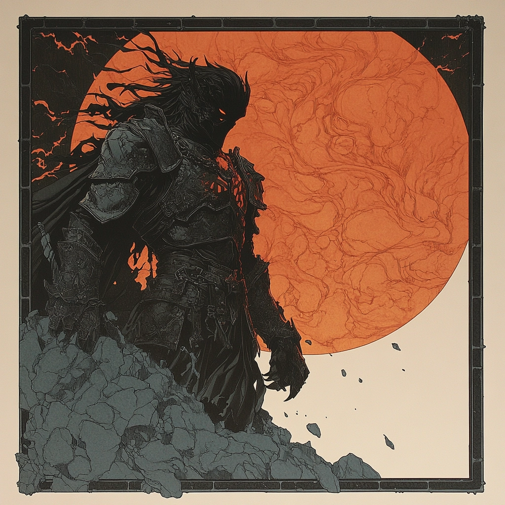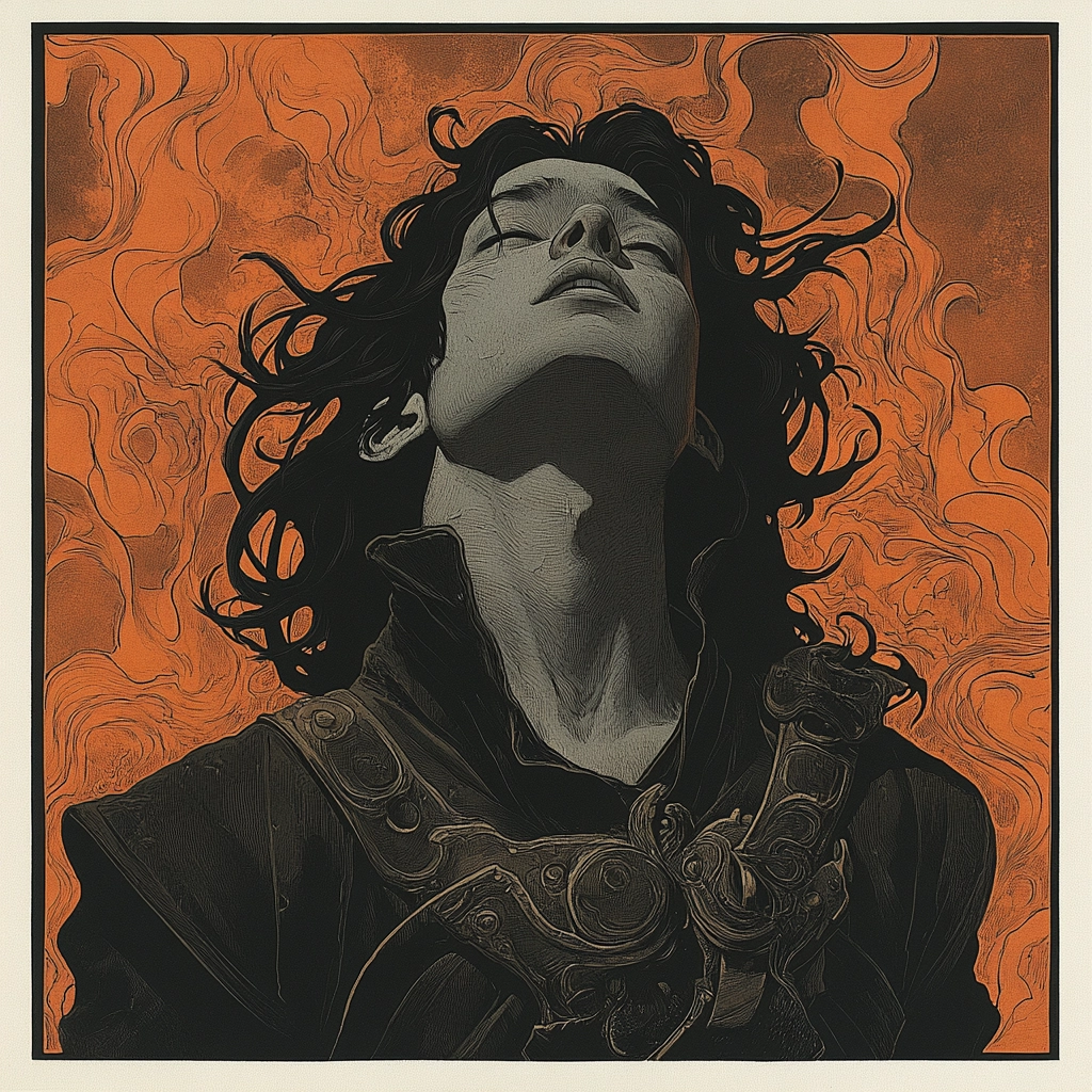Utilizes deep shadows and vibrant orange for contrast, creating strong spatial dimensions with layered textures that articulate fine details in a graphic, illustrative manner.