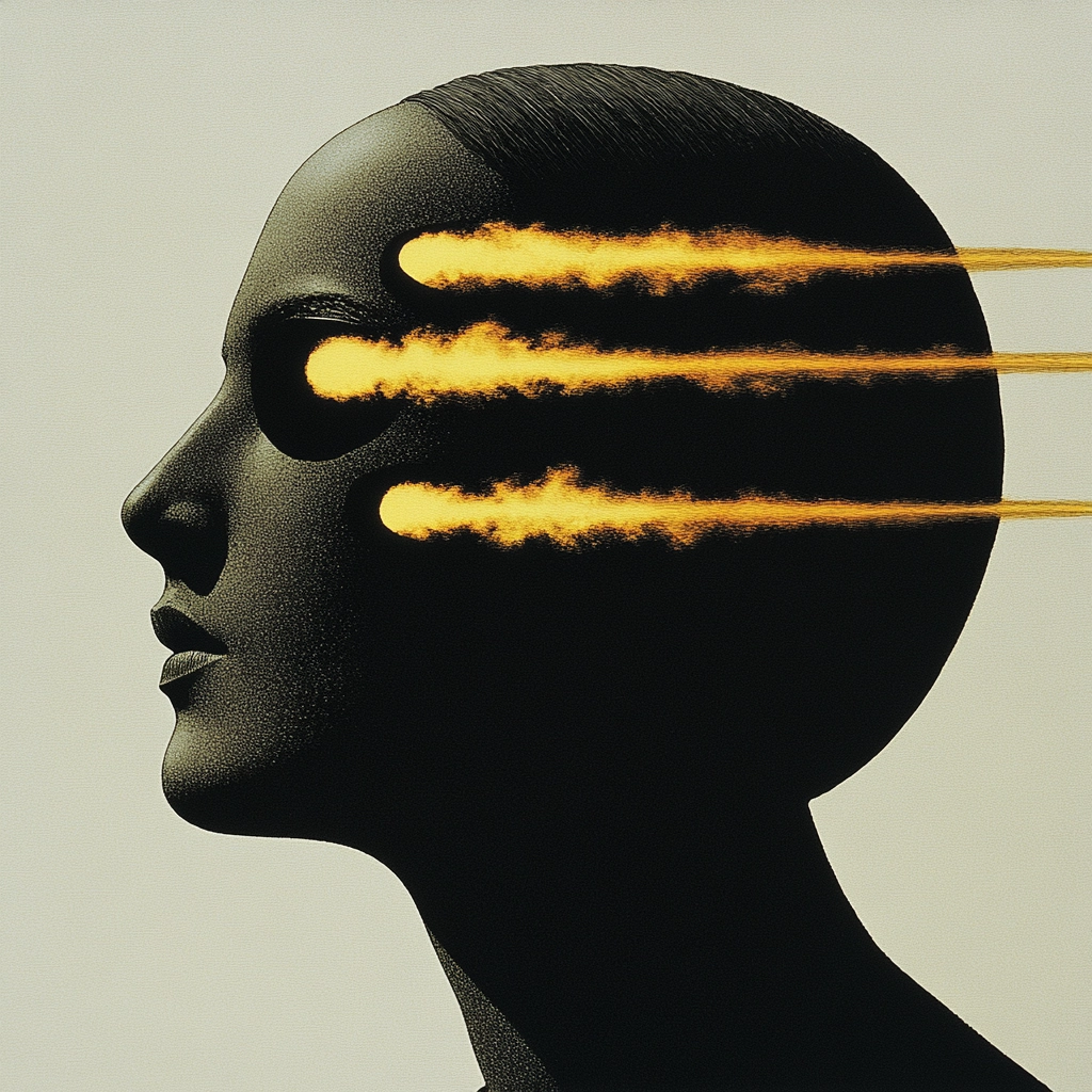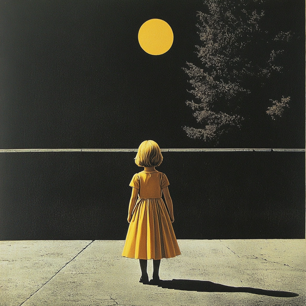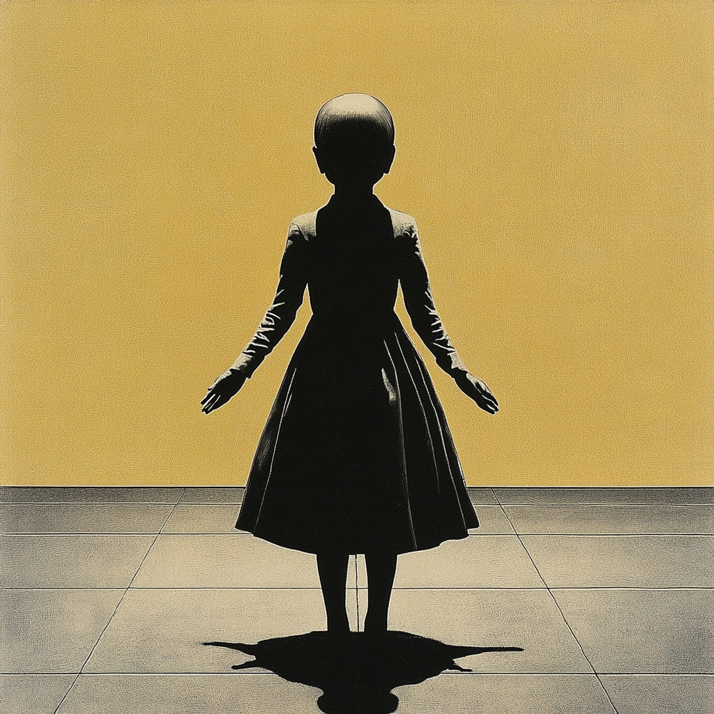 The lighting features stark contrasts between shadowed figures and luminous yellow environments. The color palette is primarily black and yellow, creating dramatic visual tension. The texture is smooth, enhancing the silhouettes' crisp outlines.