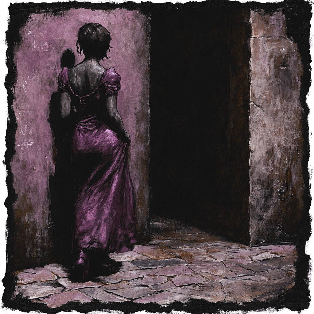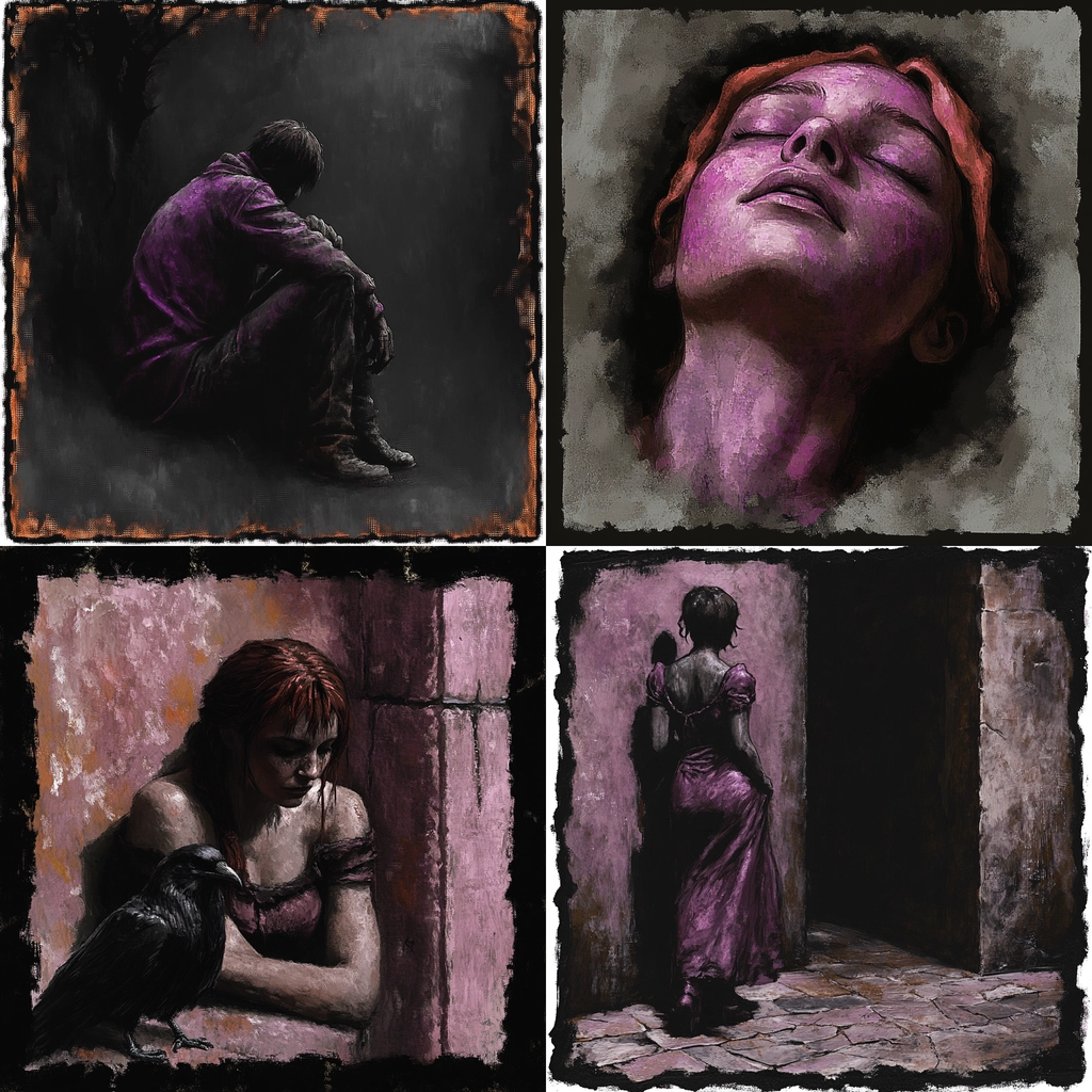 The artwork employs deep shadowing and multi-layered textures to enhance spatial depth, with rich purple and gray creating visual contrast. The brushstrokes convey realism, while the lighting effects add dimensionality.