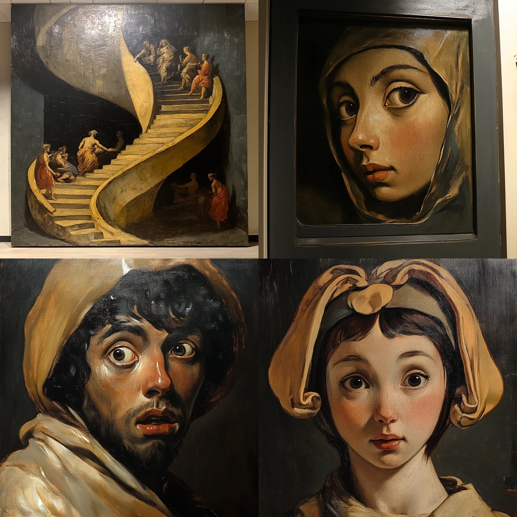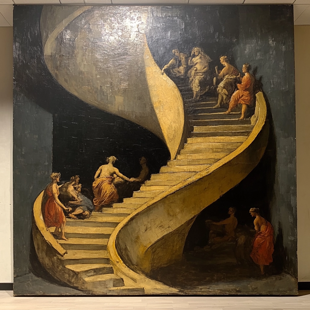 The lighting creates dramatic contrasts, highlighting the forms against deep shadows. Warm browns and beige provide a rich texture, with curved and linear structures amplifying spatial depth. The surface appears smooth, with subtle texture adding to the classical feel.