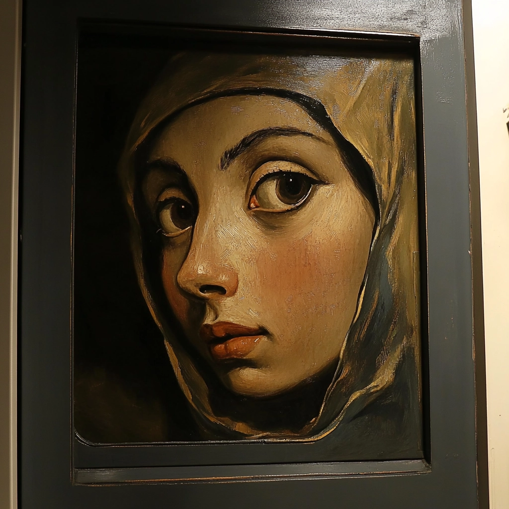 The composition uses contrasting dark and muted earth tones, enhancing depth and traditional aesthetics.