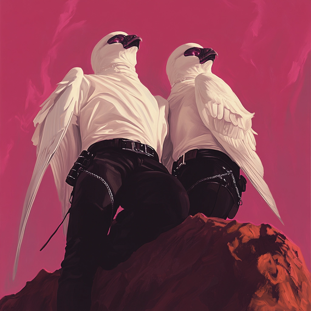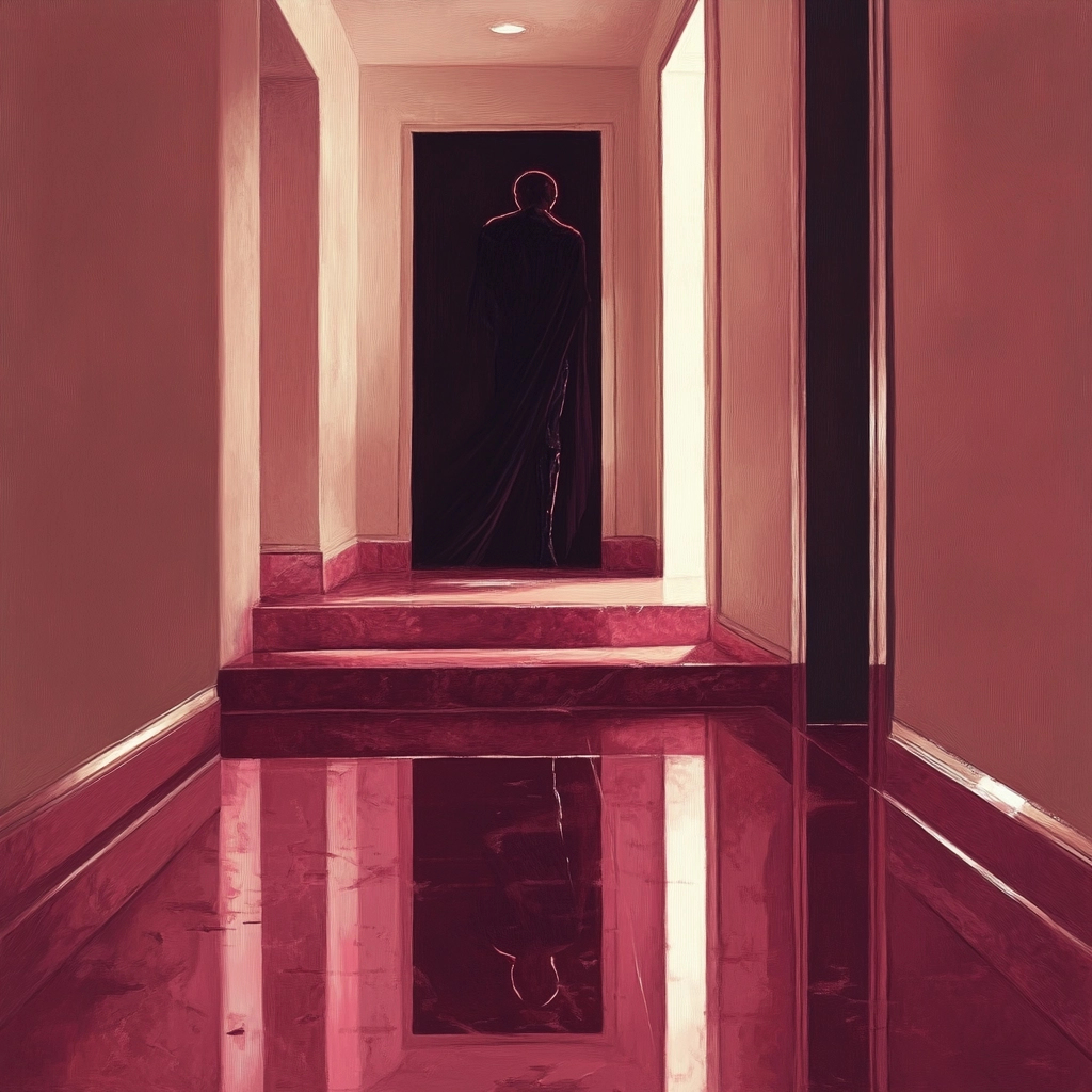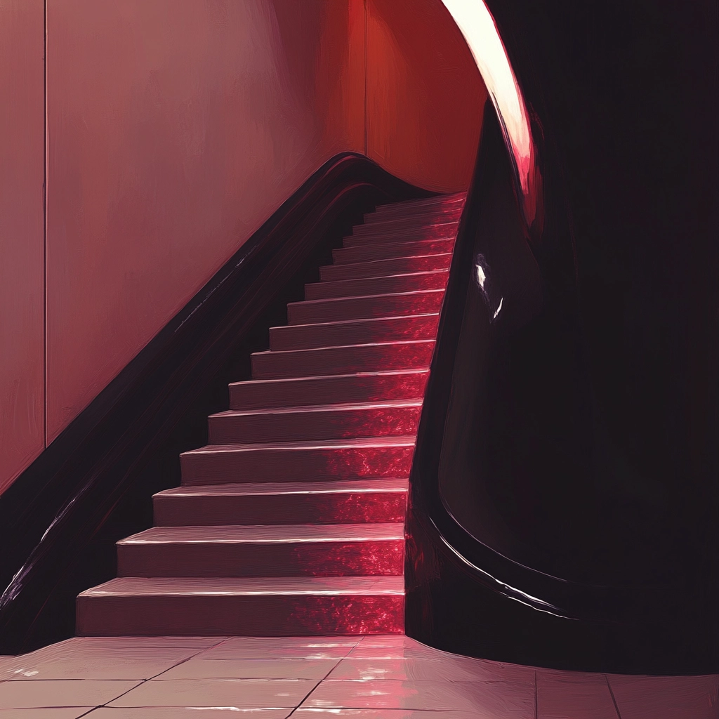 Sharp lighting enhances the sense of depth, while the colors add drama and surreal qualities. Glossy textures are depicted with high realism, creating a palpable sense of space and materiality.