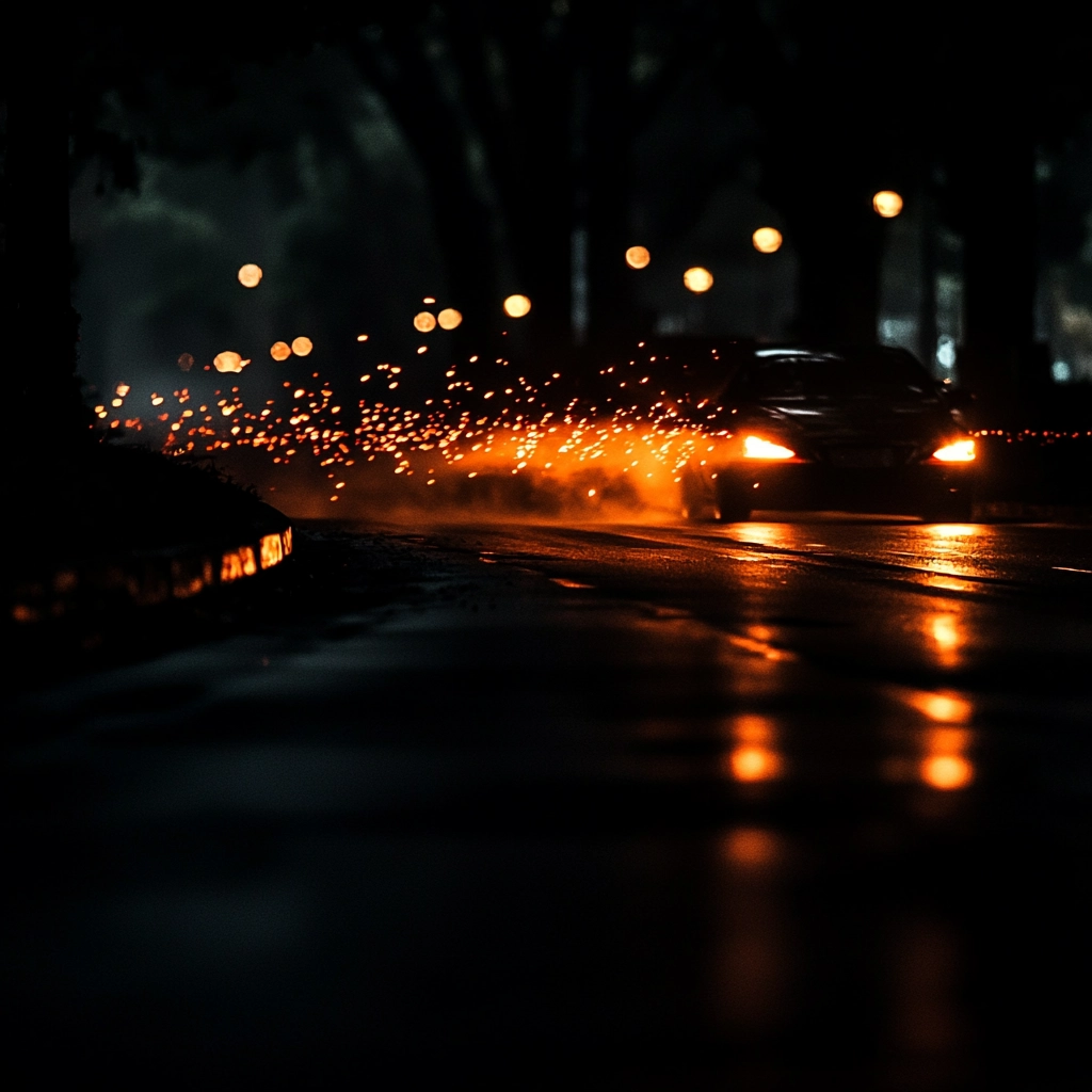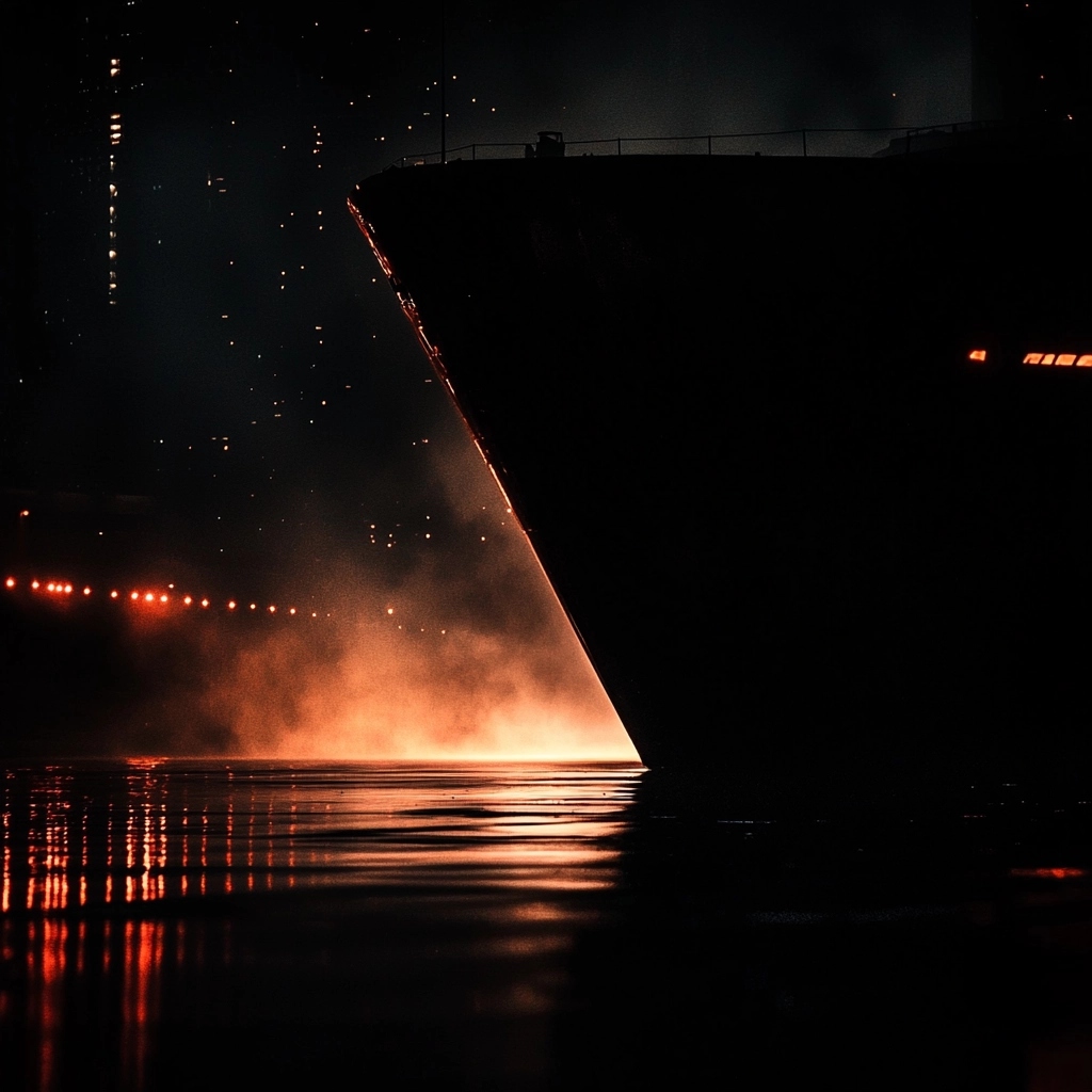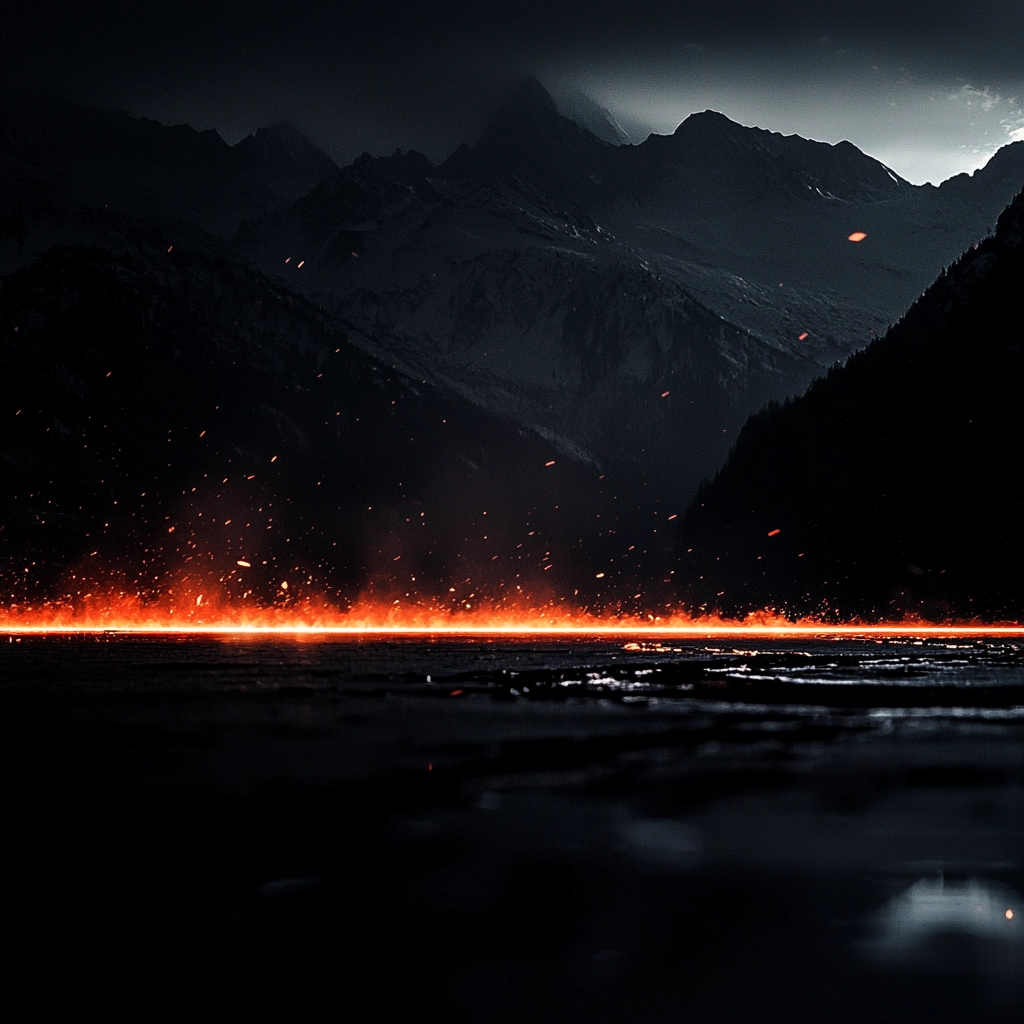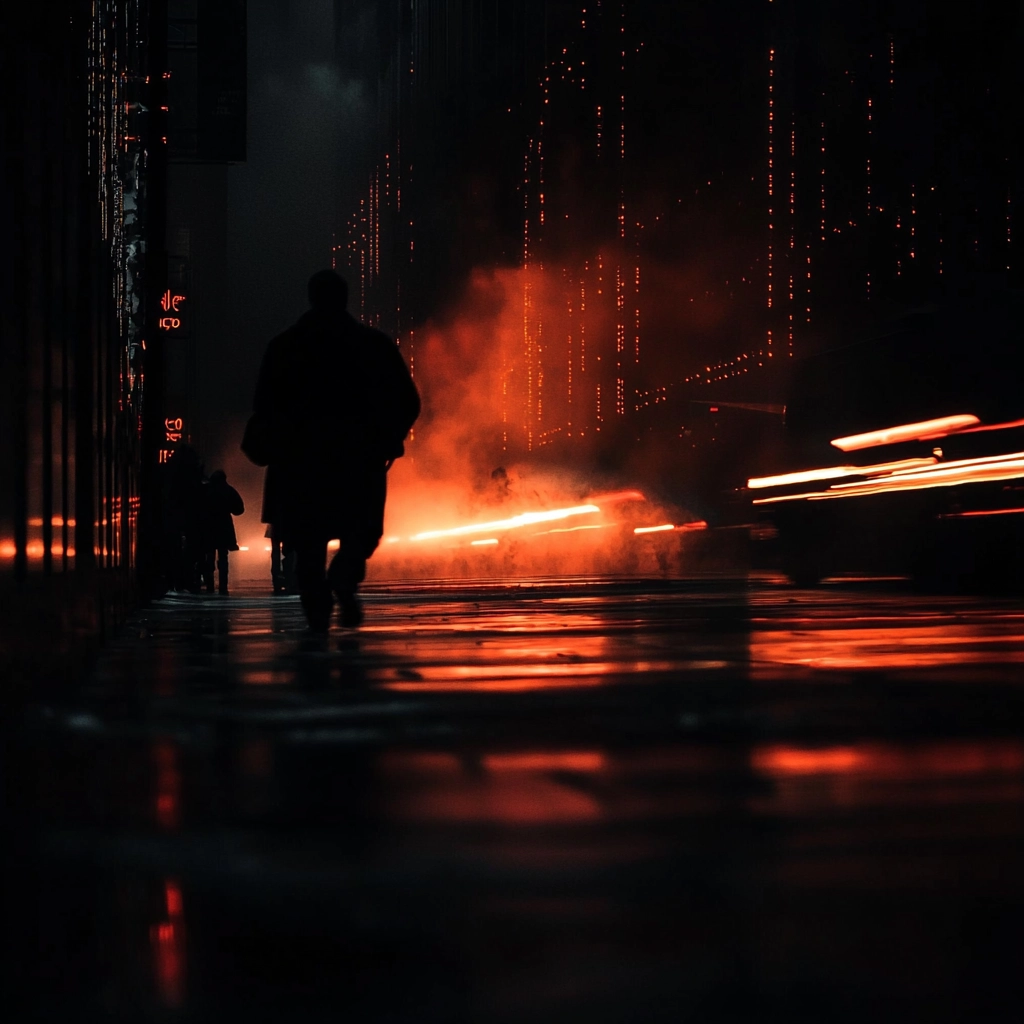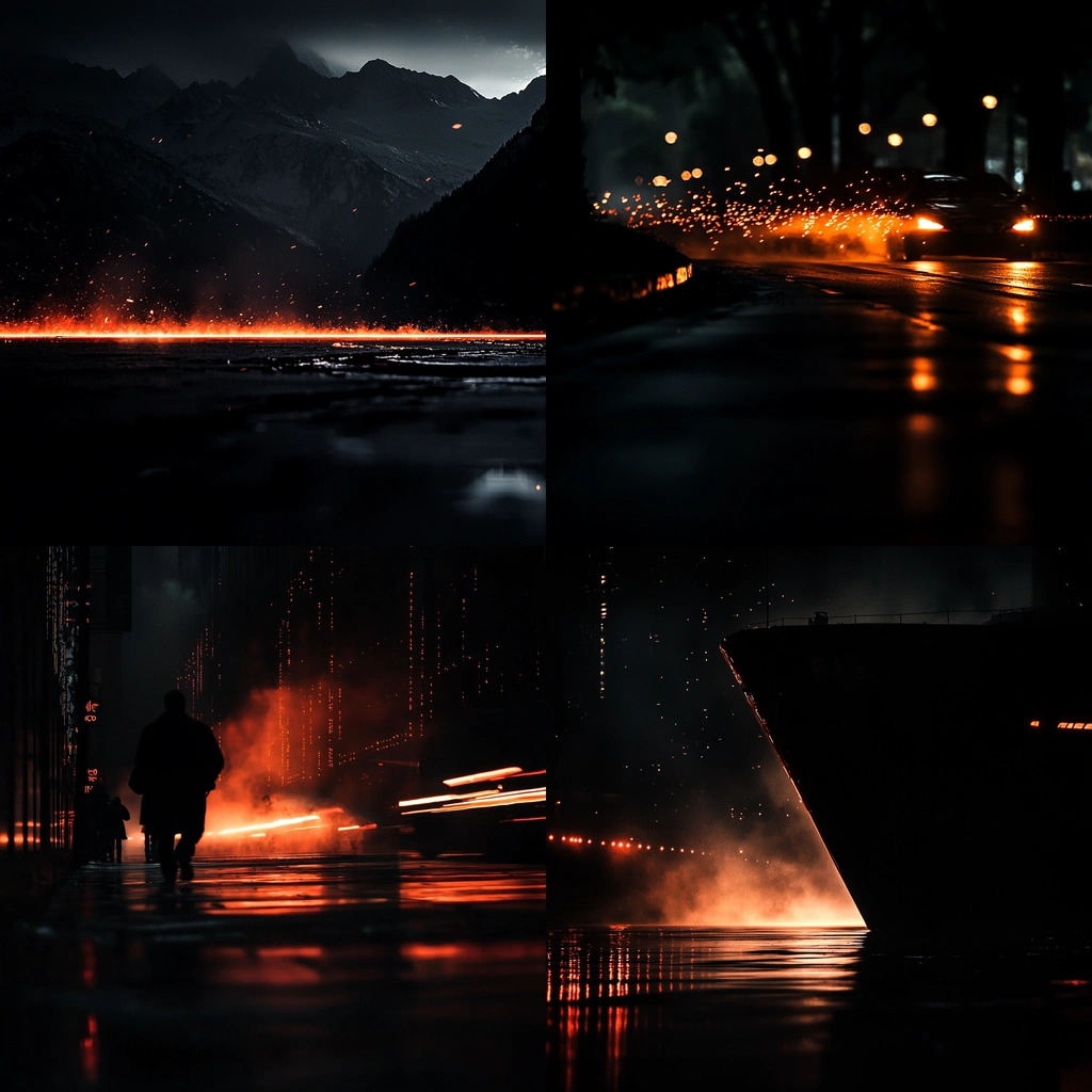 The composition employs intense lighting effects, casting strong highlights amid darkness, with a notable contrast between warm orange glows and shadowed environments, enhancing depth through texture and reflective surfaces.