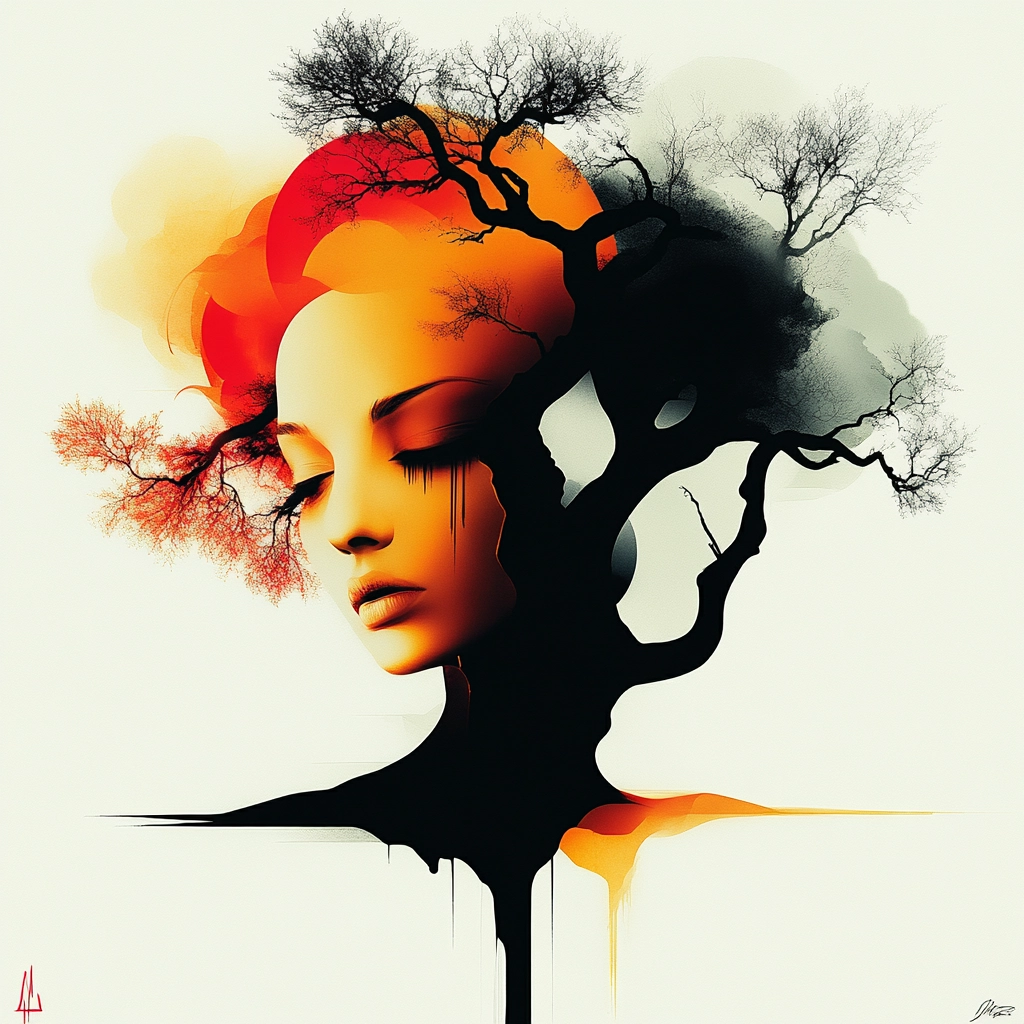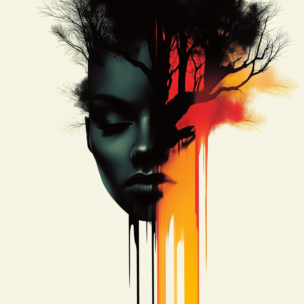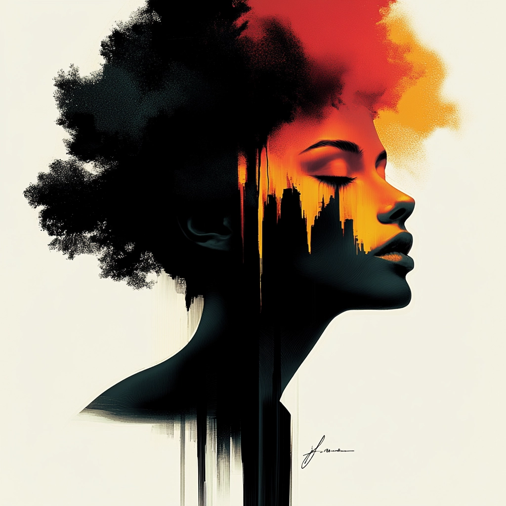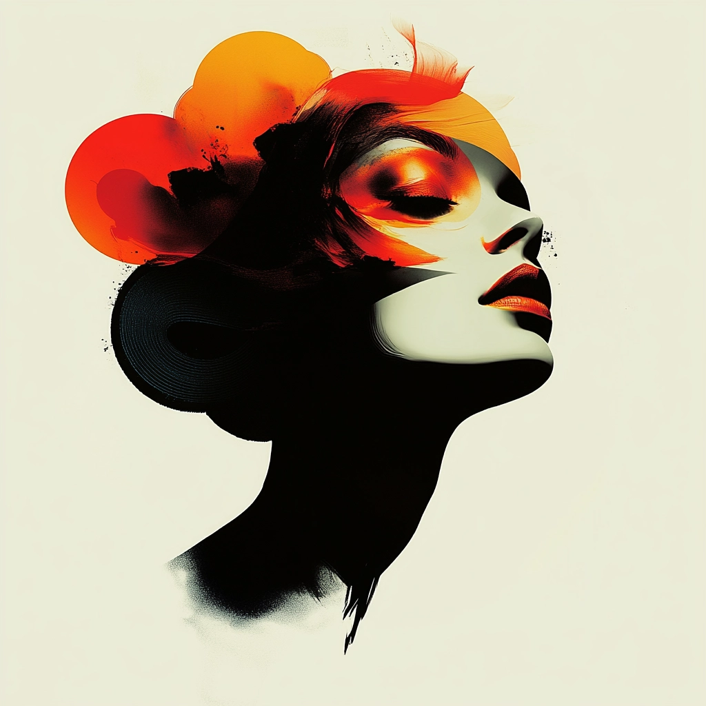 This composition uses dense black to create sharply defined silhouettes against splashes of red and orange, which provides an intense visual contrast. Dimensional lighting and smooth texture enrich the surface, highlighting dynamic form and movement.