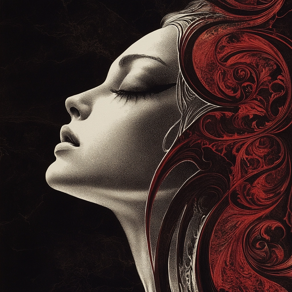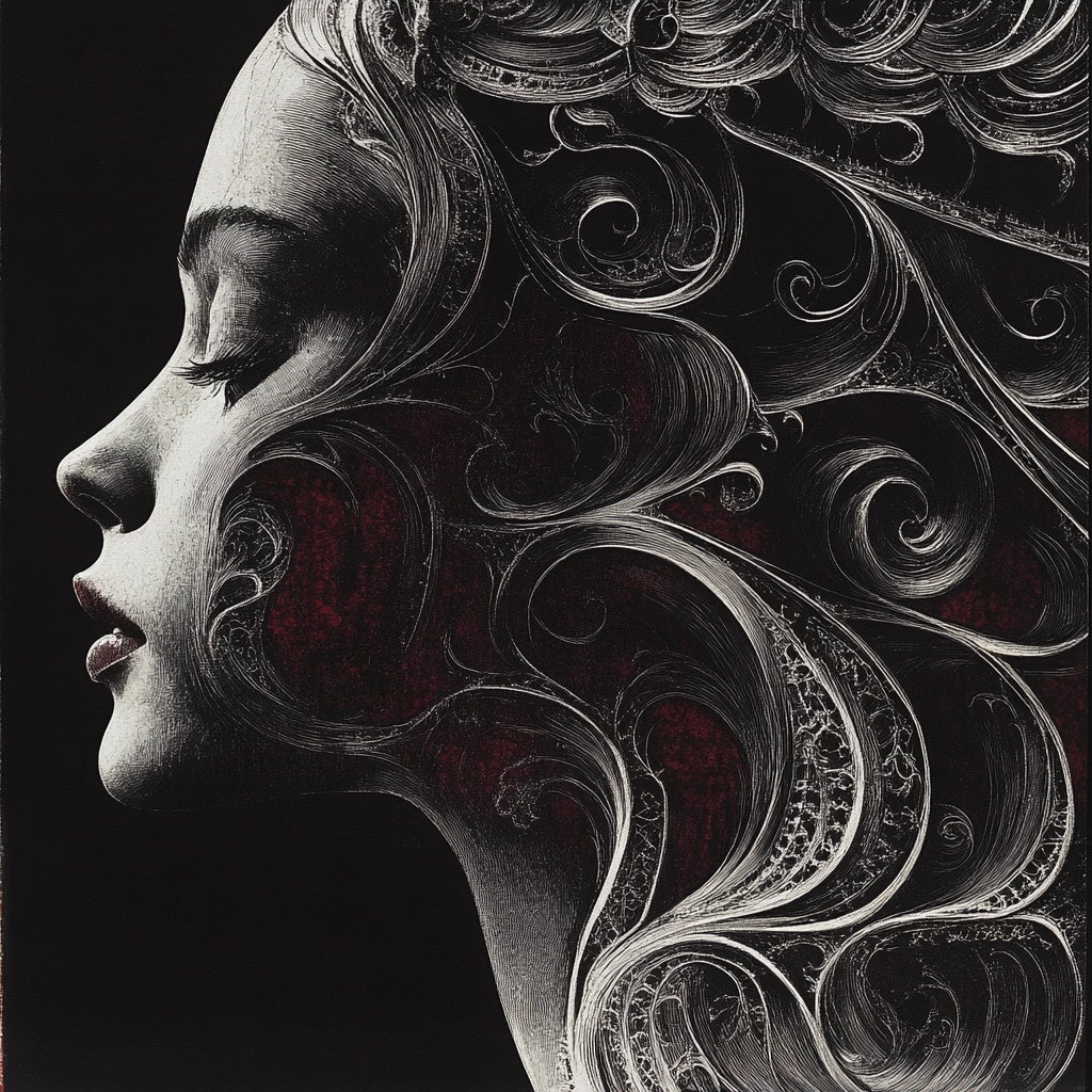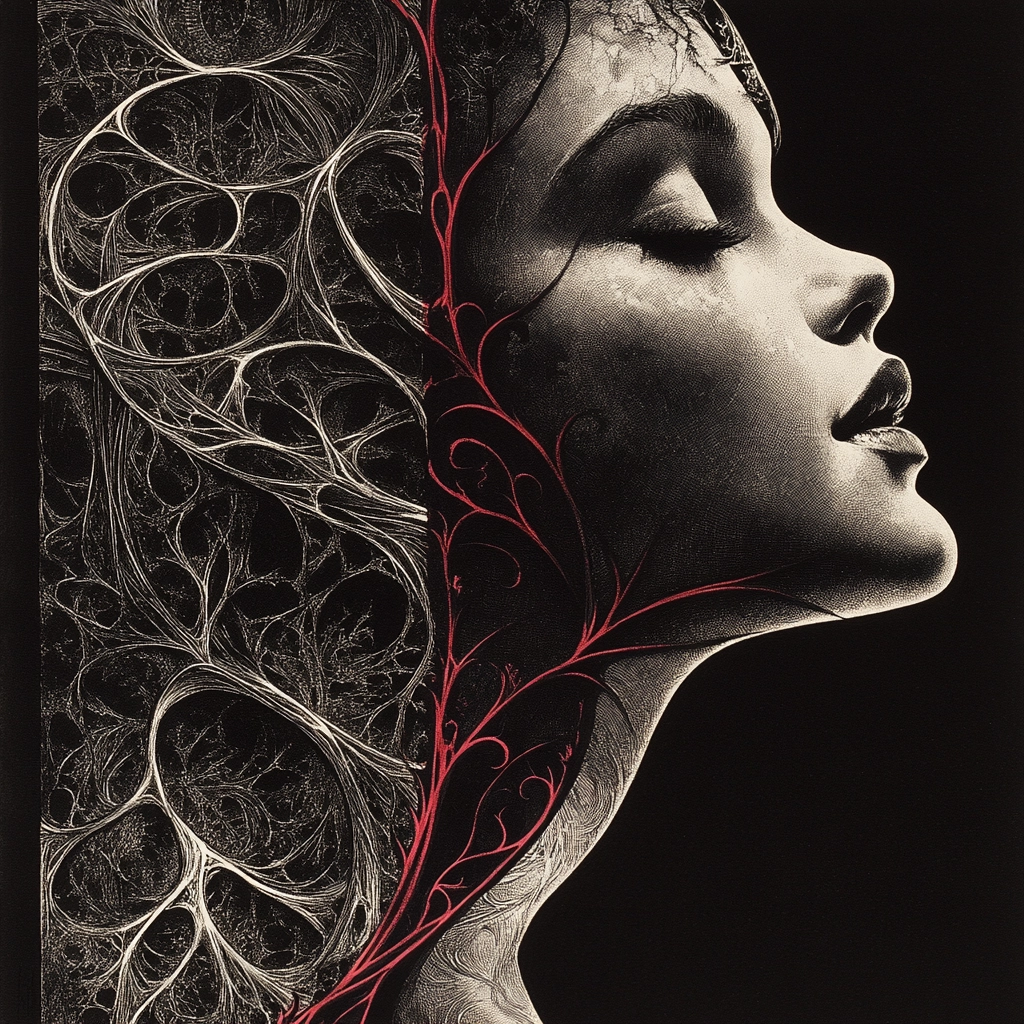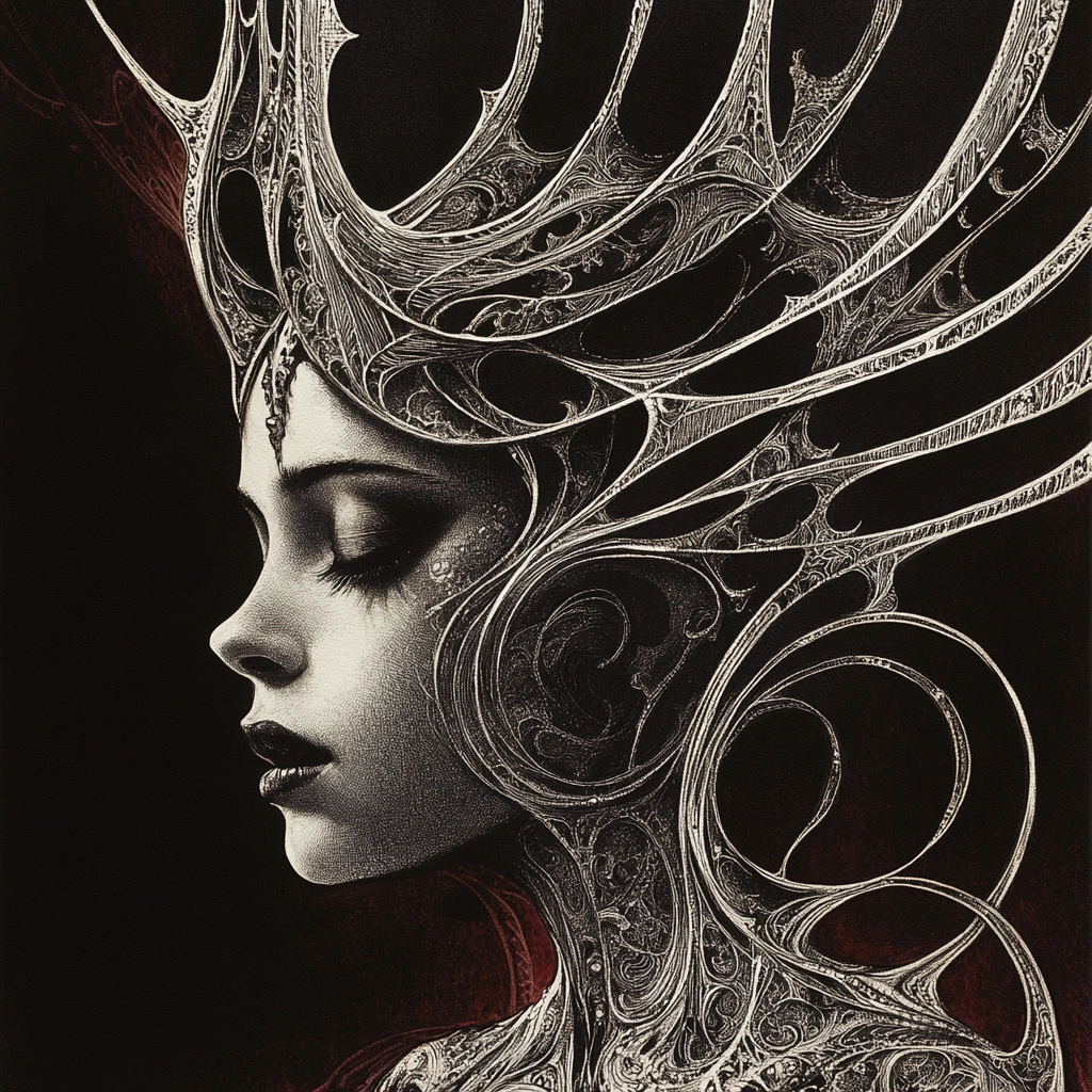 The use of high contrast lighting creates a dramatic interplay between dark backgrounds and intricate white and red swirls. The space feels densely packed with these fine, wiry elements, giving a strong sense of texture and depth.