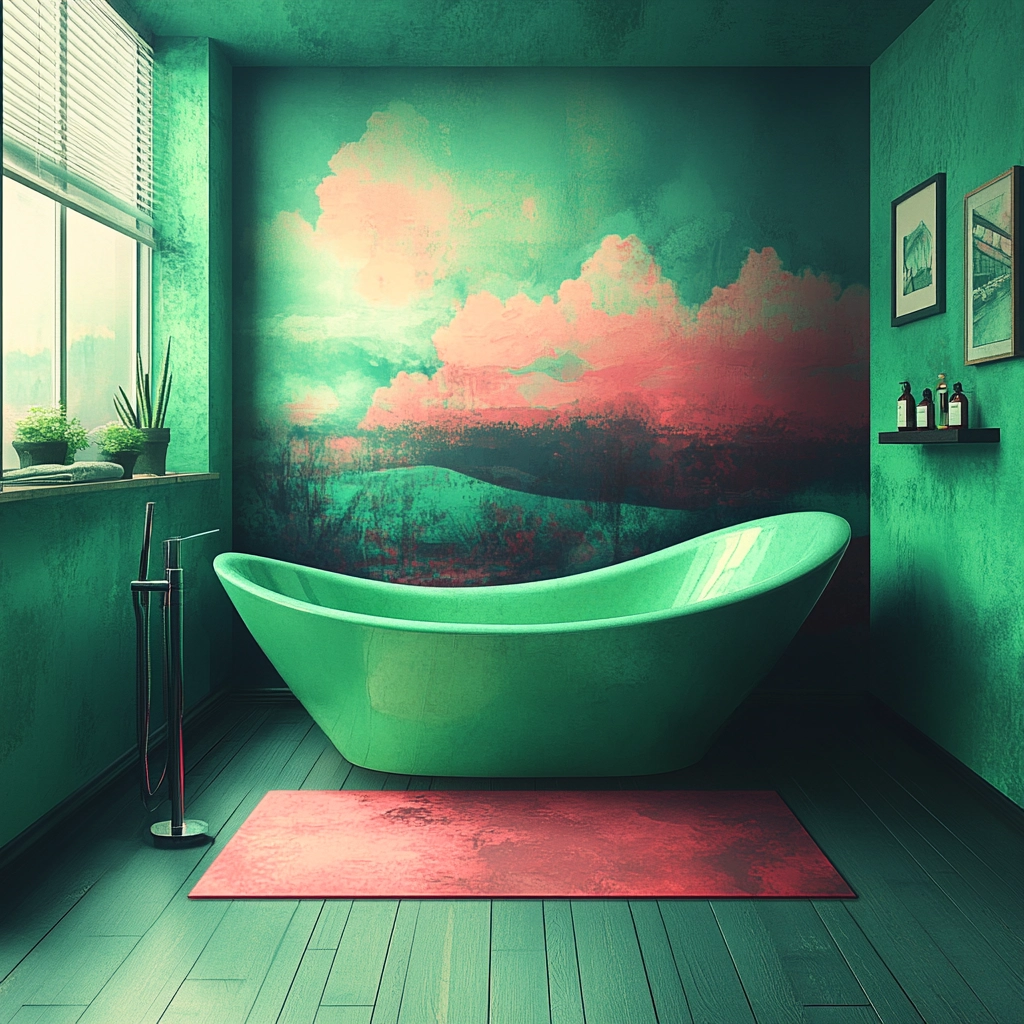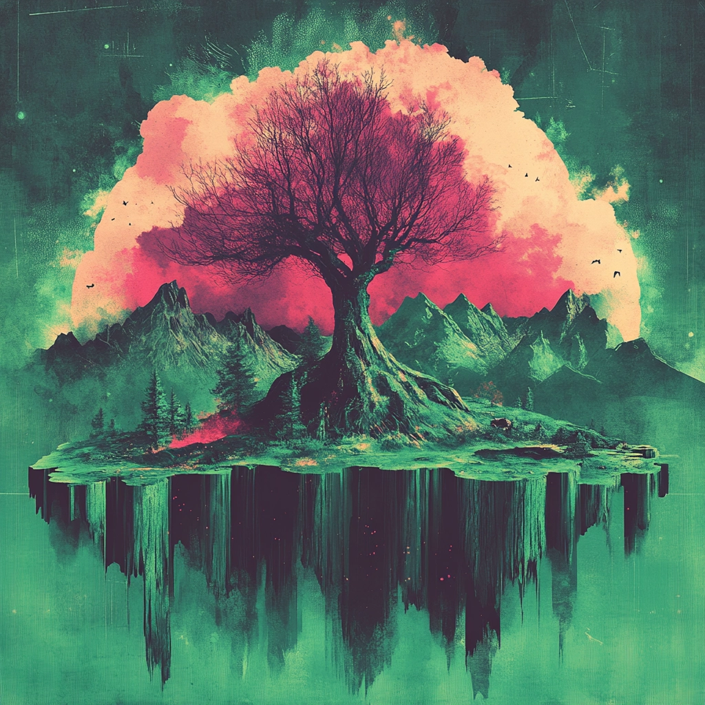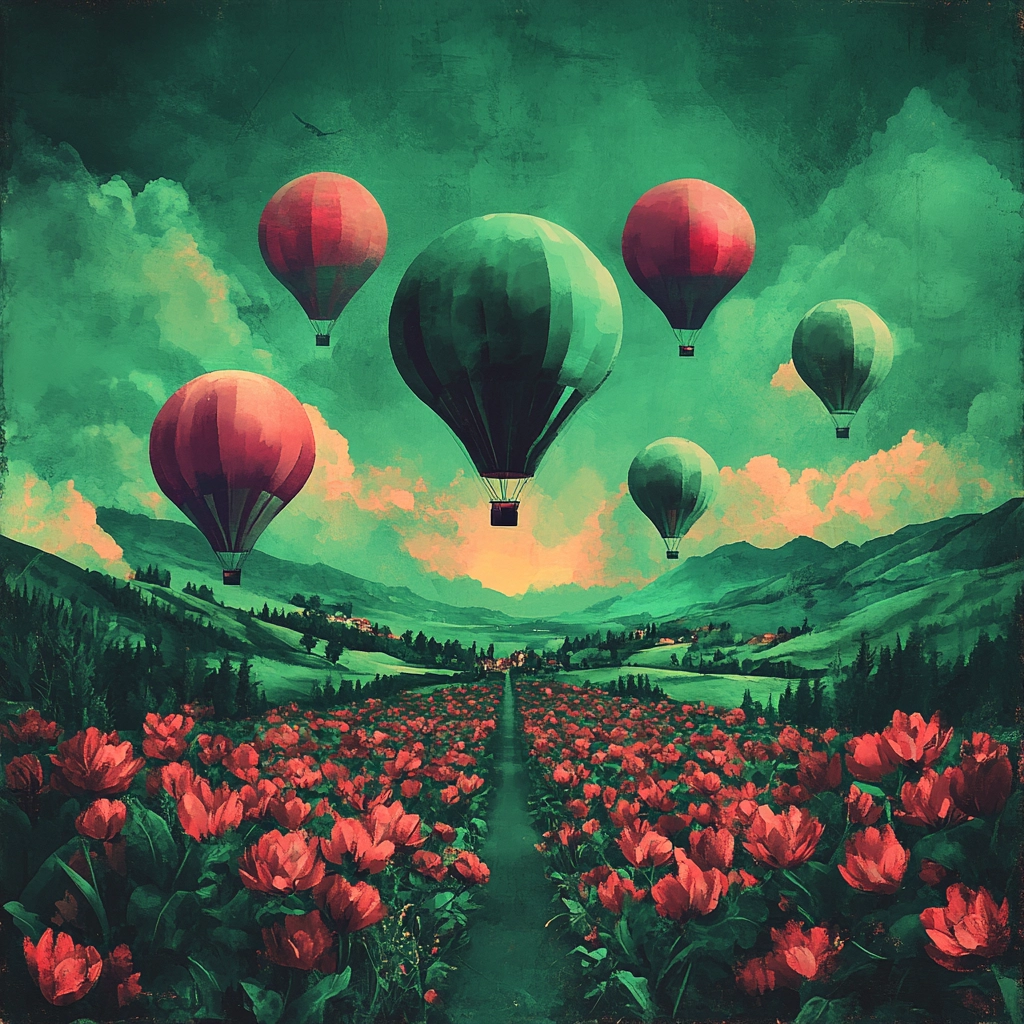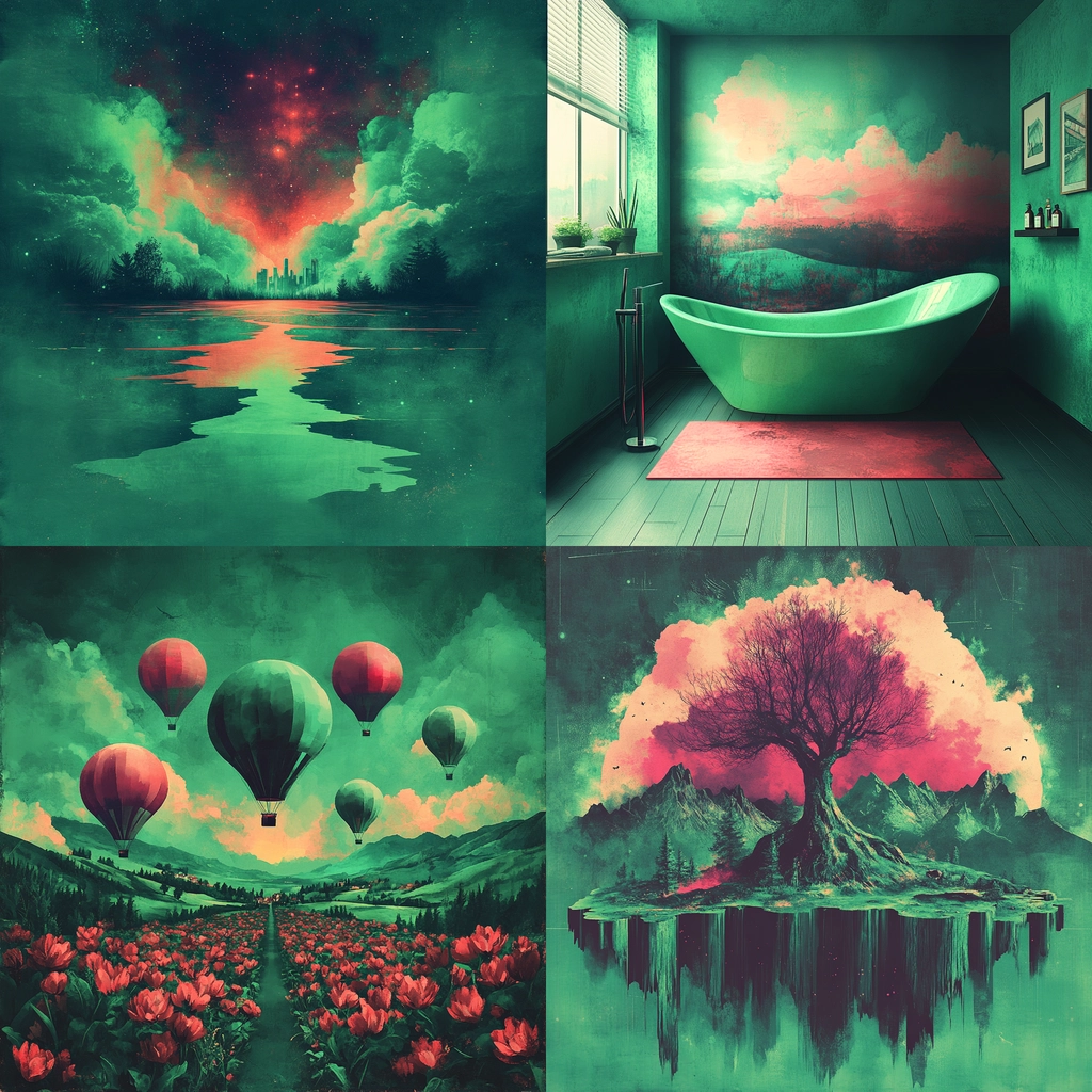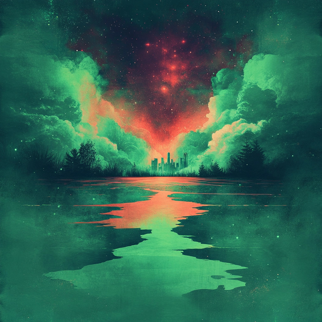 Contrasting green and red hues create a deep and dynamic visual effect, elevated by intricate spatial compositions and vivid textures.