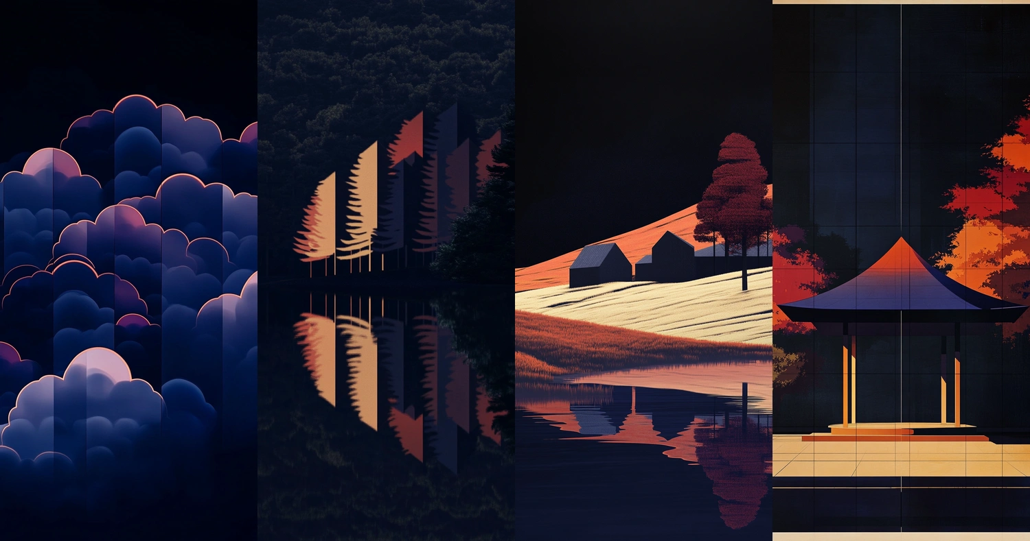 Dark, serene compositions with rich hues and reflective surfaces.