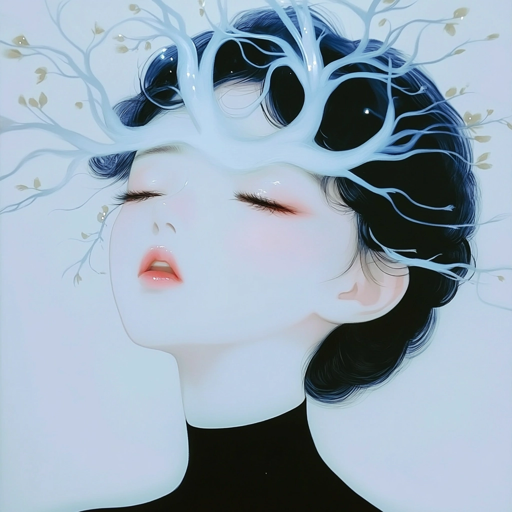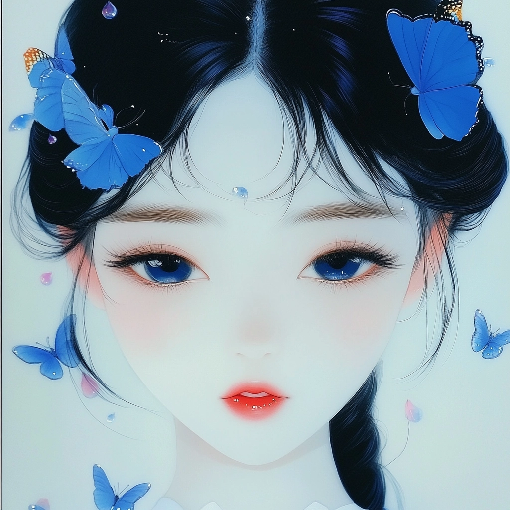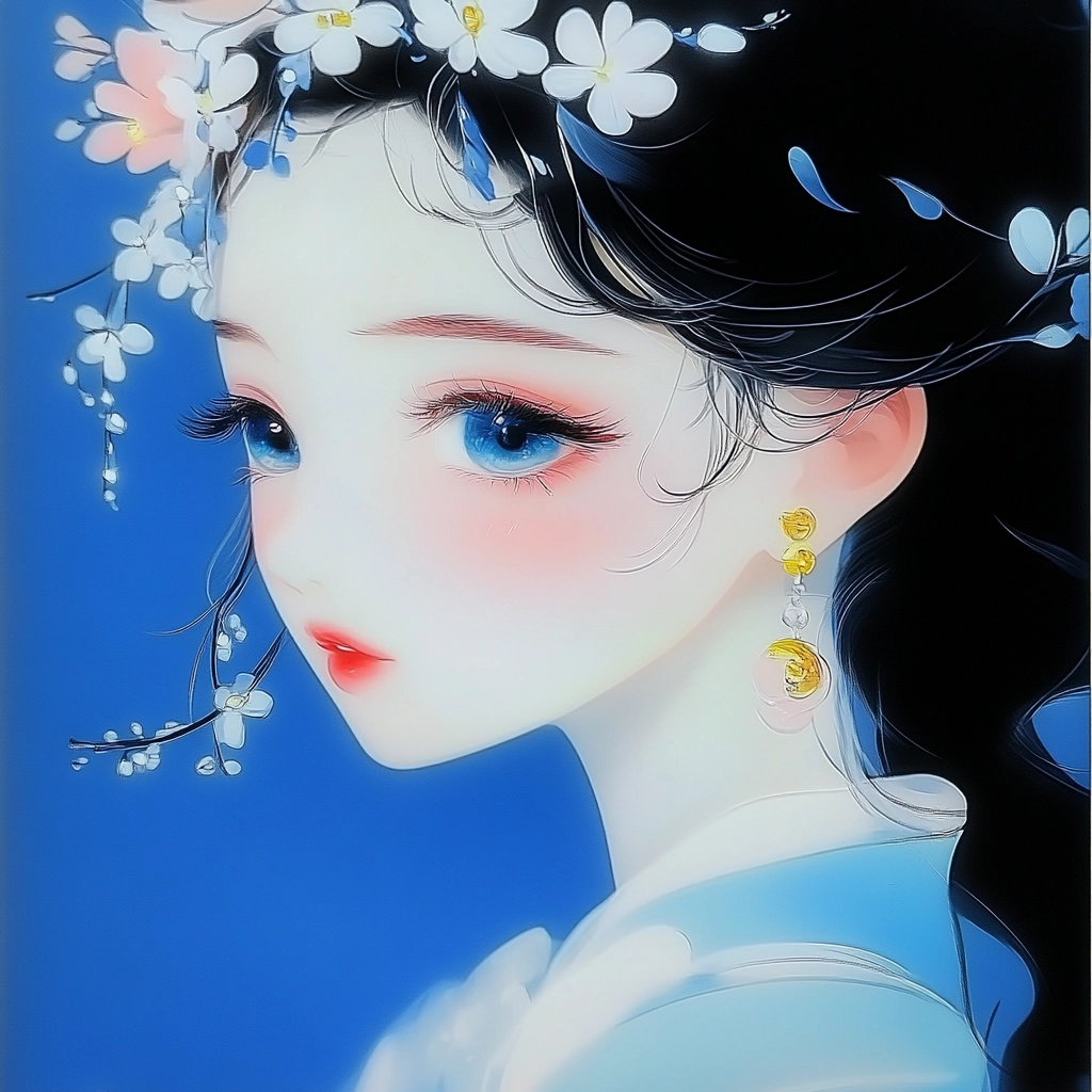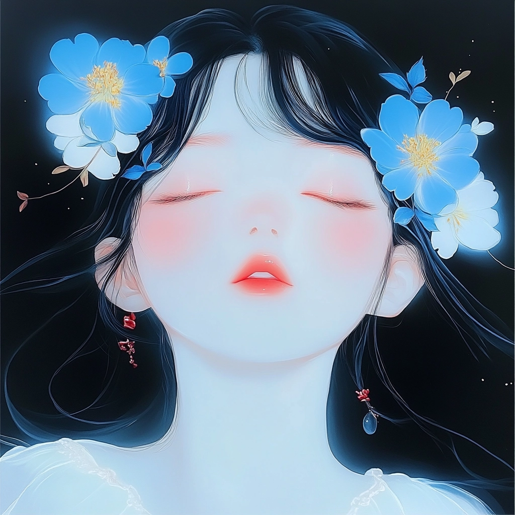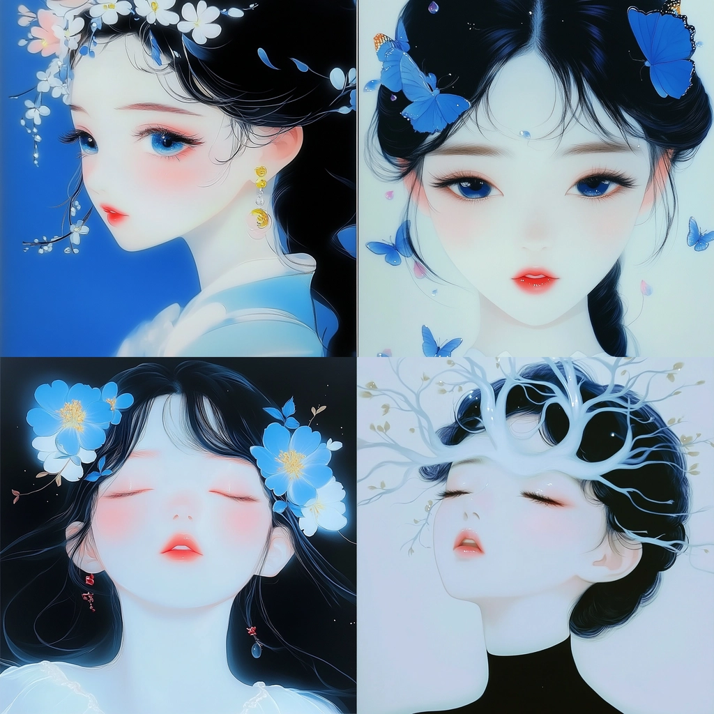 The lighting effects are soft and diffuse, creating a gentle glow. The colors are vibrant and well-balanced, particularly the bold blue against the soft white and black. The spatial sense is enhanced by the placement and layering of elements, giving a depth to the texture expression evident in the fine details of the flora.