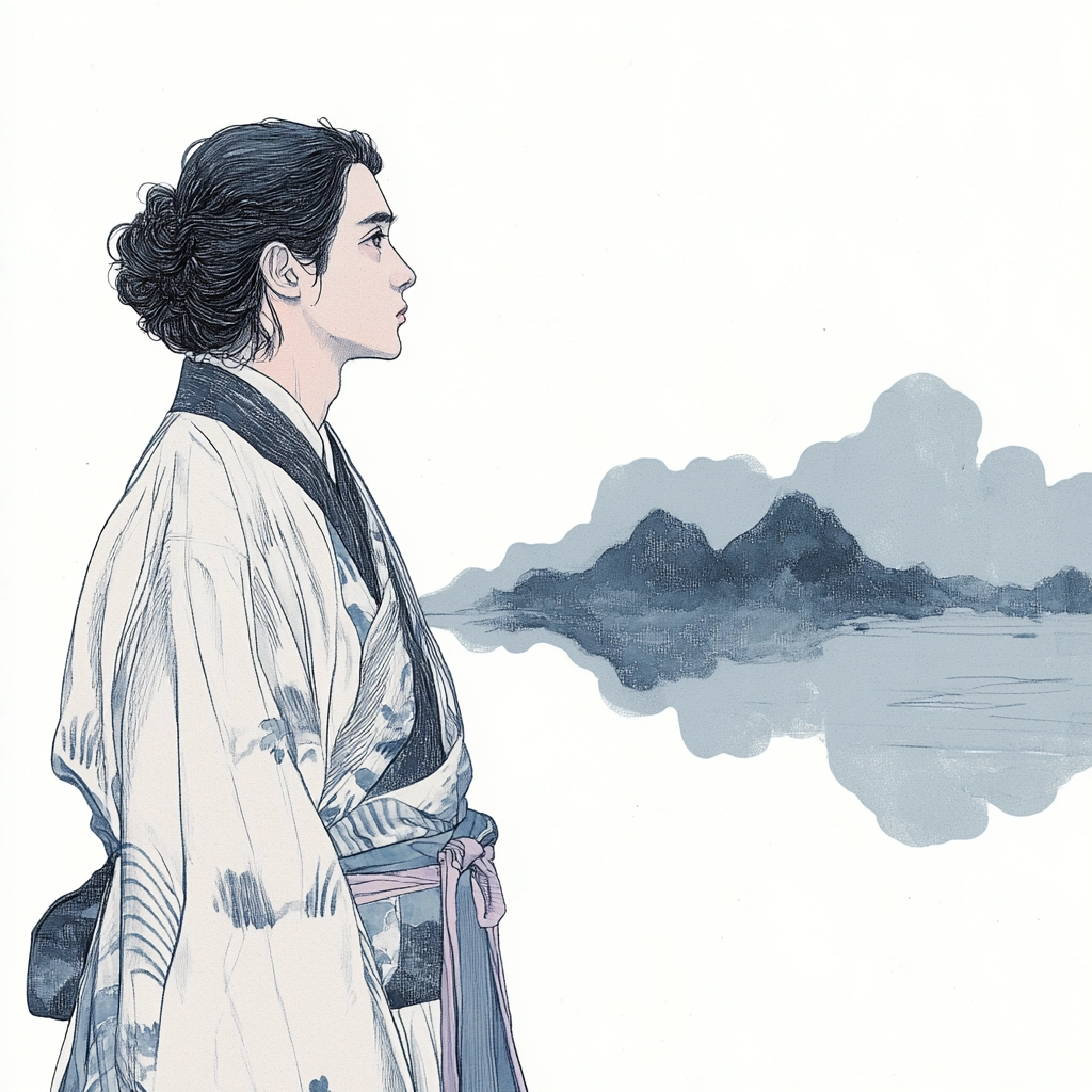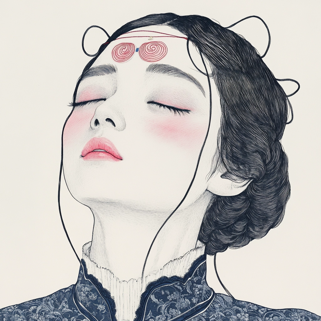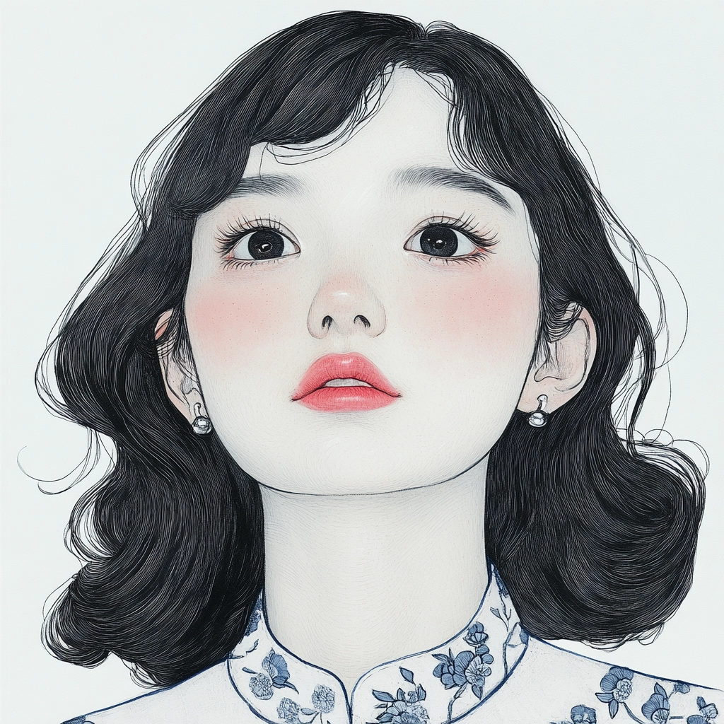 The subtle use of white creates a pure and calm backdrop, enhancing the delicate blue and red tones. Fine lines outline forms with precision, while the application of color is minimalistic, adding a gentle touch of texture. The composition maintains an airy sense of space and crisp clarity.