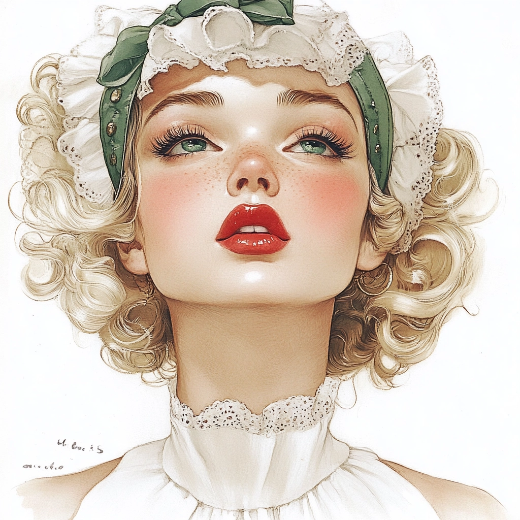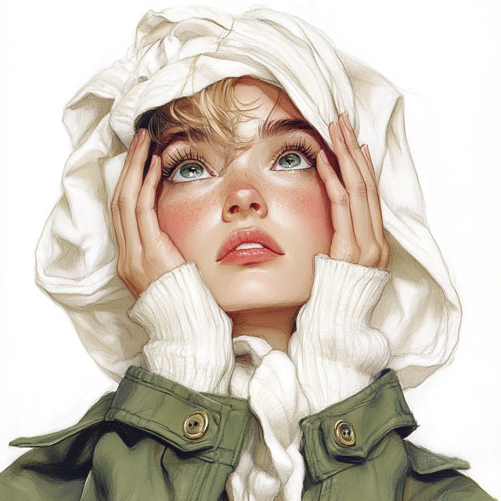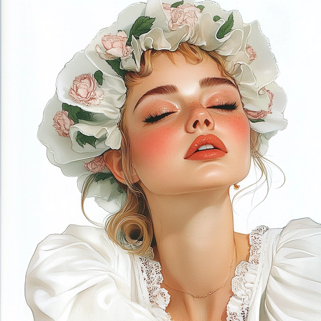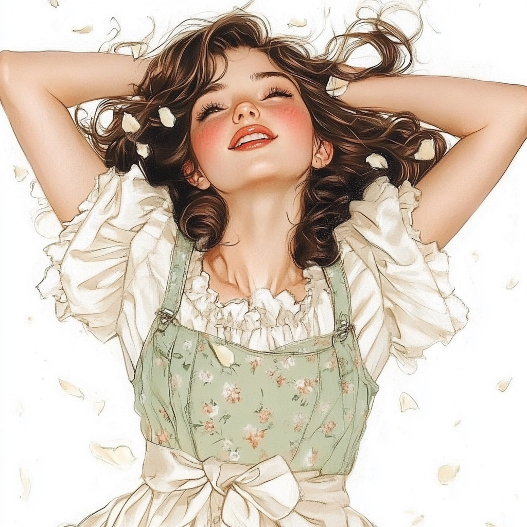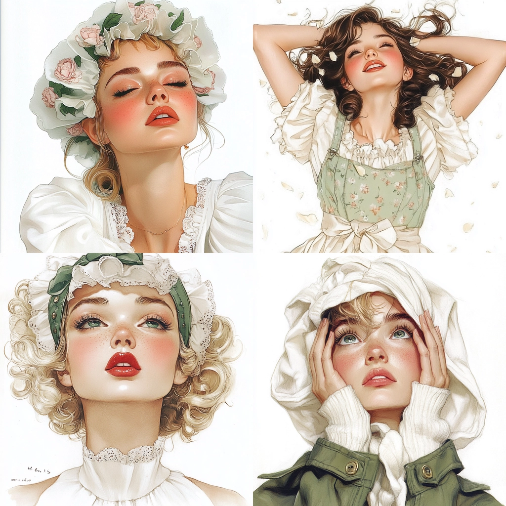 The artwork employs subtle lighting that accentuates a gentle blend of pastel colors like white and green, giving a calming spatial sense. The fine texture enhances the details of fabric and patterning, creating a smooth and soft visual treat.