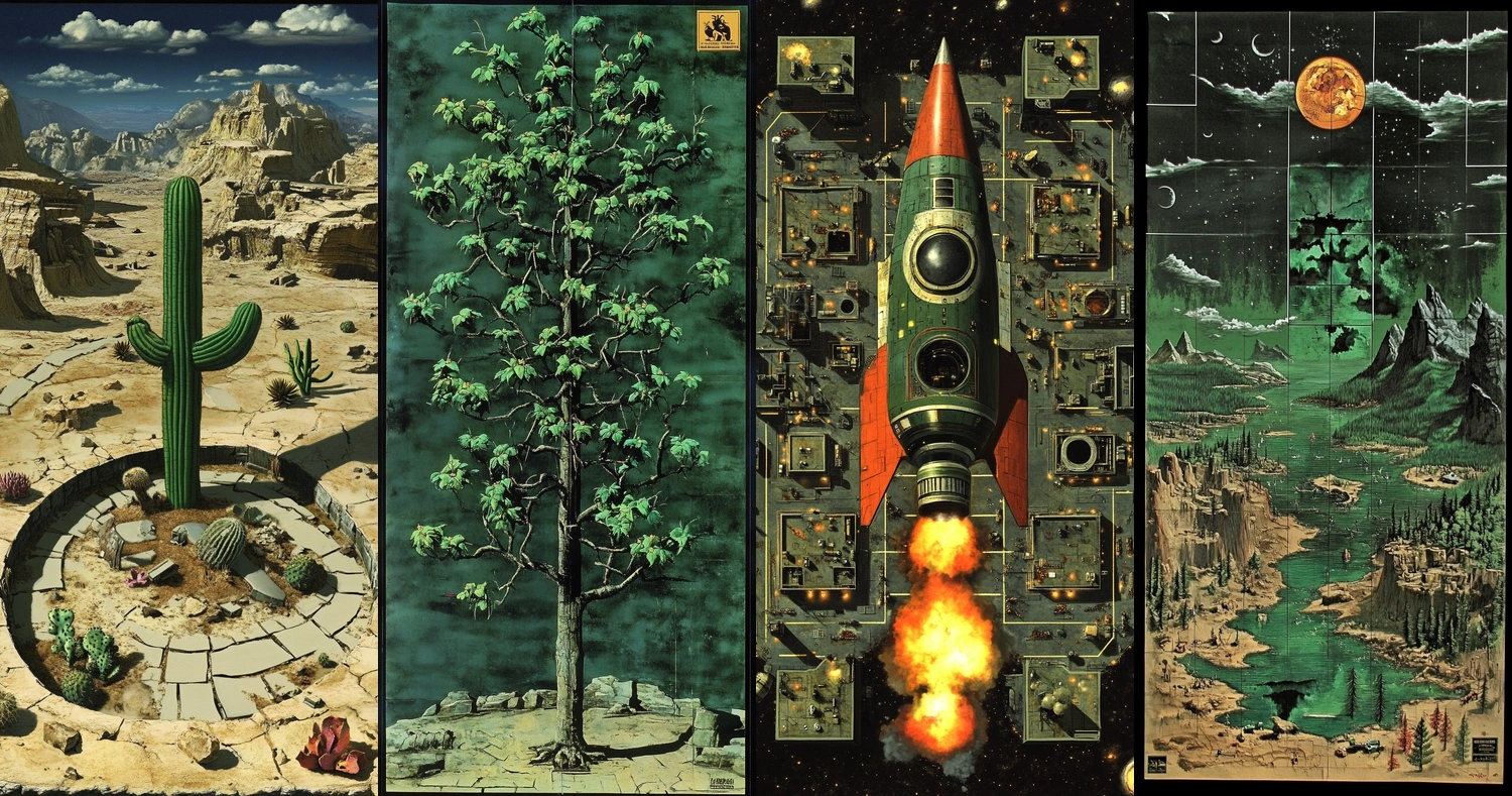 Strong lighting creates vivid contrasts between natural landscapes and futuristic objects, with colors showing a balance between earthy and bold. There is a high sense of depth and texture, with detailed representations enhancing the spatial qualities.