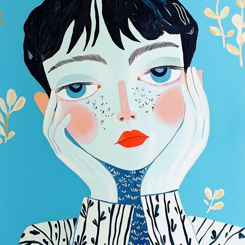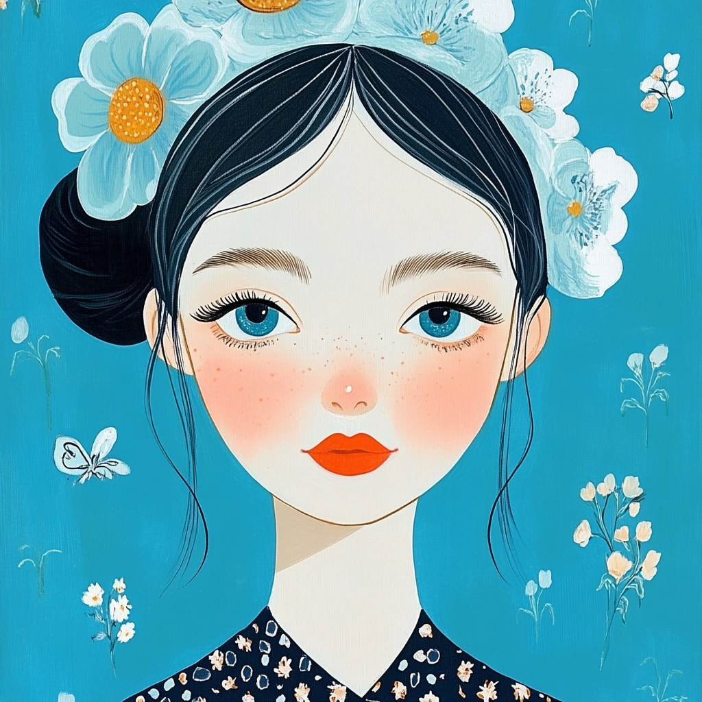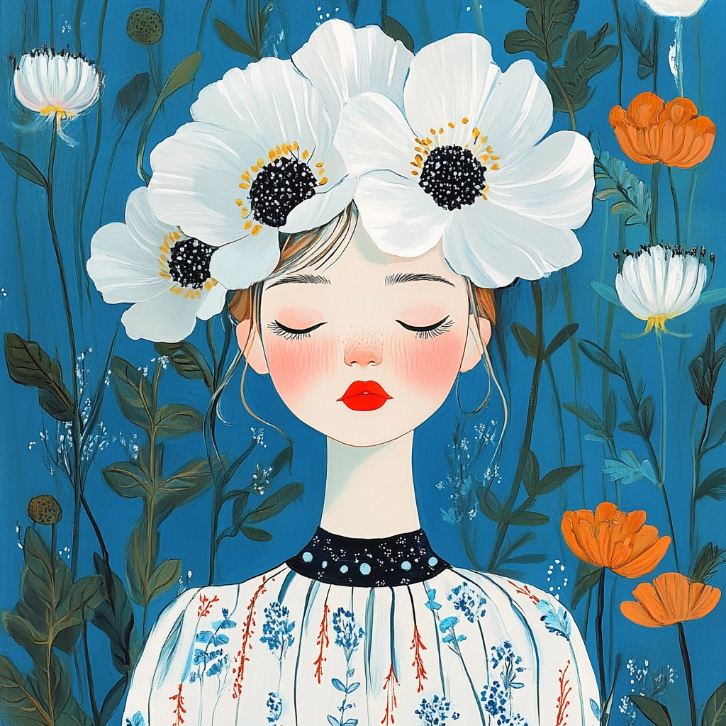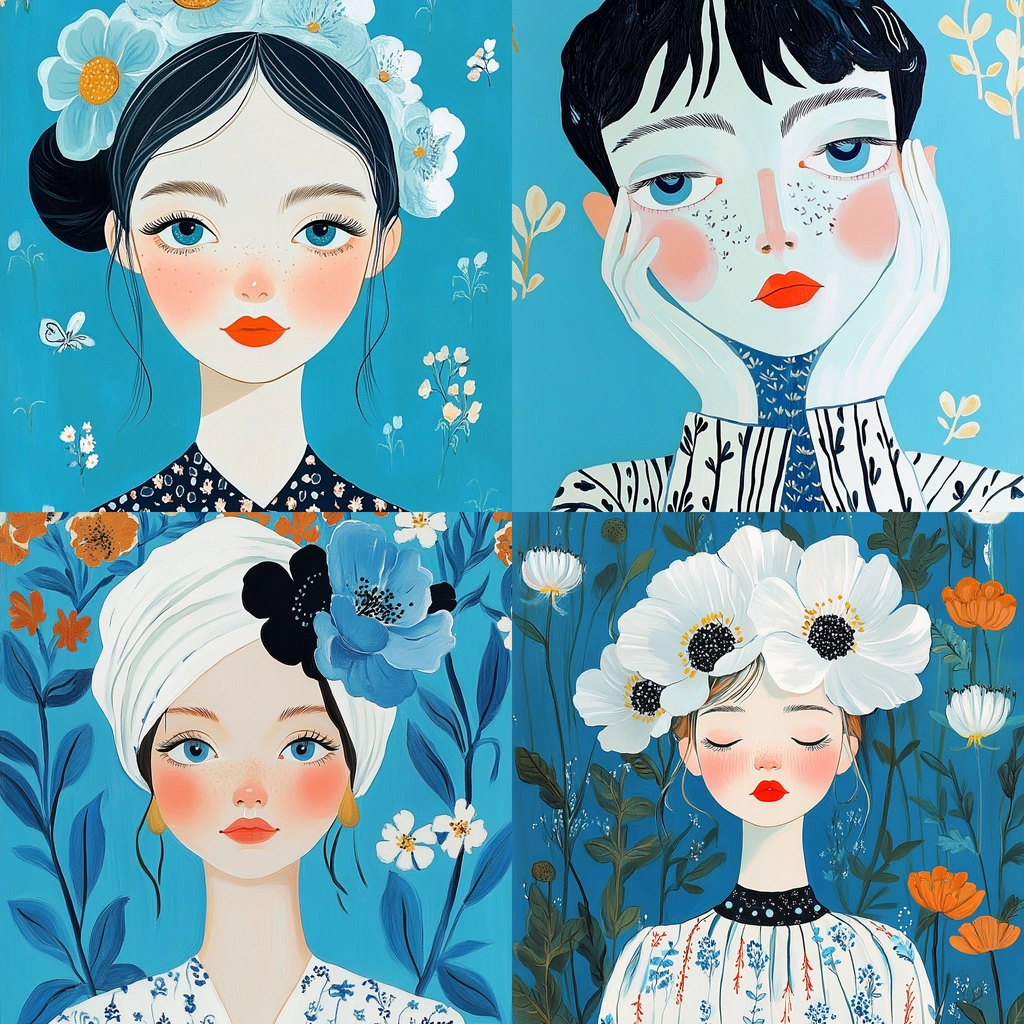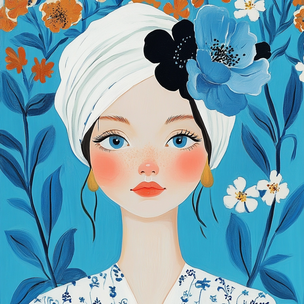 Features bold use of blue with white and orange highlights, creating a vivid foreground. The pattern-like textures enhance the spatial depth and complement the intricate floral motifs.