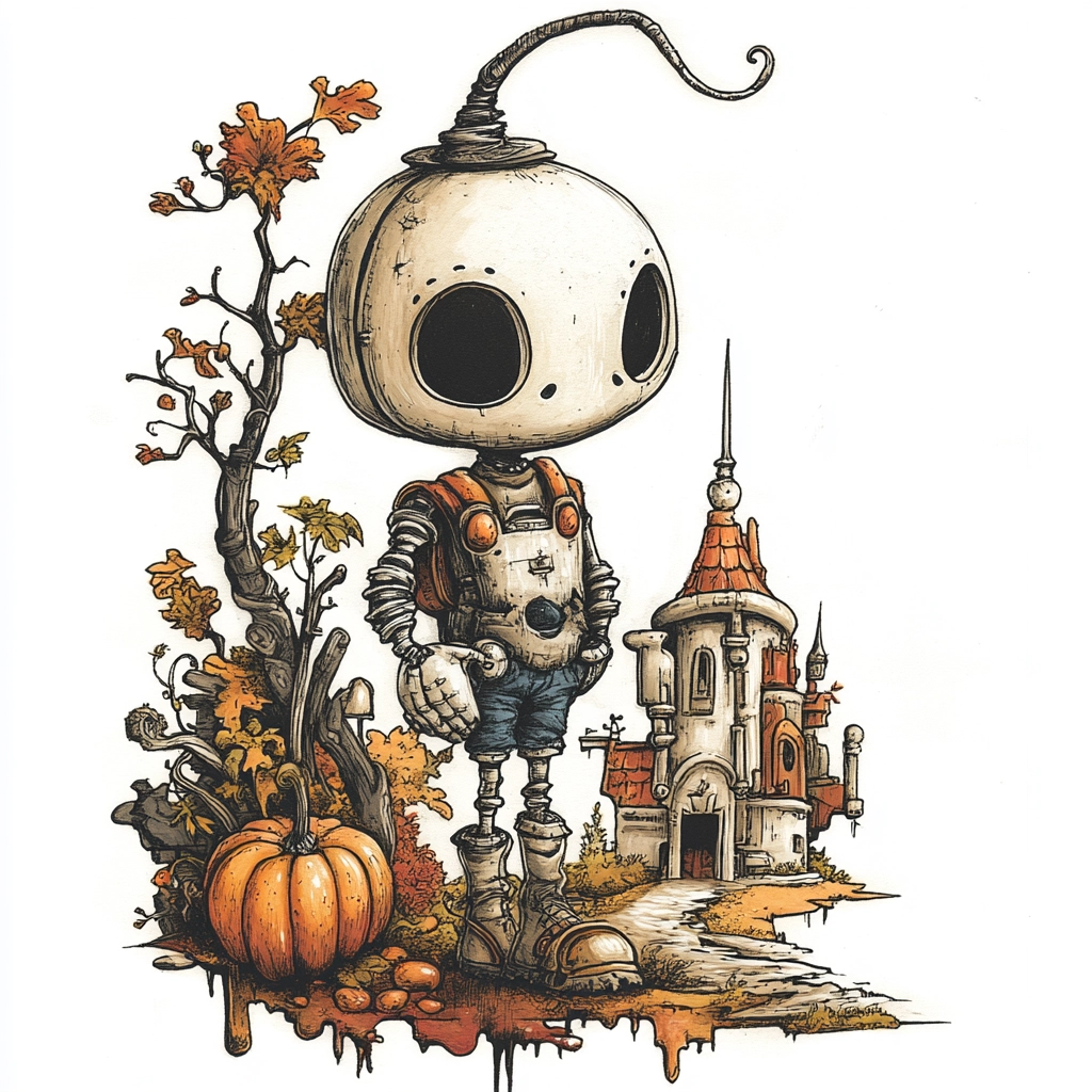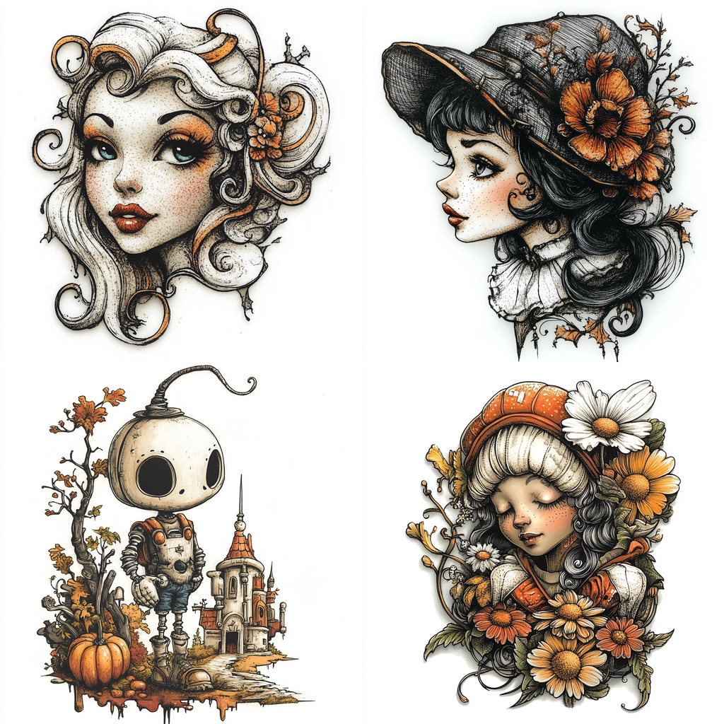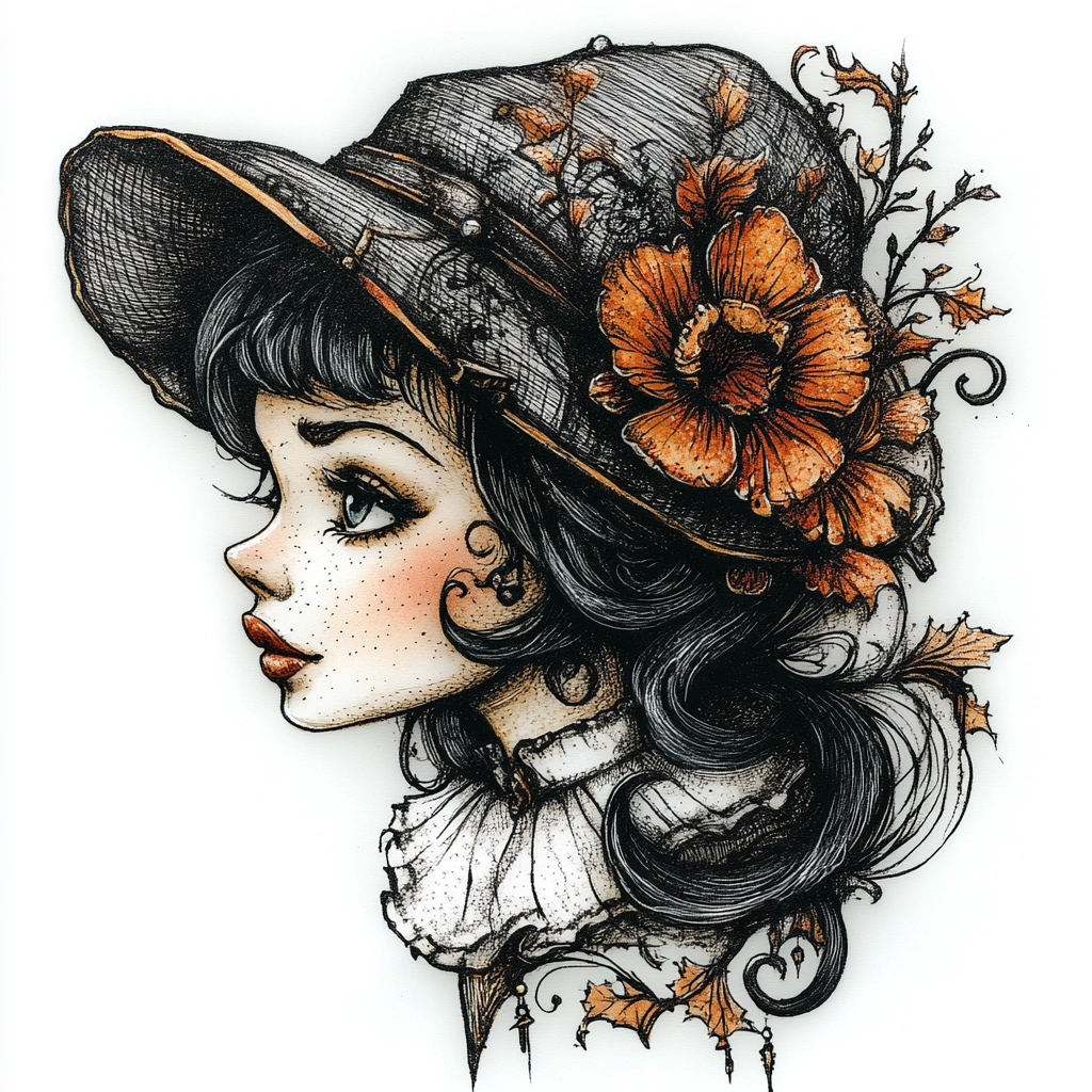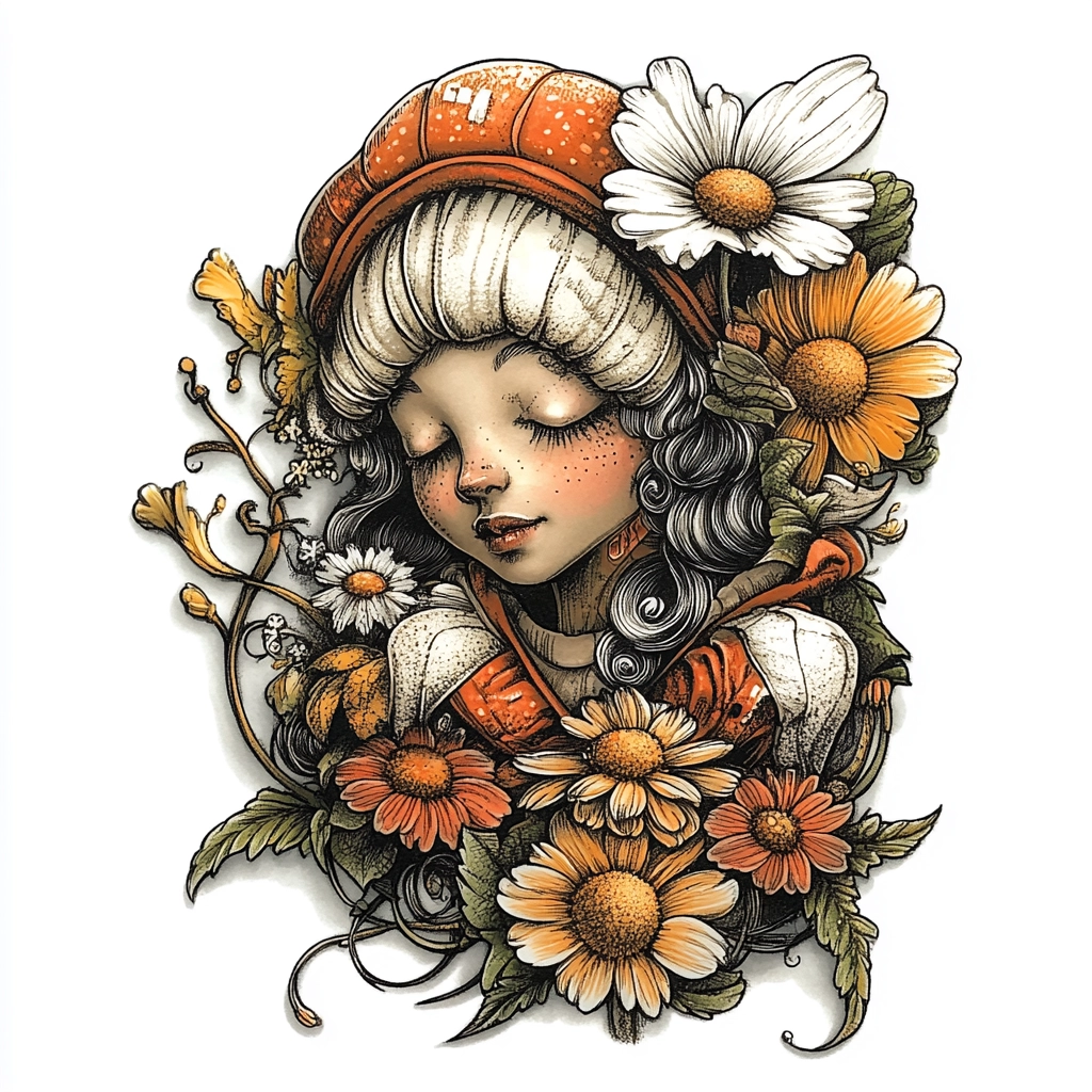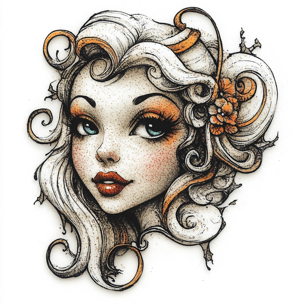 The use of contrasting black outlines highlights the intricate detail, with vibrant orange hues providing a lively pop against the delicate white and gray shading. Lighting is used to emphasize depth and texture, creating a vivid spatial arrangement.