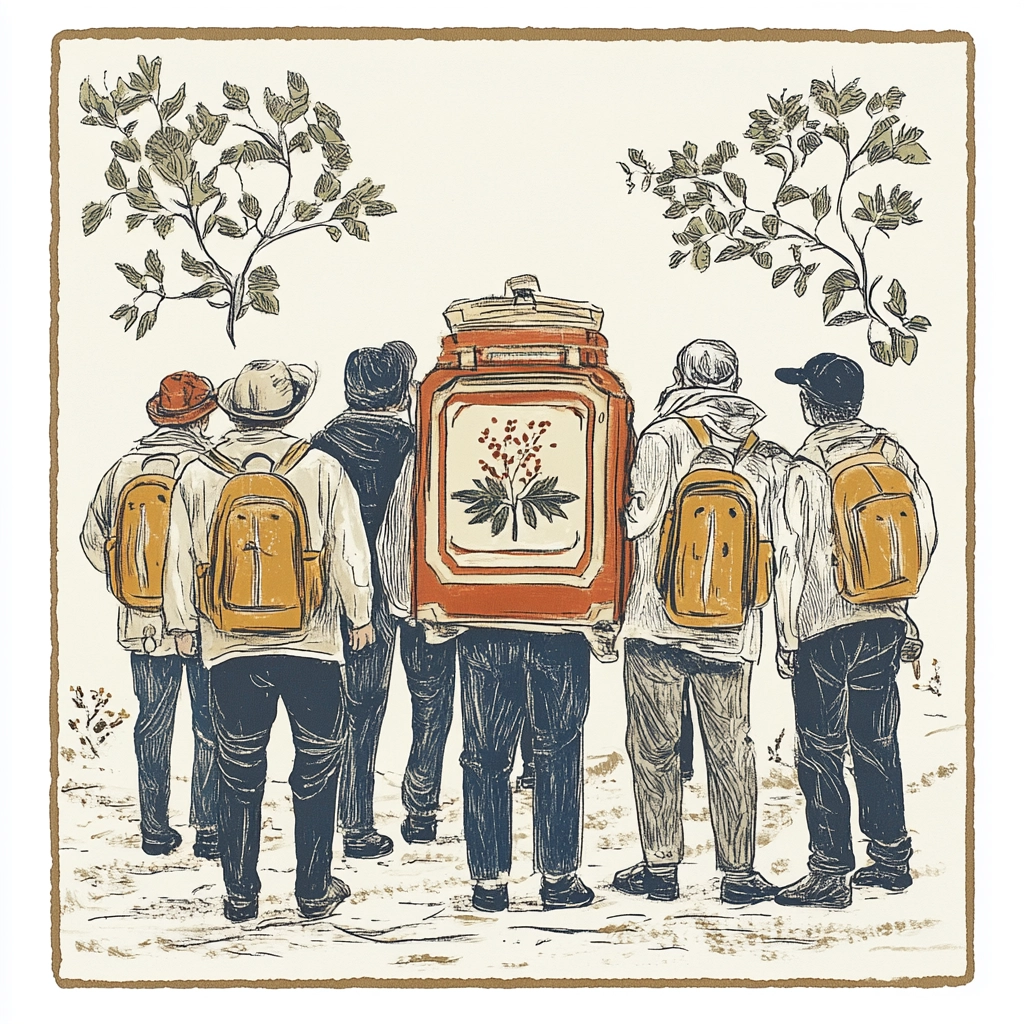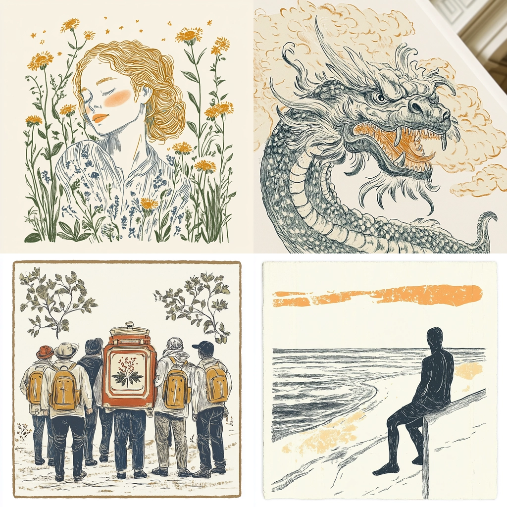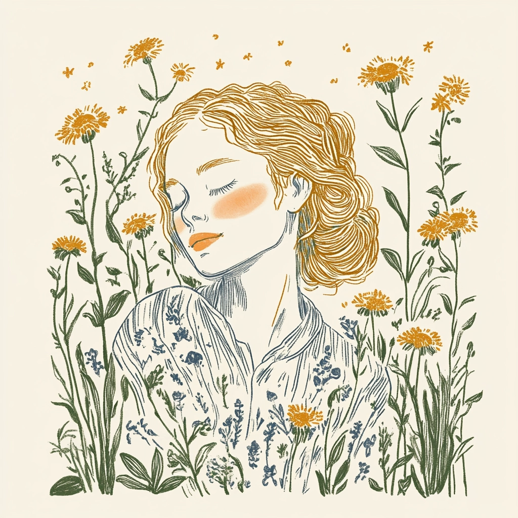 The lighting is natural and soft, enhancing the delicate details and textures in the linework. Colors are muted yet varied, contributing to a harmonious composition with a clear spatial depth and subtle shading.