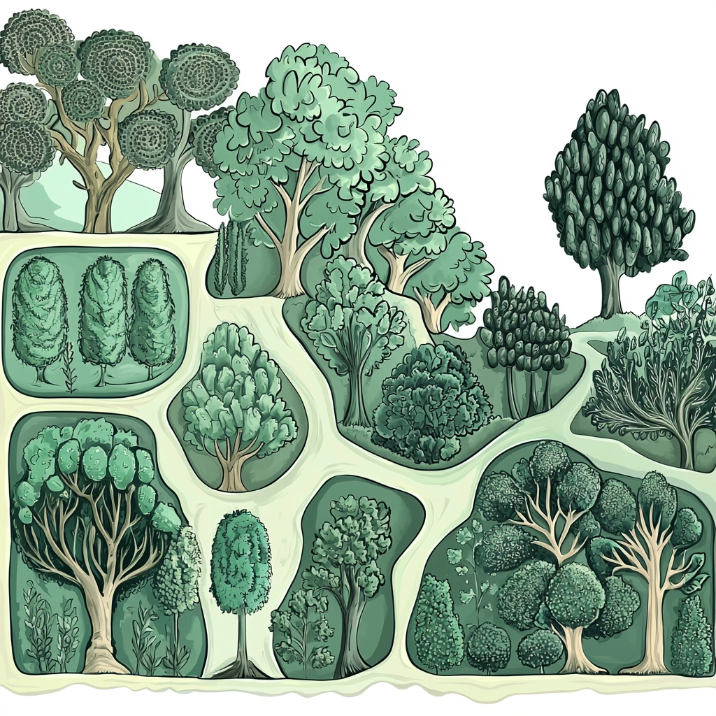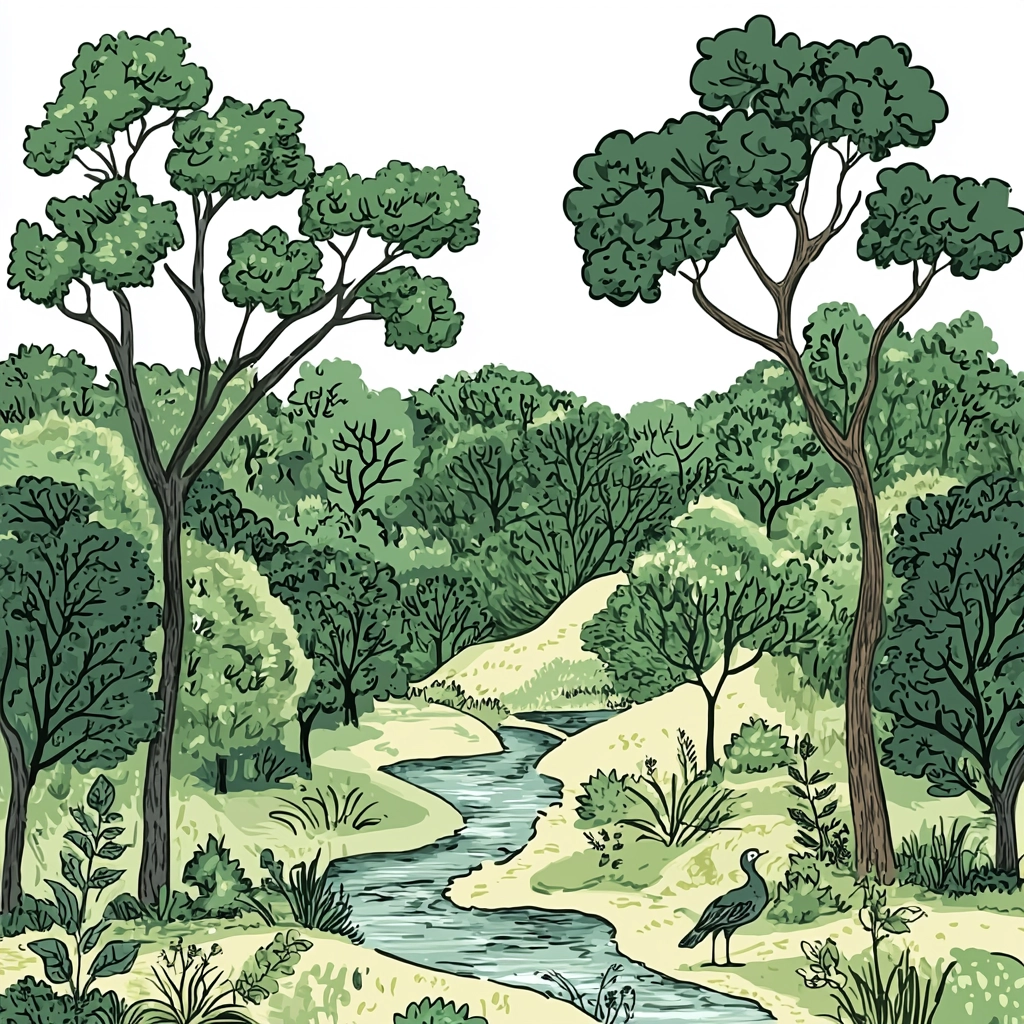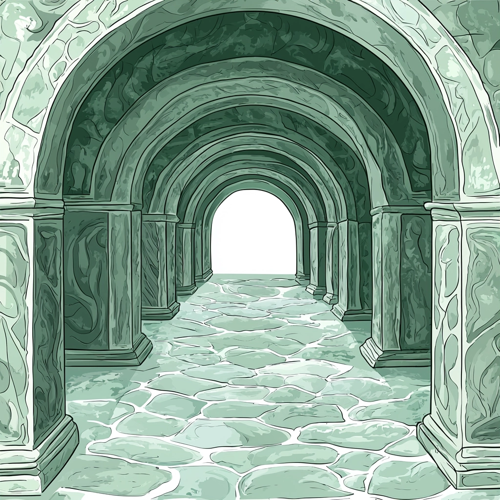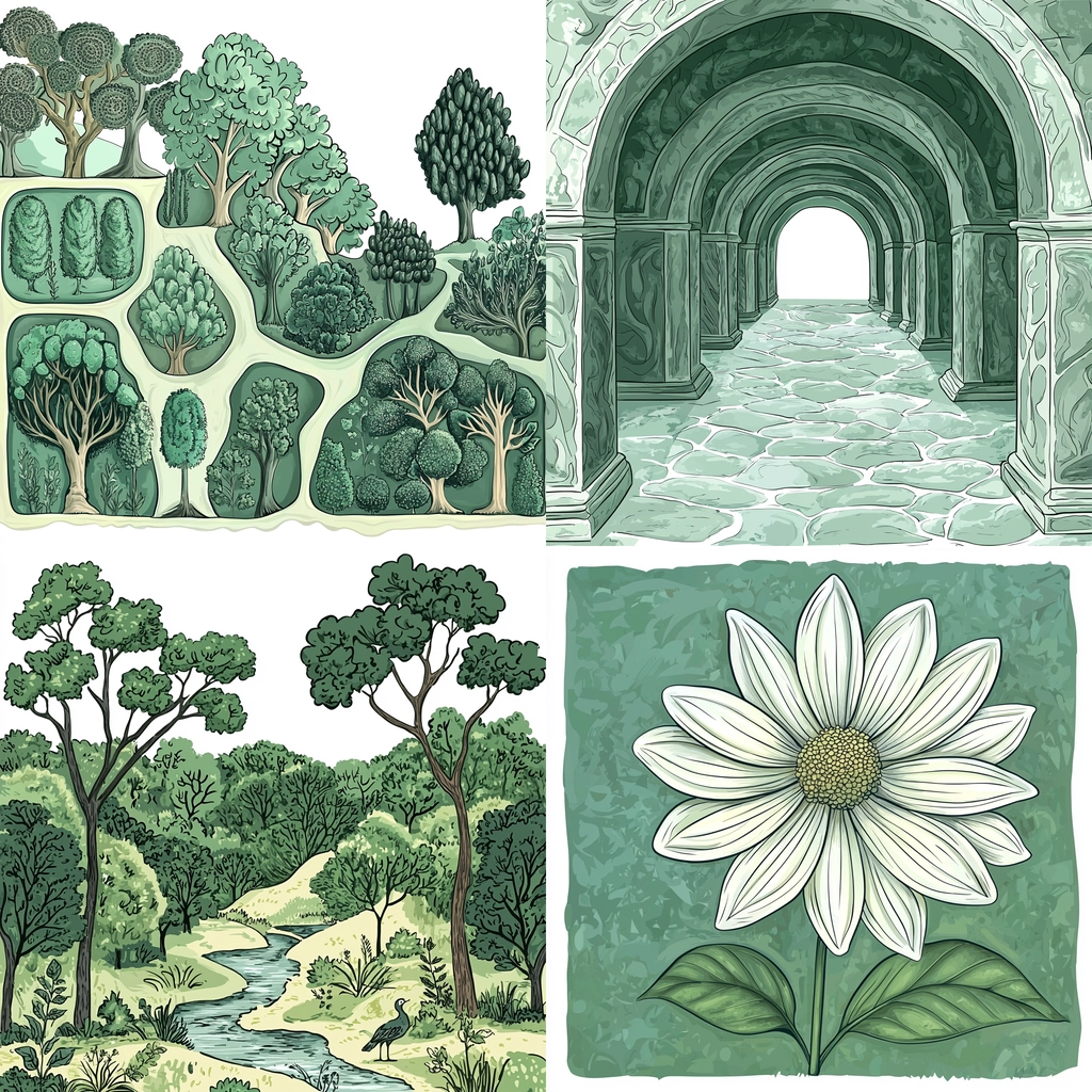 The lighting is evenly distributed, giving the scenes a flat, illustrative appearance. Shades of green vary from dark to light, enhancing the sense of depth within the space. The textures are meticulously detailed, revealing fine, crisp lines that define each element distinctly.