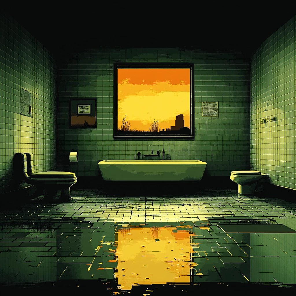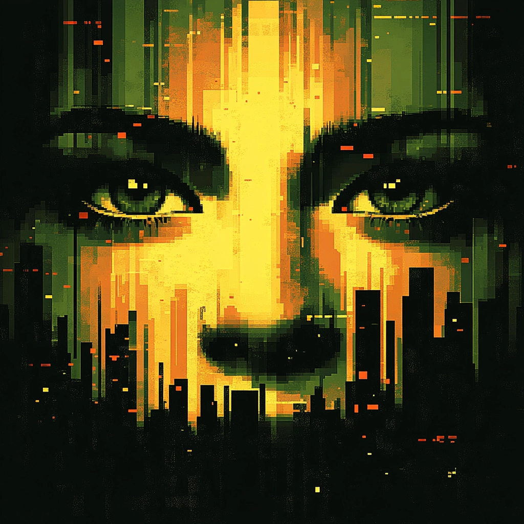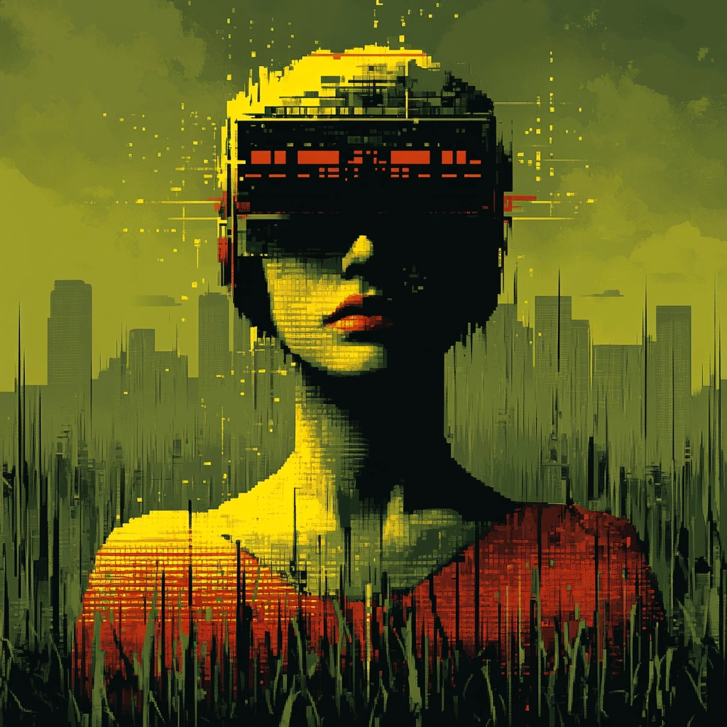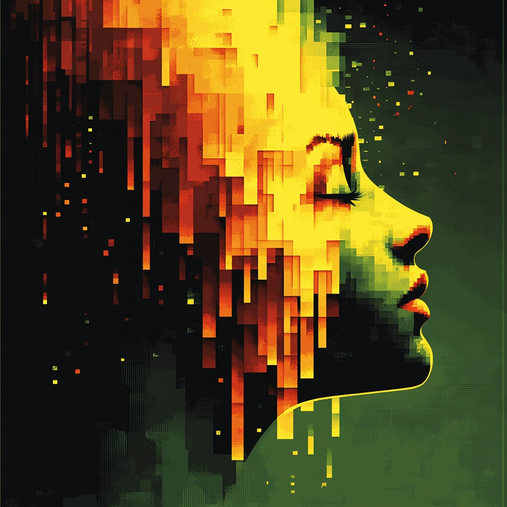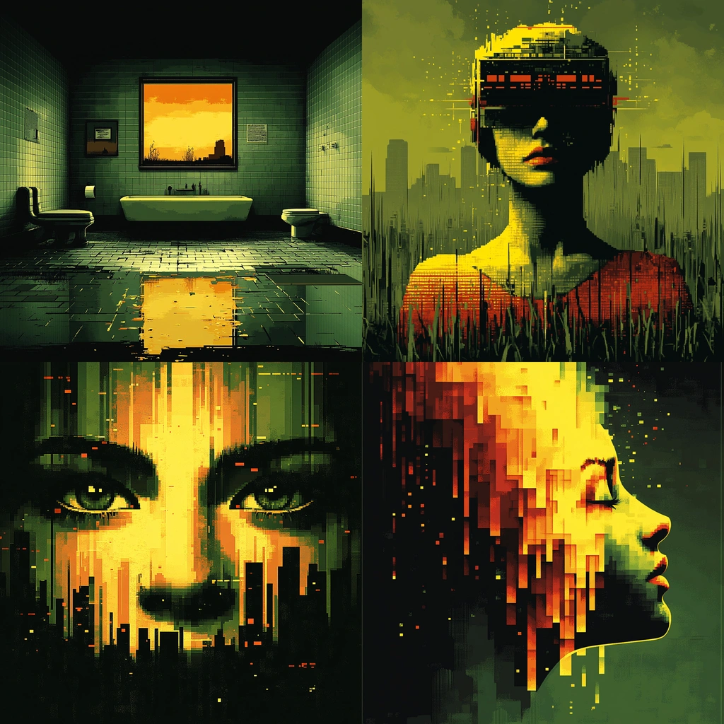 Lighting offers a contrast between bold blocks of color and reflective surfaces, creating depth. The pixelation provides a textured overlay, enhancing spatial awareness and variation in gradient tones.